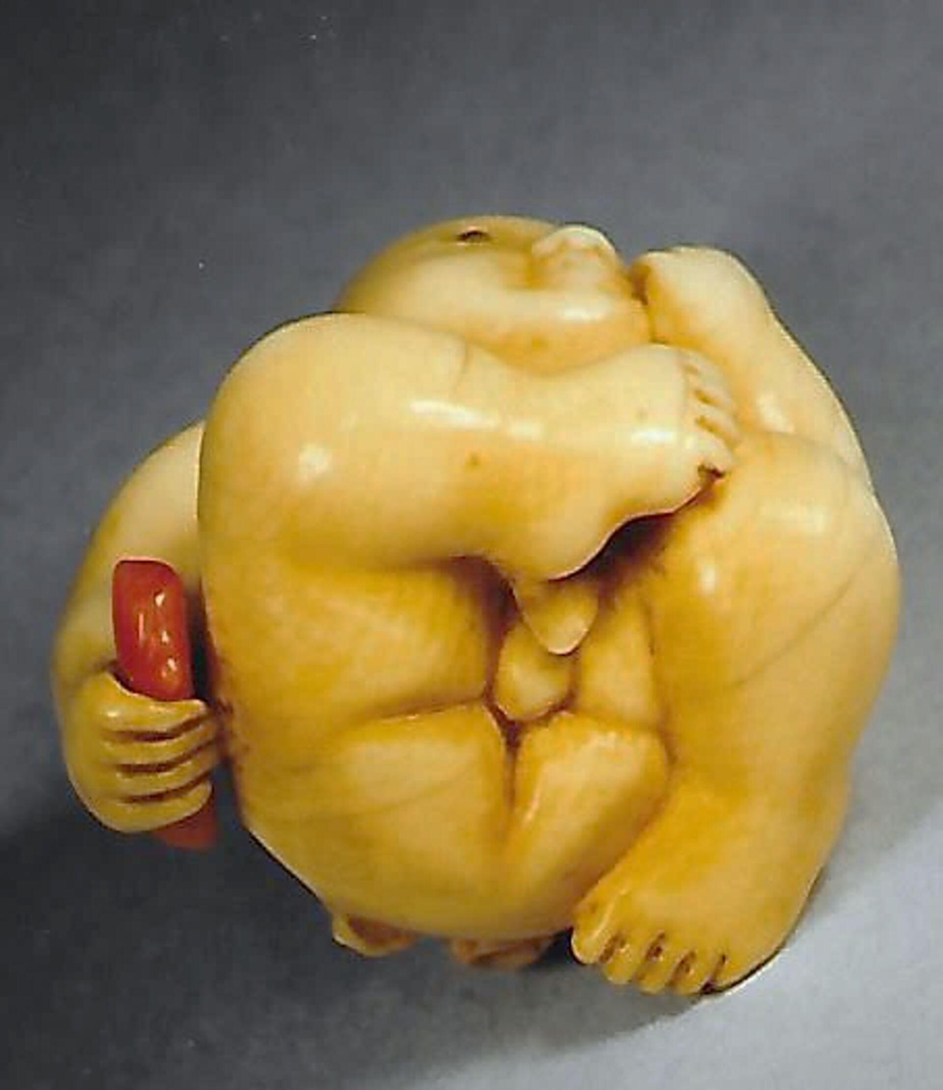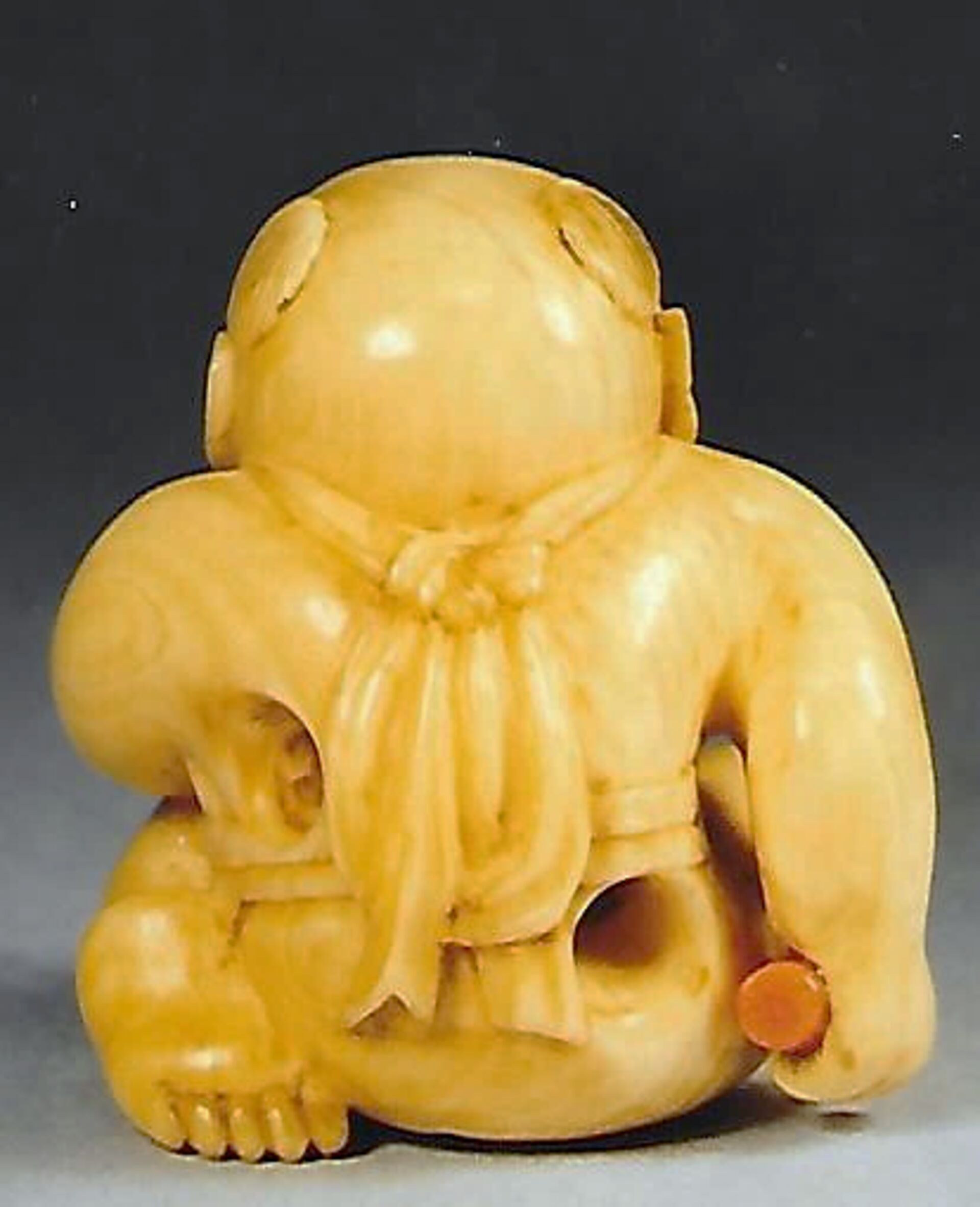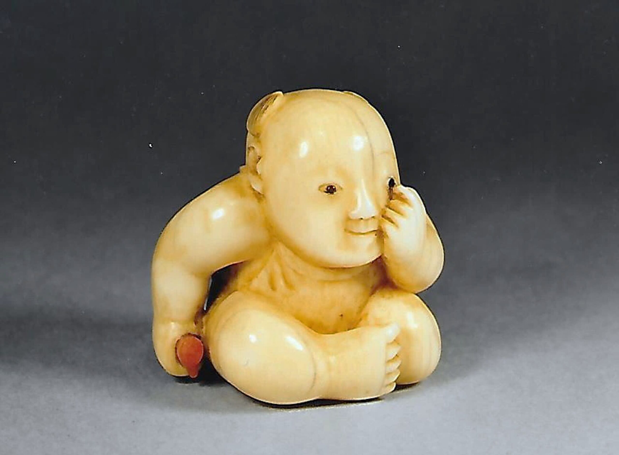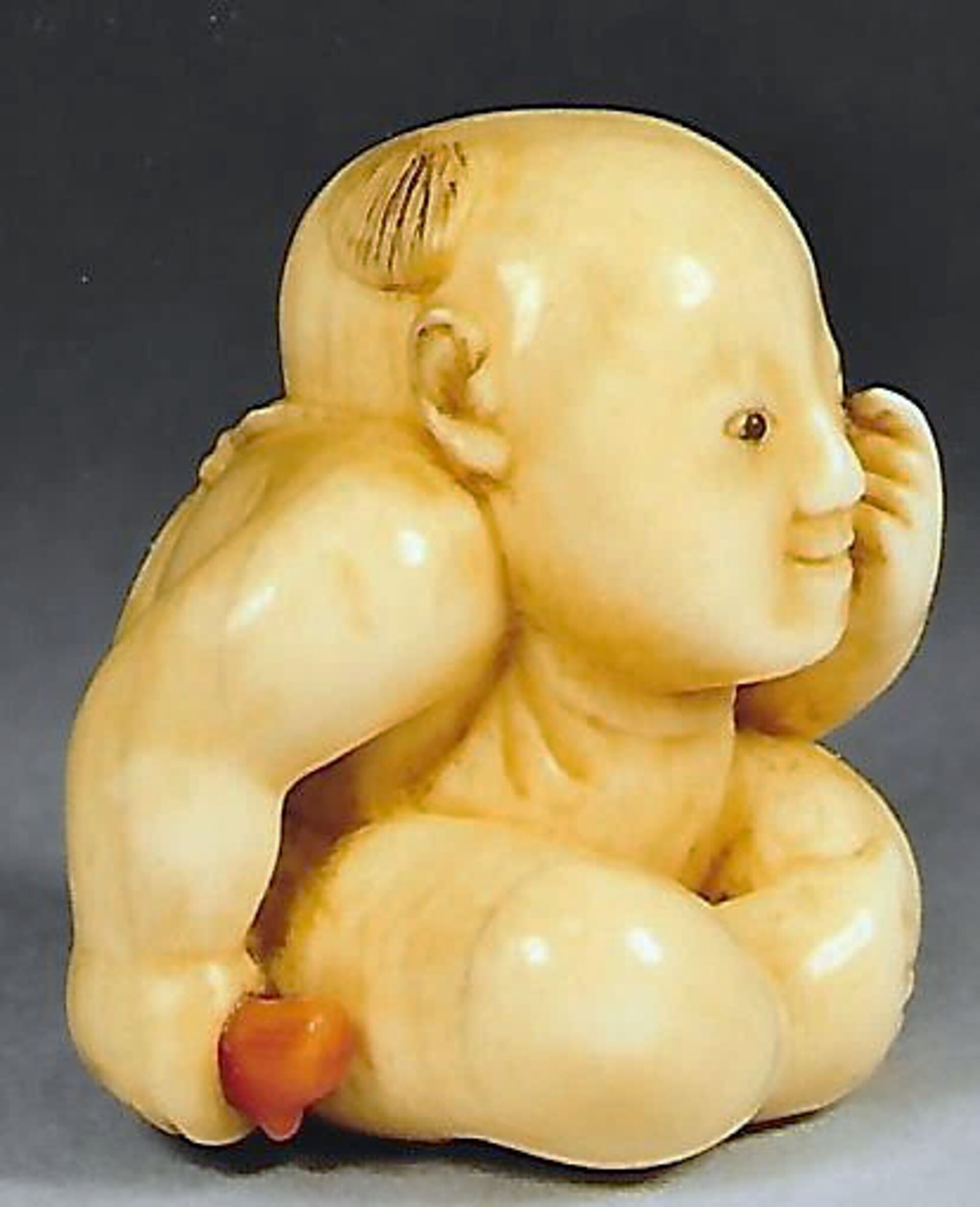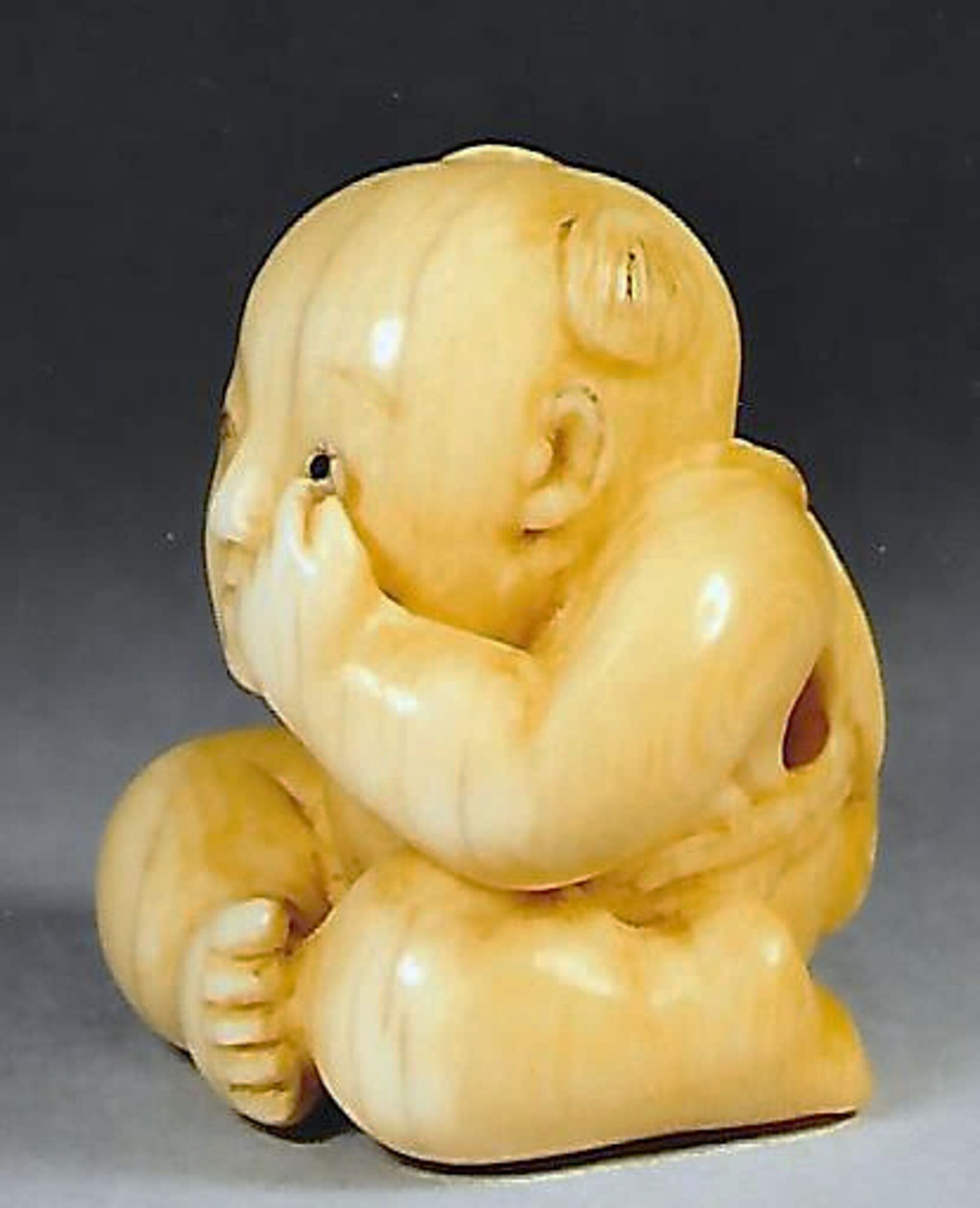 Elfenbein-Katabori. Der sitzende Babyknabe, an den beiden Haarbüscheln Agemaki über den Ohren erkenntlich als chinesischer Knabe und durch sein Genitale zweifelsfrei als männlichen Geschlechts gekennzeichnet, sitzt, bekleidet mit bloss einem Lätzchen, das hinten mit einer schönen Masche gebunden ist. Sein Gesichtsausdruck ist wissend, fidel und etwas undurchsichtig. In der Rechten Mit er ein Stück Koralle, mit dem linken Zeigefinger zieht er das linke untere Augenlid hinunter., eine Geste, die japanisch Bekkako heisst und so viel sagen will wie „denkste”, „das bildest du dir wohl ein”, „da bist du schön hereingefallen”. Es bleibt freilich unklar, was der Inhalt der List des kleinen Jungen ist. Hat er die Koralle entwendet und will sie nicht zurückgeben?. – Höhe 28mm, leicht gefärbt, etliche Alterssprünge, gut gebohrte Himotoshi im Rücken. Alter: ca. um 1900.
