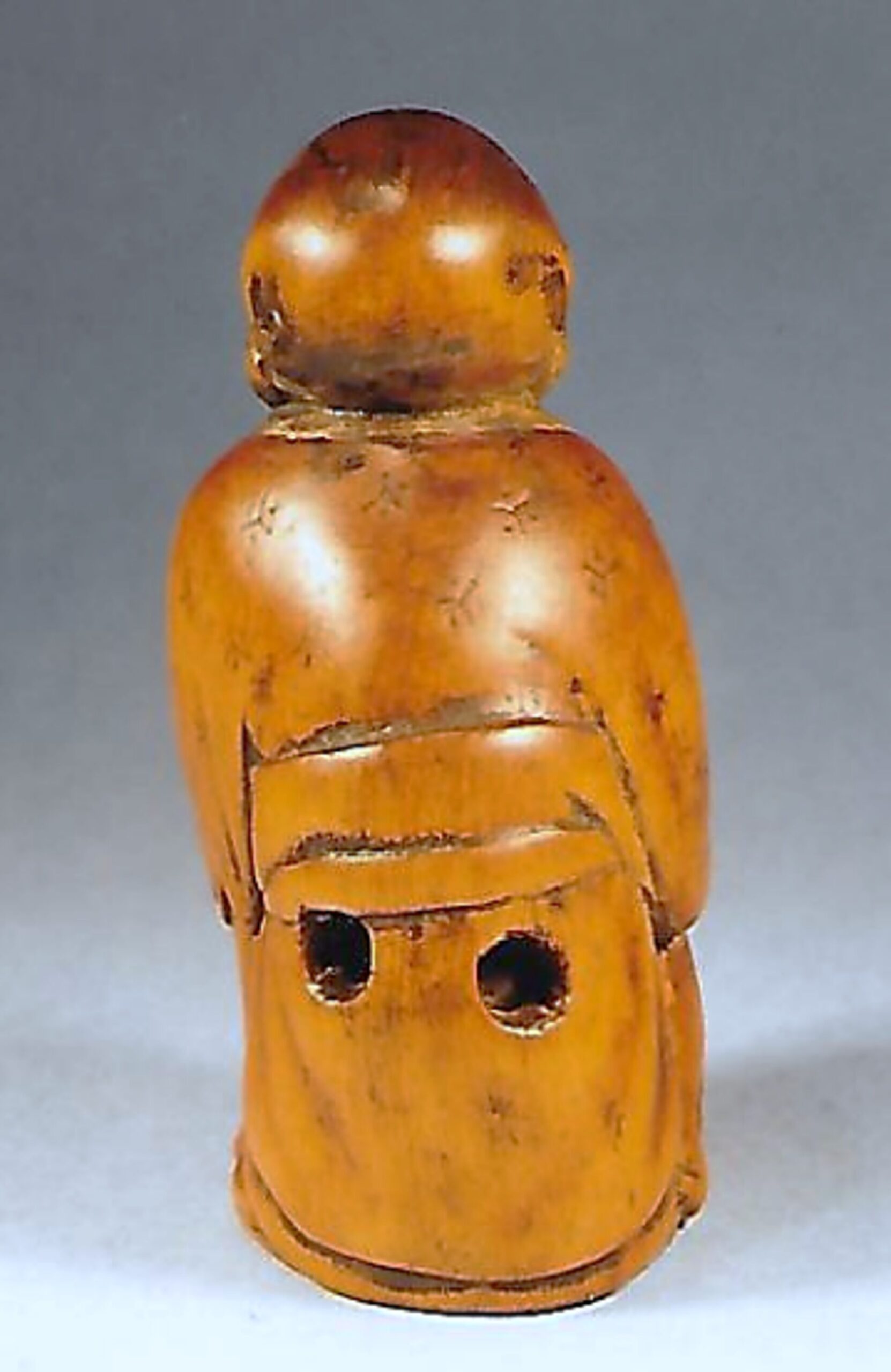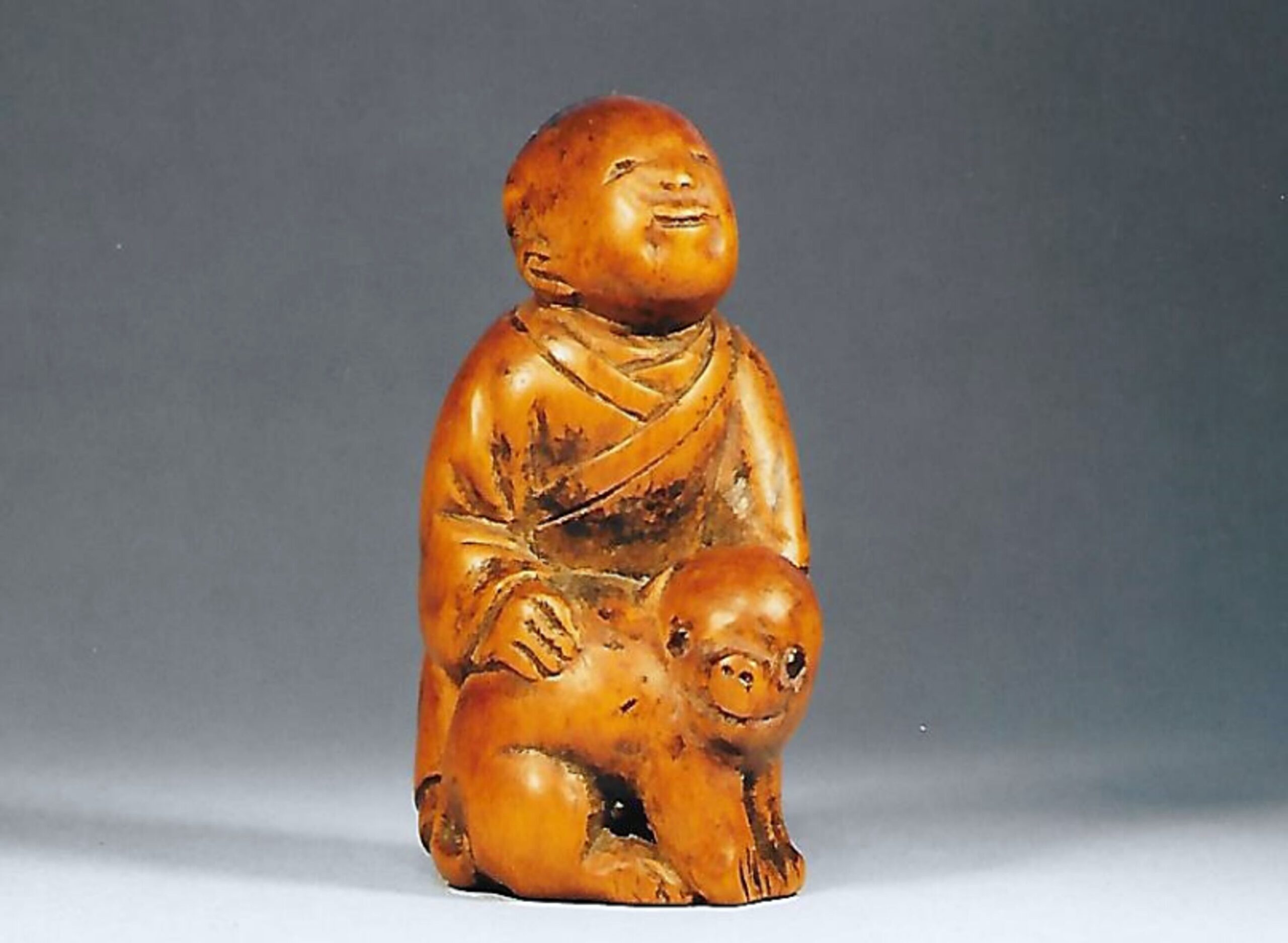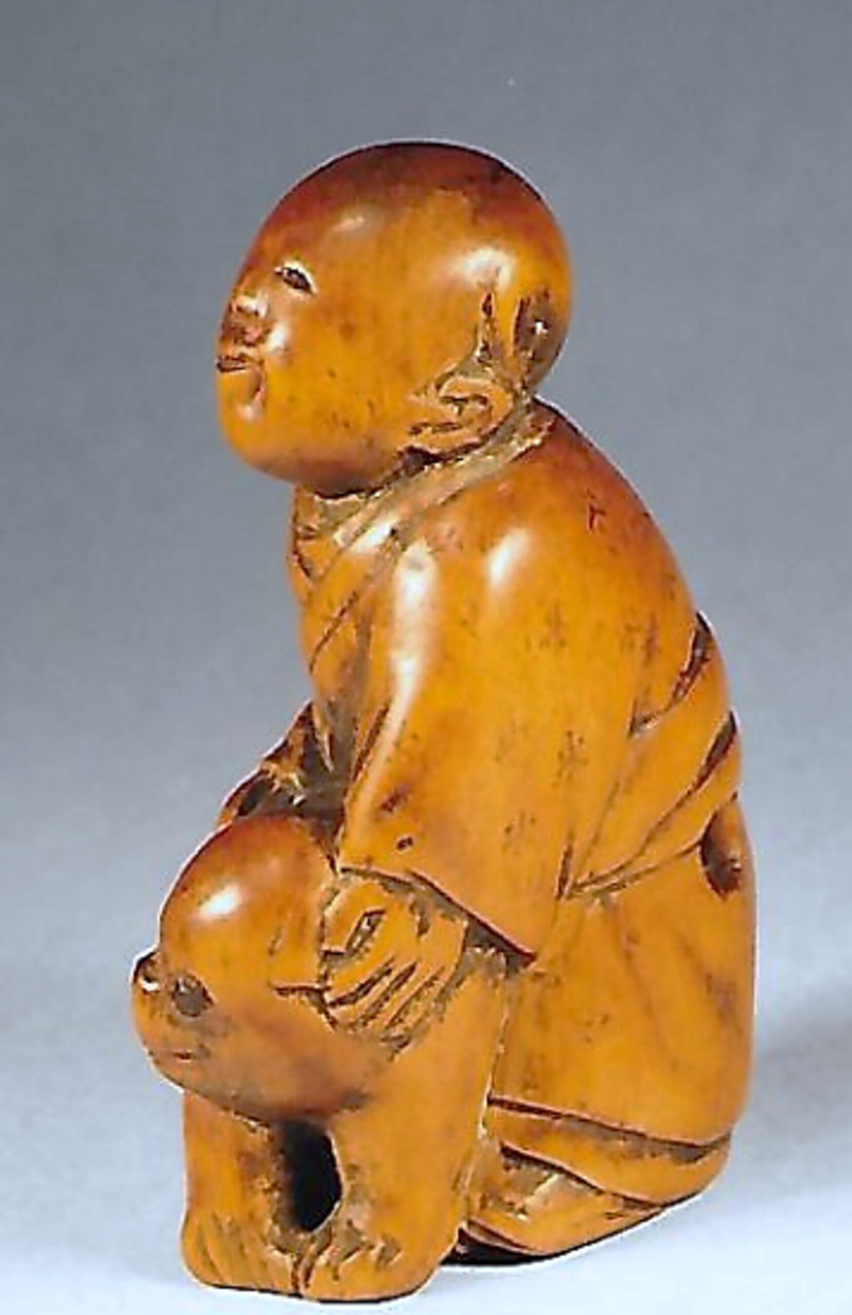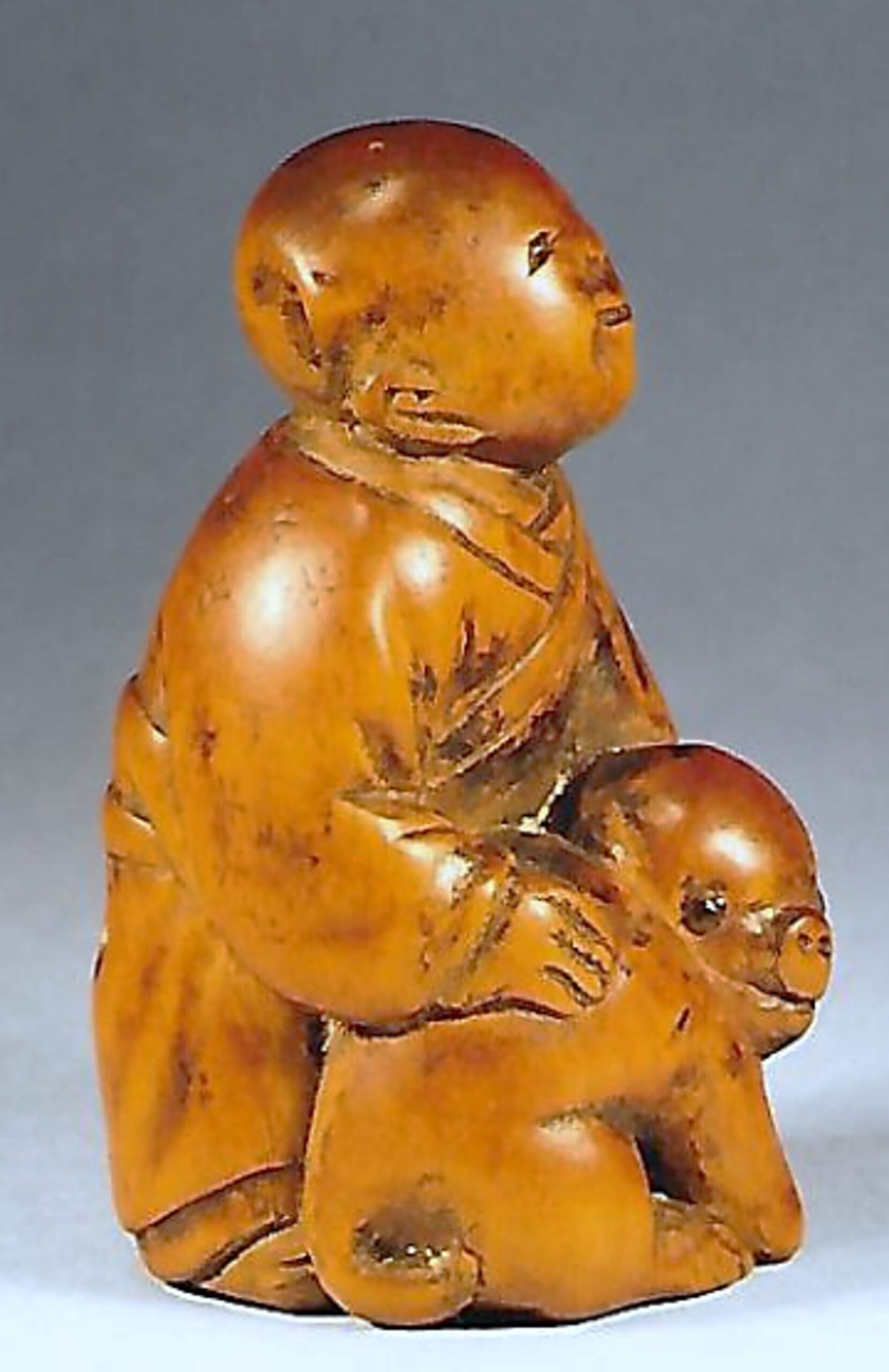 Buchsbaum-Katabori, Höhe 46 mm. Der chinesische Knabe (Karakô) ist zu erkennen an den Haarbüscheln über den Ohren. Er steht, leicht vorgeneigt, gekleidet in einen Kimono mit feinem Dekor, blickt freundlich und ausdrucksvoll nach oben und hält mit beiden Händen vor sich einen rundlichen, an ein Schweinchen erinnernden witzigen Hund, dessen Augen in dunklem Horn eingelegt sind. Gut abgegriffen, Alterspatina, Himotoshi mit Gebrauchspuren im Rücken. Unterseitig auf der rechten Schuhsohle die Signatur: TOMOCHIKA (K179, K289).