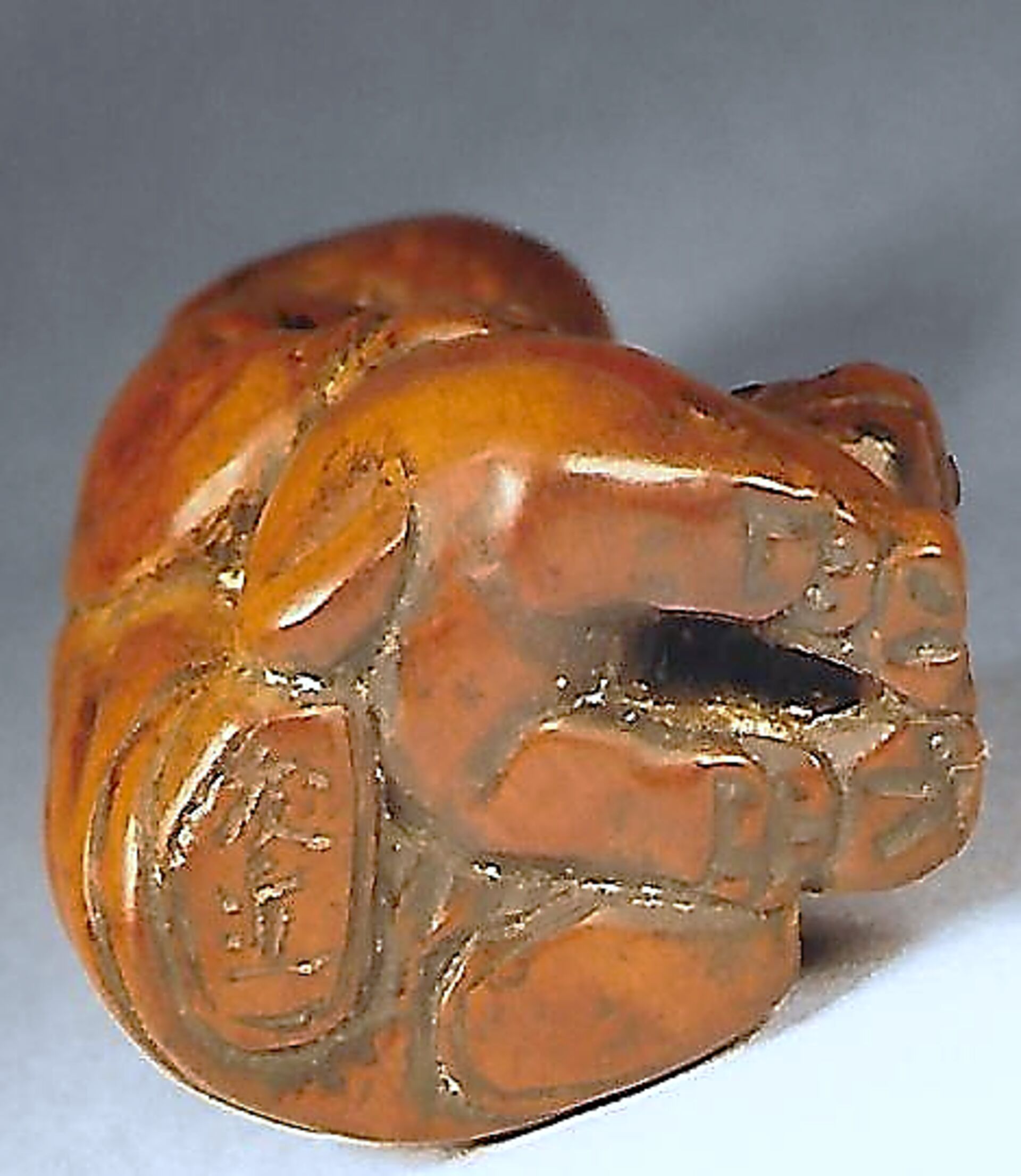 Meinertzhagen MCI, S.893 schreibt: TOMOCHIKA, GYOKUSEN (-SAI). Sotetsu Yamamoto. Pupil of Shominsai Tomotada, but moved later from Kioto to Tokio. Worked during latter part of 18th century and early 19th century. 24 ‘netsuke’ recorded, of which 23 in wood (3 ebony), and one ivory…Giokusen Tomochika (not to be confused with Chikuyosai Tomochika who migrated from Kioto to Tokio at about the same time [und dessen —chika K484 ist. F.L.) was an artist of exceptional ability whose work has not received the attention from collectors that it deserves…