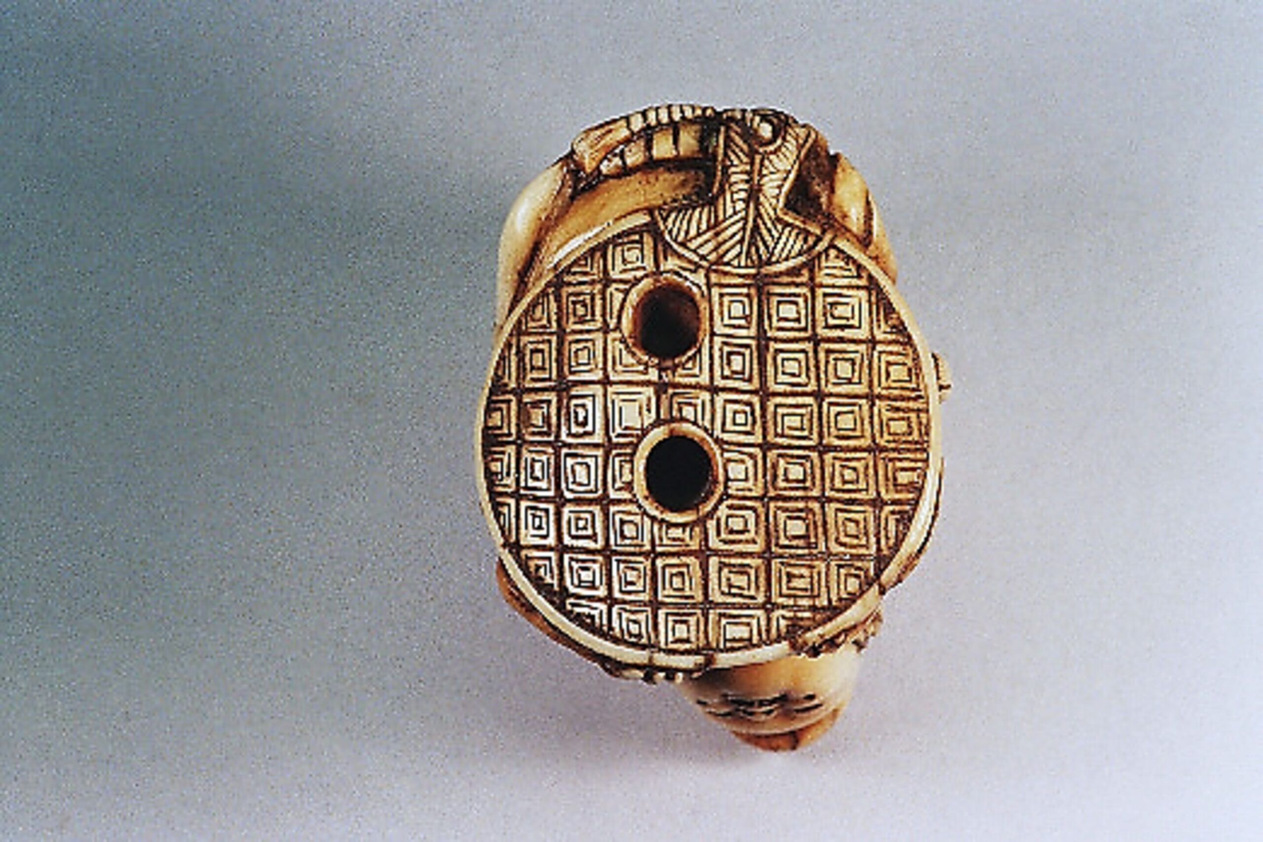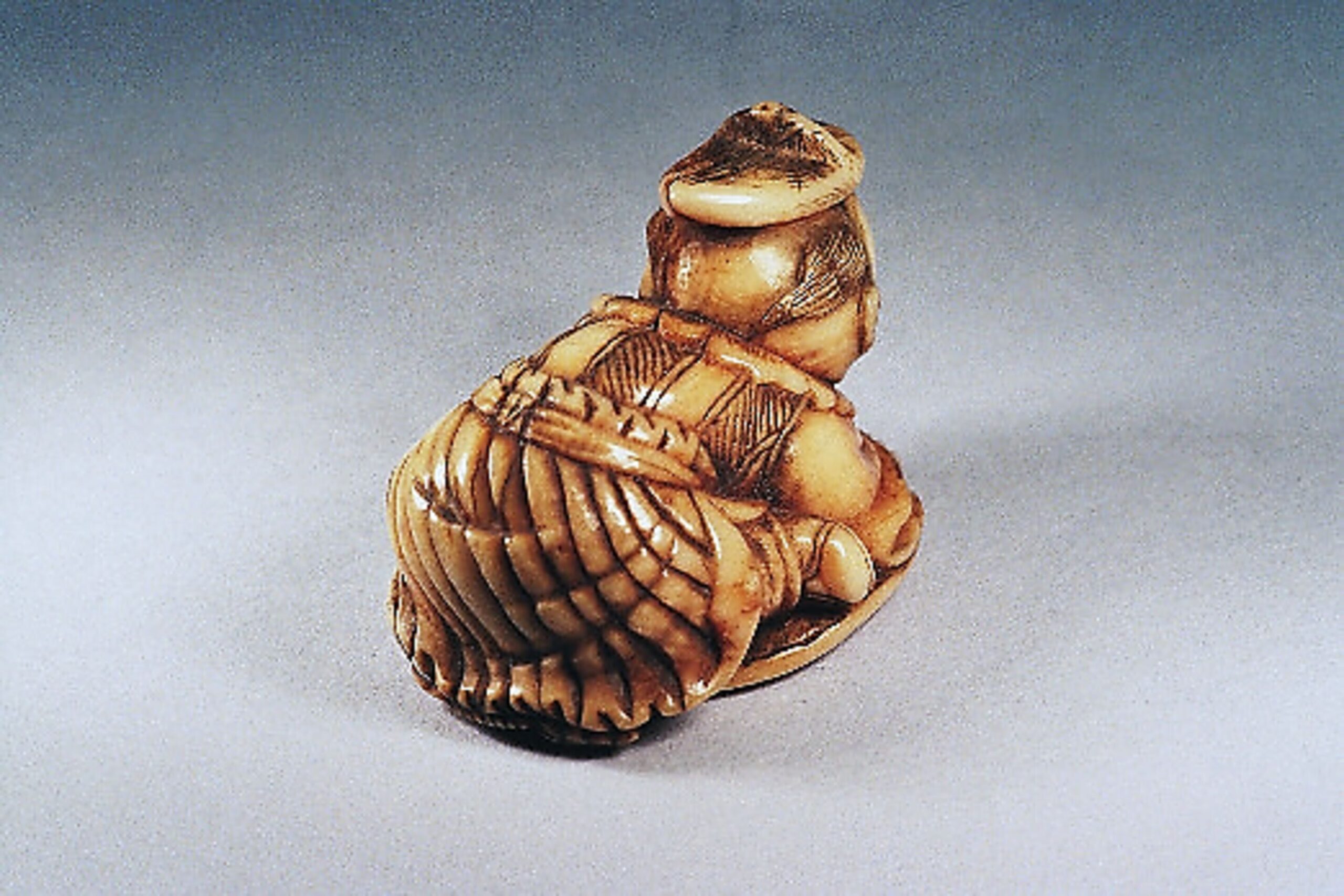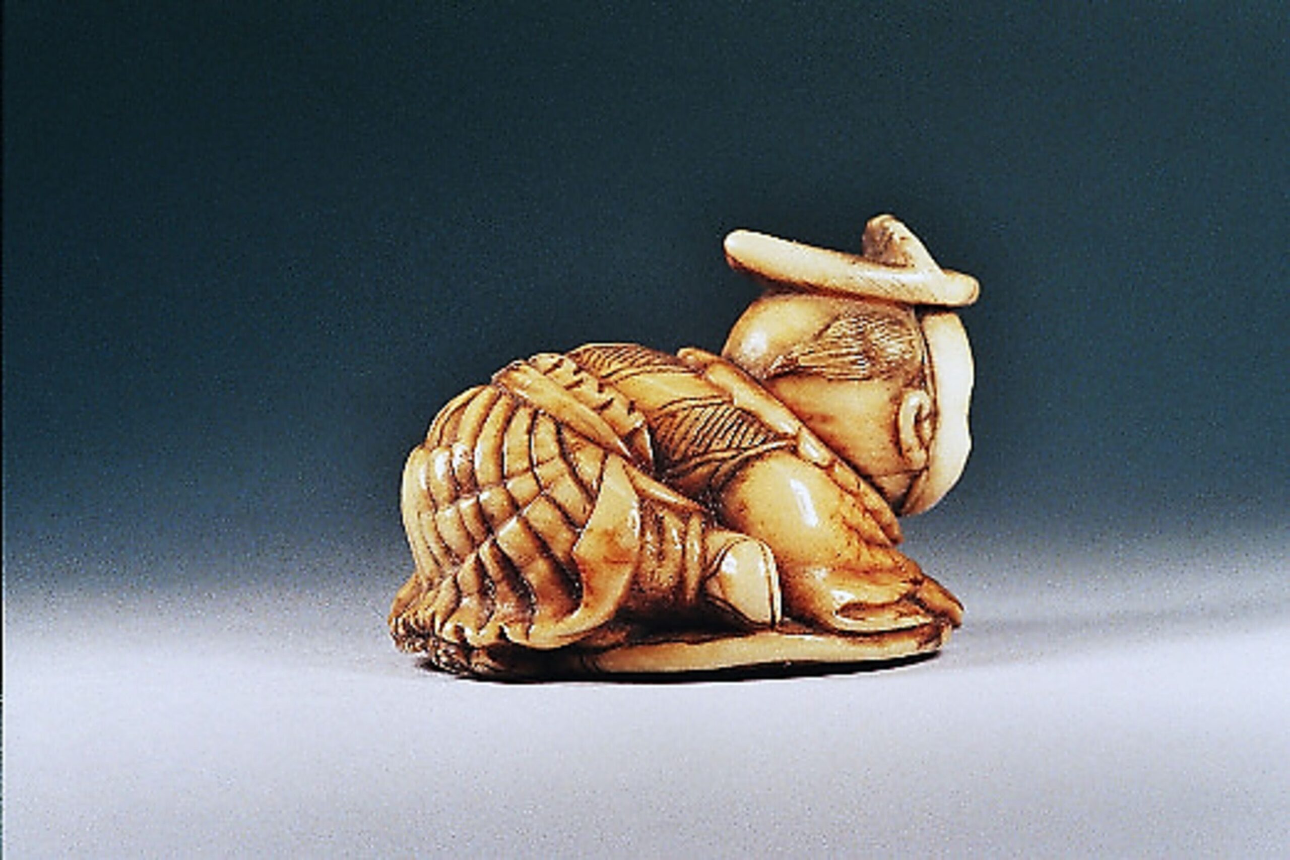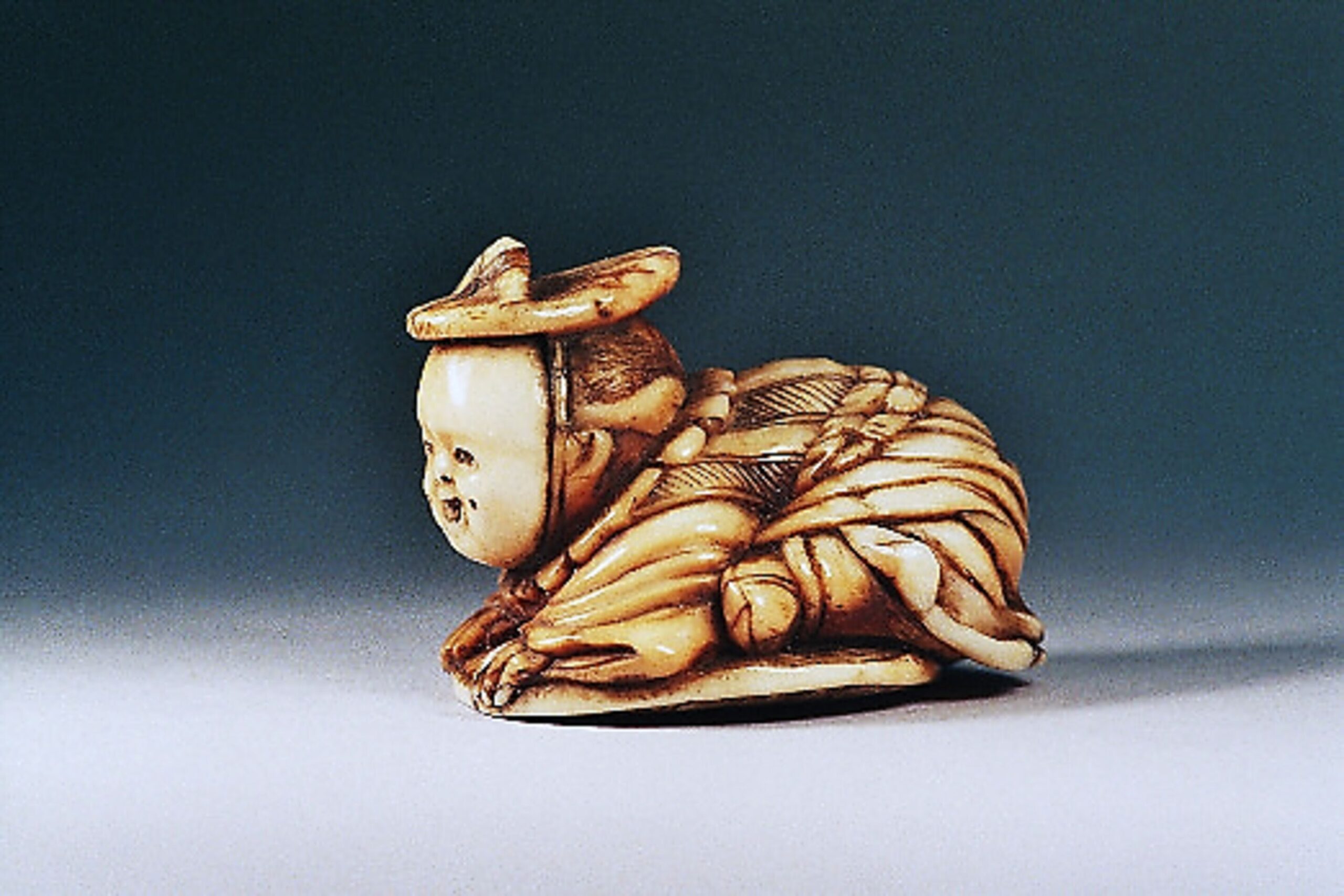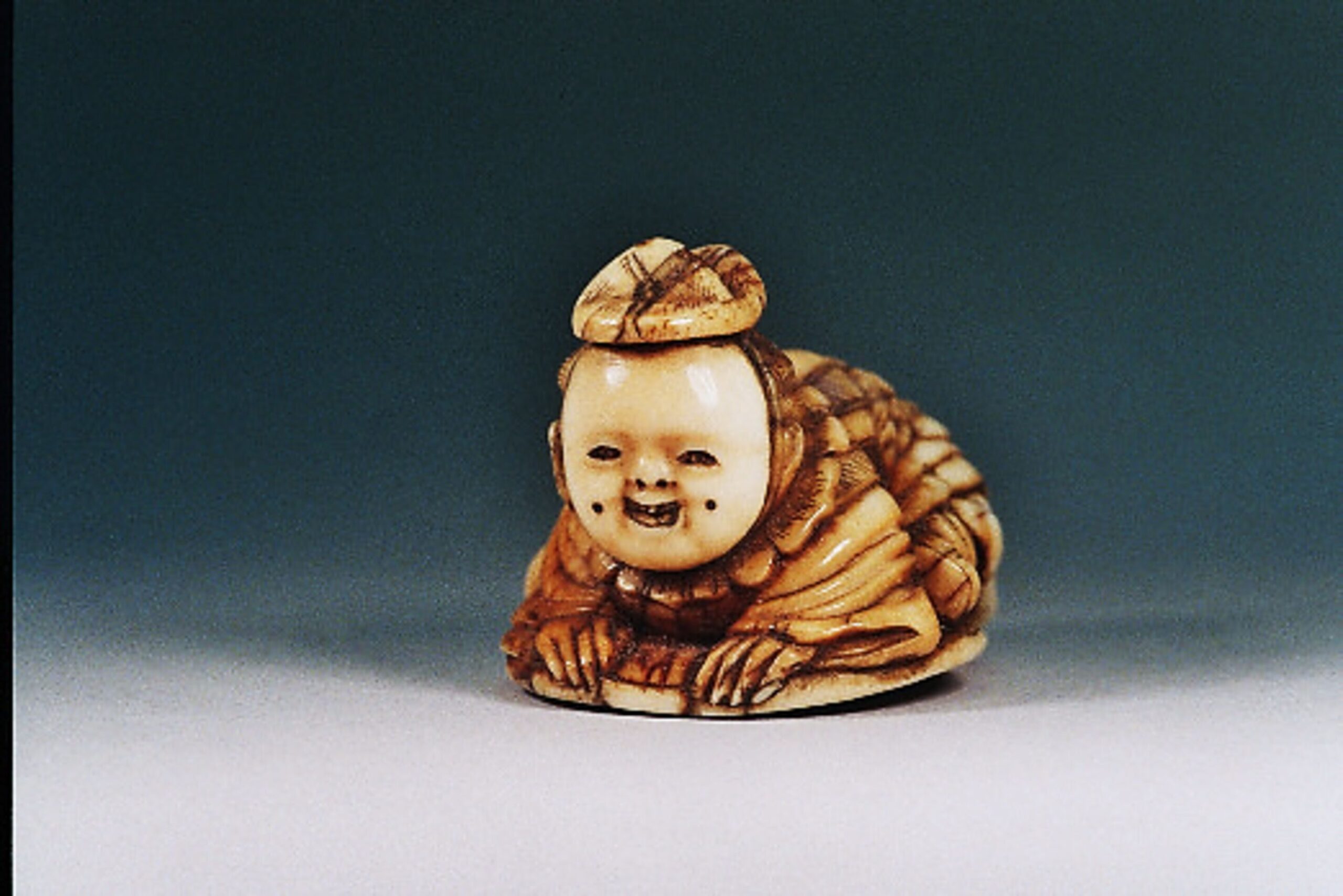 Elfenbein-Katabori. Der „chinesische Knabe“ Karakô sitzt weit vorgeneigt, die Hände aufgestützt, kauernd auf einem runden Fächer. Er trägt ein reiches höfisches Gewand, das Oberteil in breiten vertikalen Streifen, das Unterteil, abgesetzt durch einen Gürtel, ist dicht gefältelt. Dazu ein breiter Schulterkragen. Auf dem Kopf die höfische Kopfbedeckung Eboshi. Vor dem Gesicht die Maske eines lachenden Kindes mit Wangengrübchen. Als Basis dient ein runder Fächer mit quadratischer Musterung. An dessen Griff durch ein Loch gezogen befindet sich eine kleine Quaste. Zwei gut gebohrte umrandete Himotoshi befinden sich ebenfalls an der Basis durch den Fächer gebohrt. Elfenbein mit schöner Alterspatina. Länge 37mm. Nicht signiert. Vermutlich Edo/Tôkyô, 2. Hälfte 19.Jh.