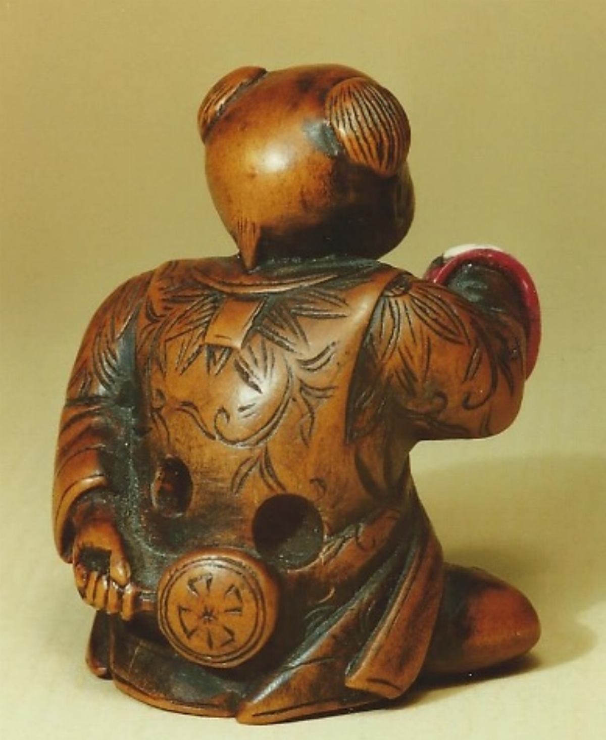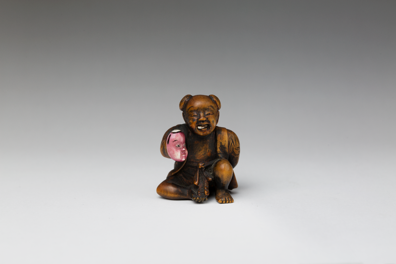 Buchsbaum-Katabori. Sitzender Knabe, durch die Haarbüschel Agemaki zu beiden Seiten des Kopfes als Karakô, chinesicher Knabe gekennzeichnet, das linke Knie aufgestellt, bekleidet mit einer kurzen, mit Rankenmotiven geschmückter Jacke, die vorne offen ist. Ursprünglich wohl geschwärzt, jetzt abgegriffen. In der rechten Hand hält er eine rot-lila gefärbte Maske, deren Augen und Brauen schwarz gefärbt, der Scheitel weiss gelassen ist. Mit der Linken hält er hinter dem Rücken eine ebenfalls verzierte Rassel, Denden-Taiko. Die Zunge ist aus Elfenbein und beweglich (Trick-Netsuke). Gute Himotoshi im Rücken. Nicht signiert. Alter: 19.Jh., Höhe 38mm.