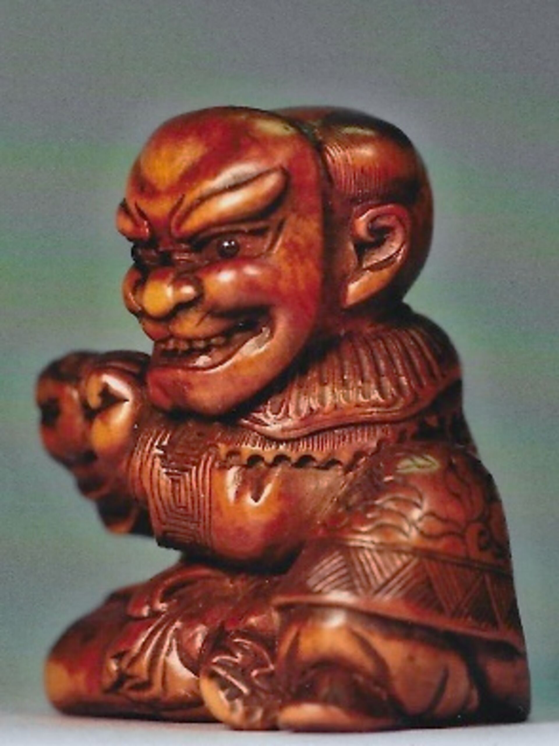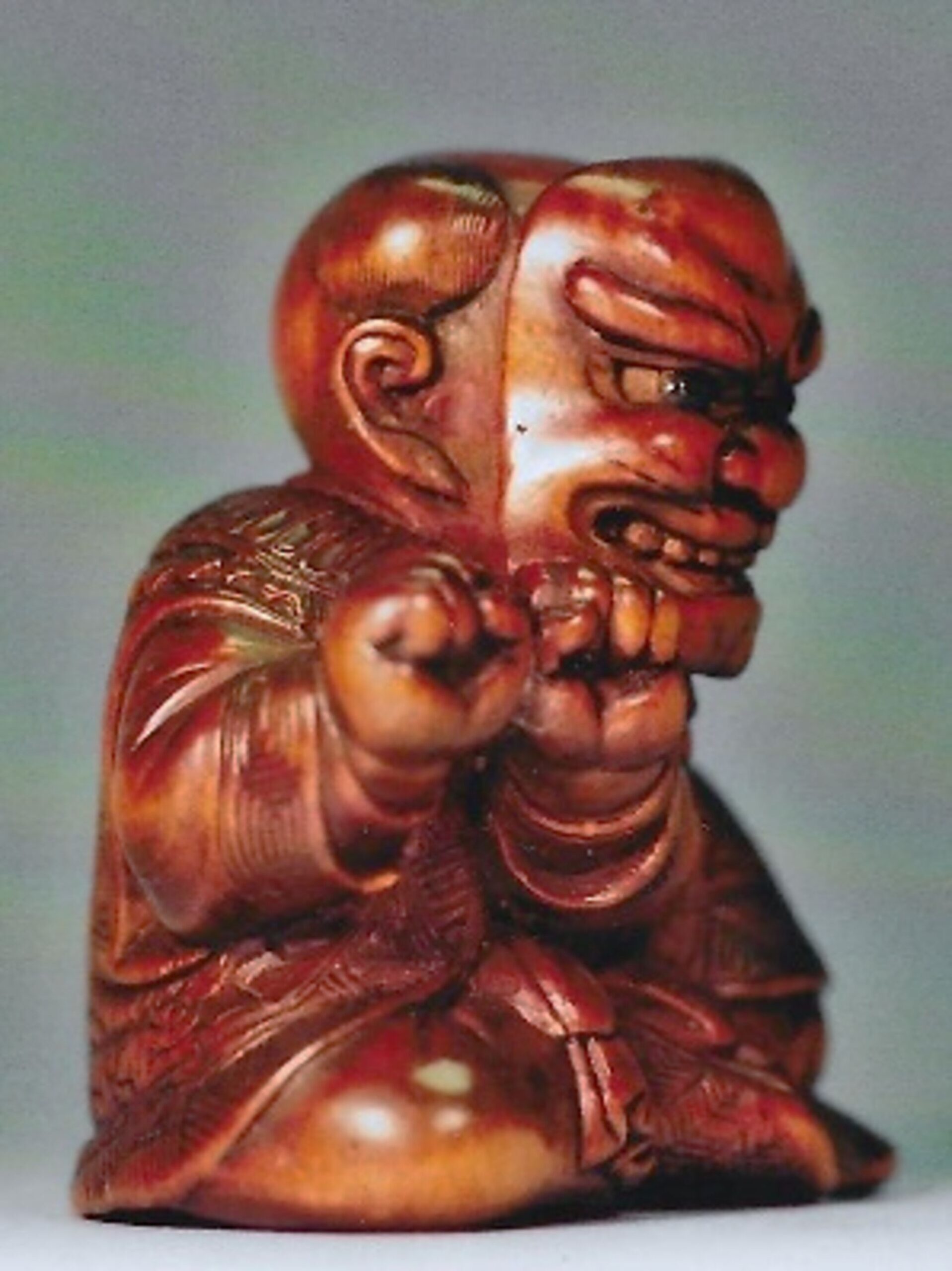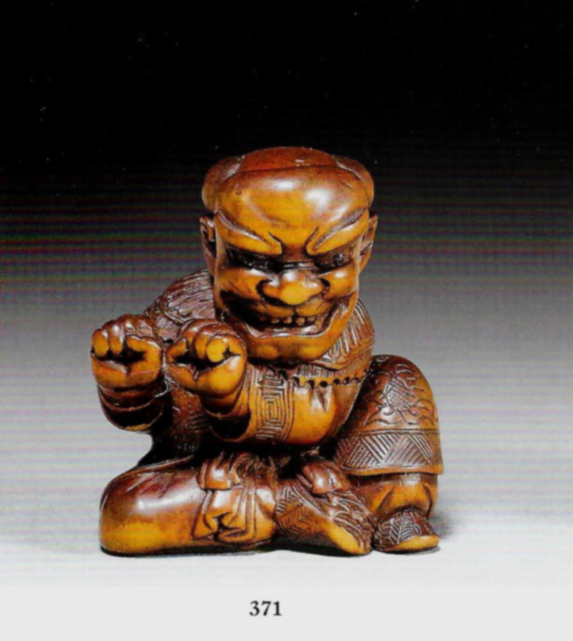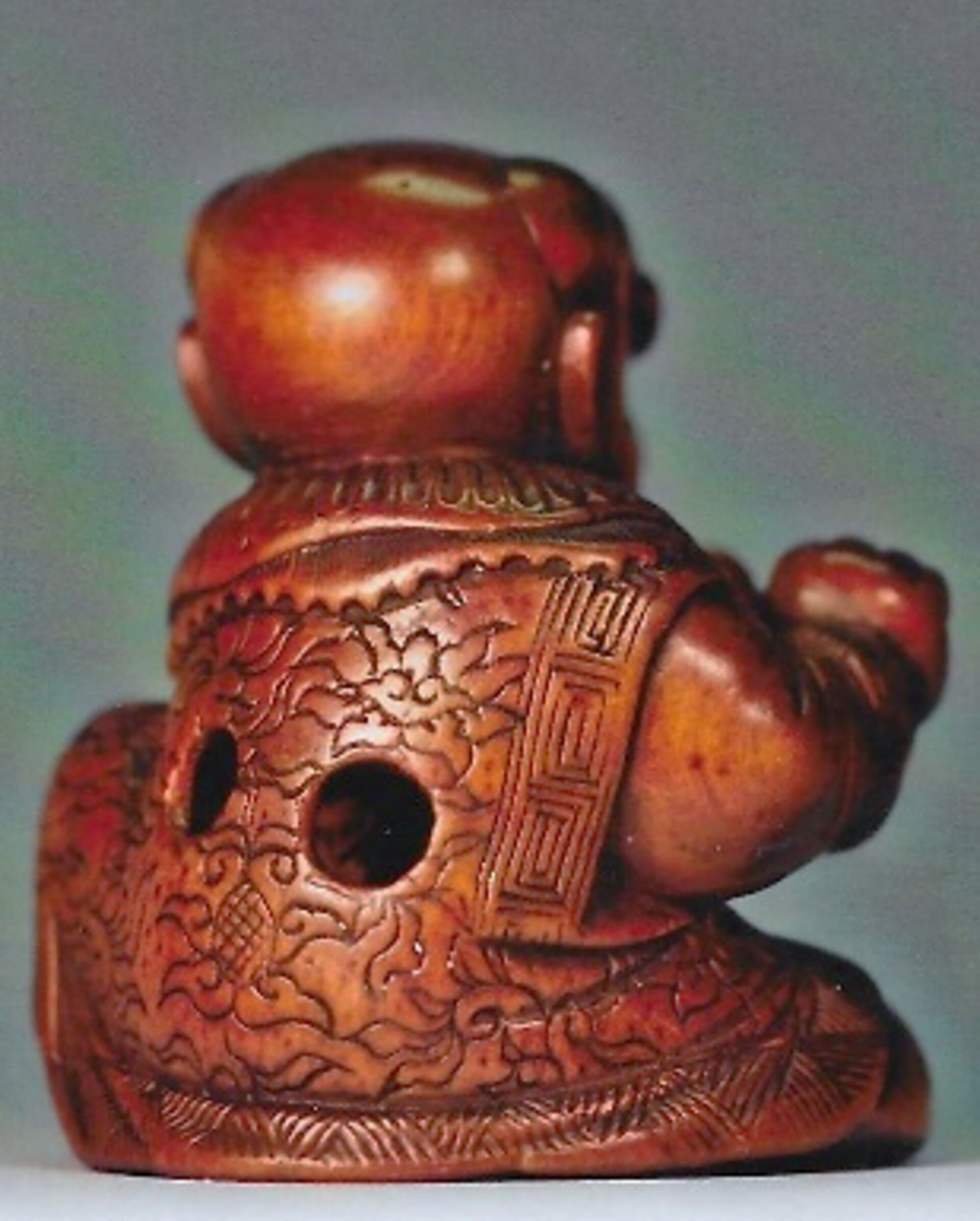 Holz-Katabori. Der „chinesische Knabe“ Karakô, sitzt, das linke Bein aufgestellt, das Gesicht unter der Maske eines grimmigen Mannes verborgen. Zu der Grimmigkeit passen die geballten Fäuste. Die Pupillen der Maske sind in schwarzem Material eingelegt. Das Gewand hat einen breiten dekorierten Kragen, florales Design, breite Borten mit Mäander- und Strichmuster. Im Rücken zwei gut gebohrte Himotoshi, unter dem Gesäss die Signatur SUKETADA (K308, K283). Höhe 37mm. Perfekter Erhaltungszustand. Auf der Vorderseite, Nase, Fäuste, Knie und Fuss geringe Spuren von Gebrauch. Meinertzhagen, MCI, p.829, bildet das Stück ab und datiert es 1820. – Die Maske eines grimmigen alten Mannes lässt sich nicht eindeutig zuordnen. Am ehesten entspricht sie einer volkstümlichen Maske vom Typus Akujô. Siehe Bushell, Netsuke Masks, no.201.