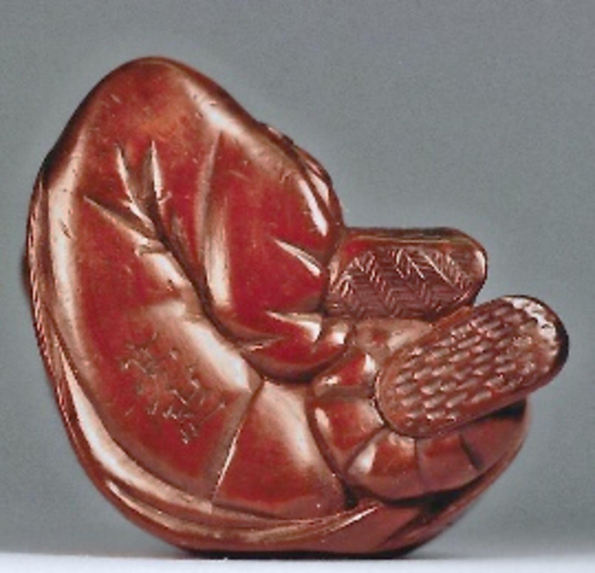 SUKETADA: gemäss Meinertzhagen Card Index p.828 gehörte er zur Hida-Schule, war ein Schüler von Sukenaga und arbeitete ca. 1820-50: „of 16 ‚netsuke‘ recorded, all in wood. Subjects both human figures and animals including child with demon mask. Some of the designs are both original and clever, comparing in quality with the work of Sukenao.” – Ueda Reikichi führt ihn p.259 unter Nr.1127 mit derselben Signatur wie oben an, datiert ihn als “Early” und qualifiziert ihn “Was an excellent carver.”