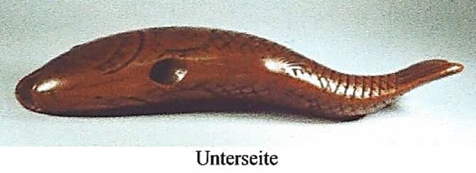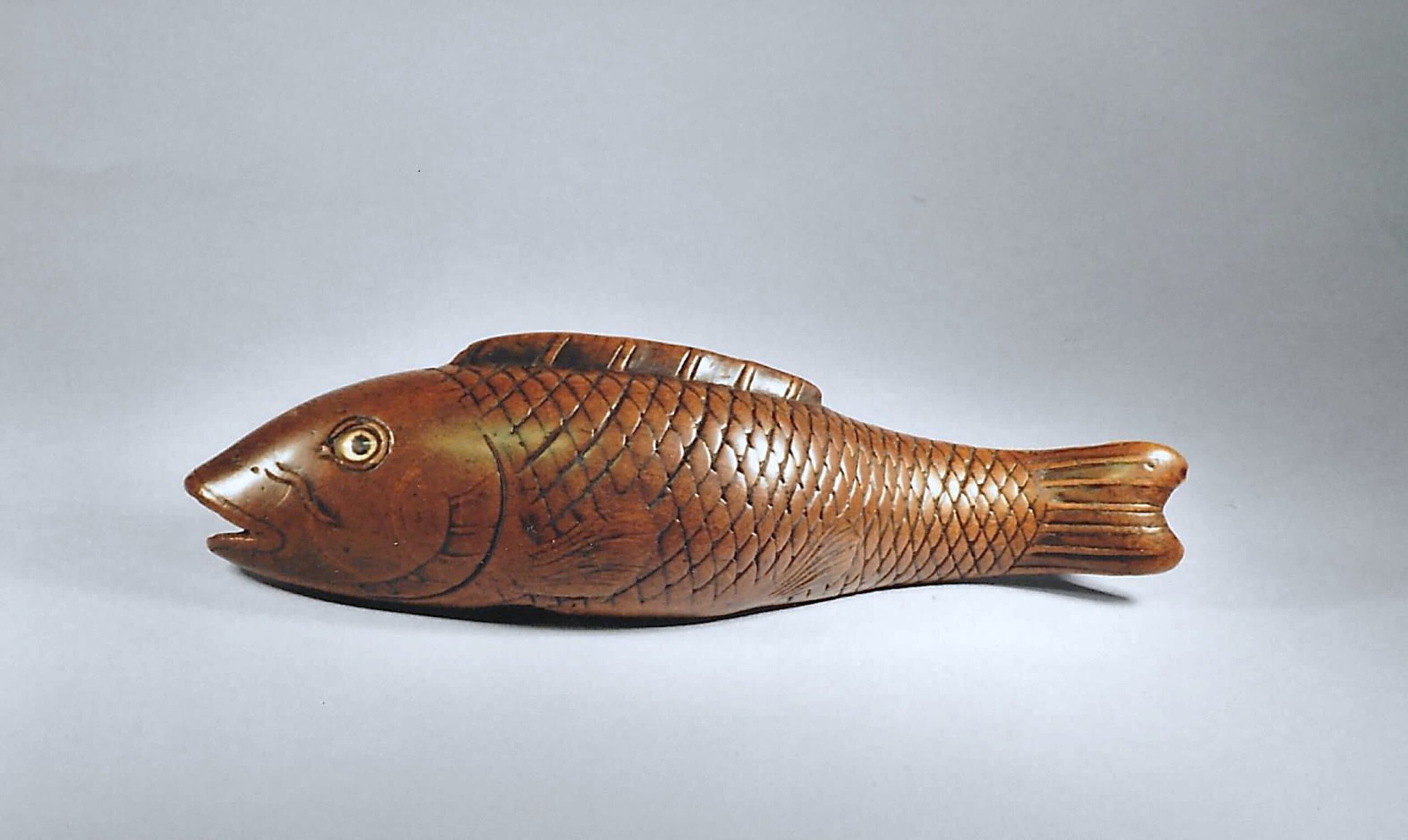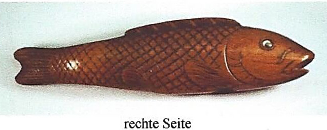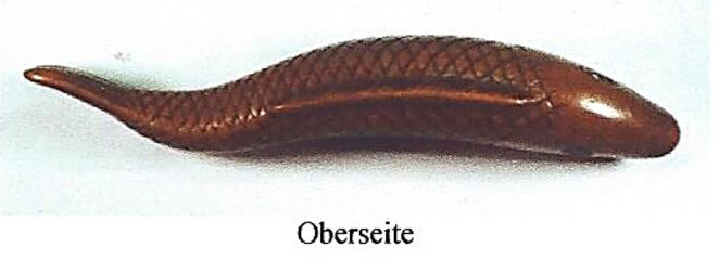 Holz-Katabori, 148mm, Mitte bis 2. Hälfte 19. Jh. — Hölzerner Fisch, vermutlich handelt es sich um einen Karpfen, in geschwungener Bewegung, der Ausdruck ist ängstlich-zögernd, die Schuppen sind schwarz konturiert, die Augen doppelt eingelegt, ein Schnurloch Himotoshi befindet sich auf der Unterseite, das andere durch das offene Fischmaul. Schöne Glanzpatina, Tragespuren.