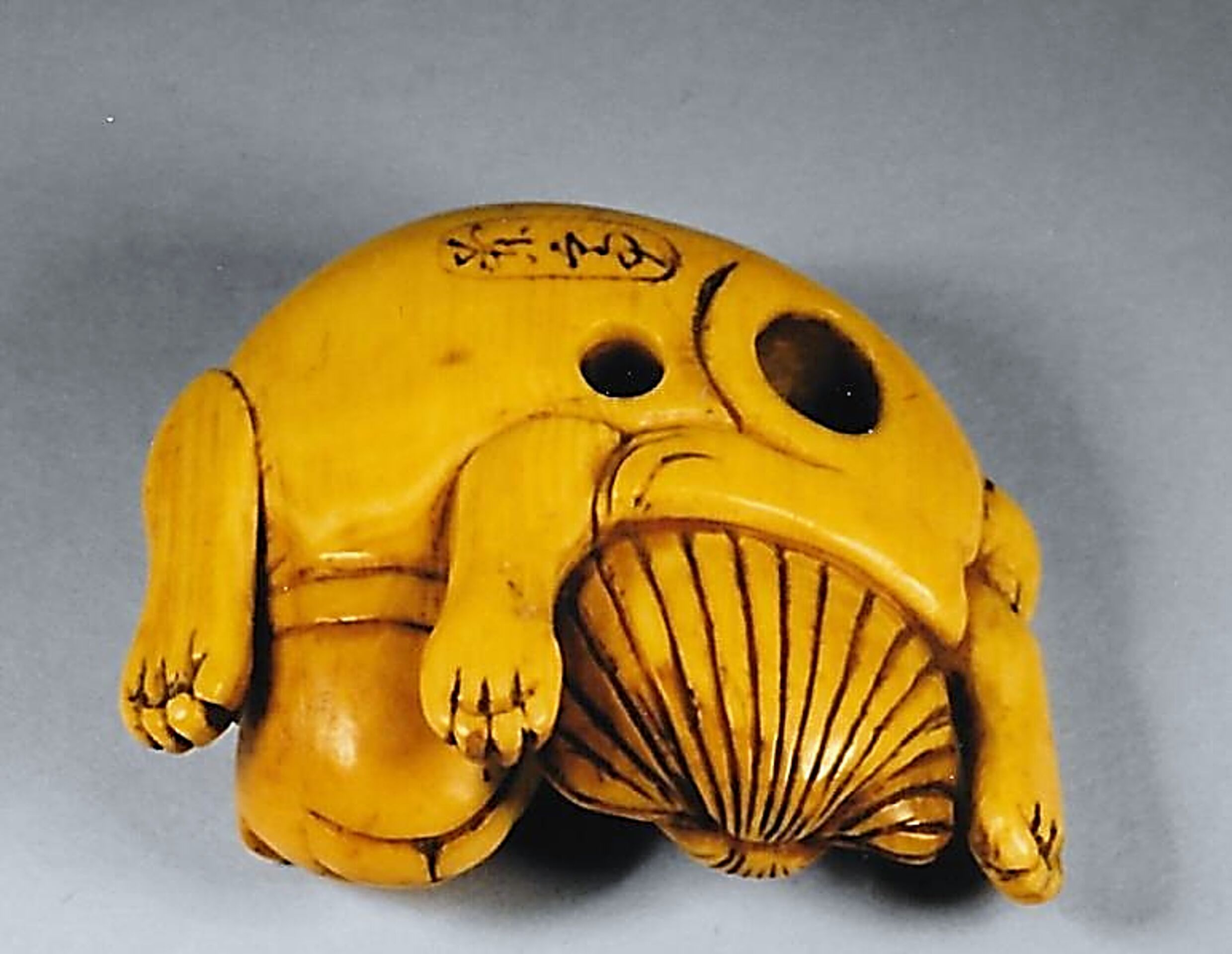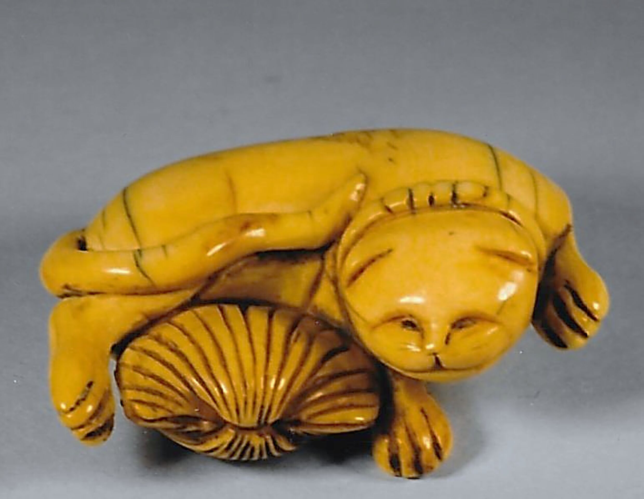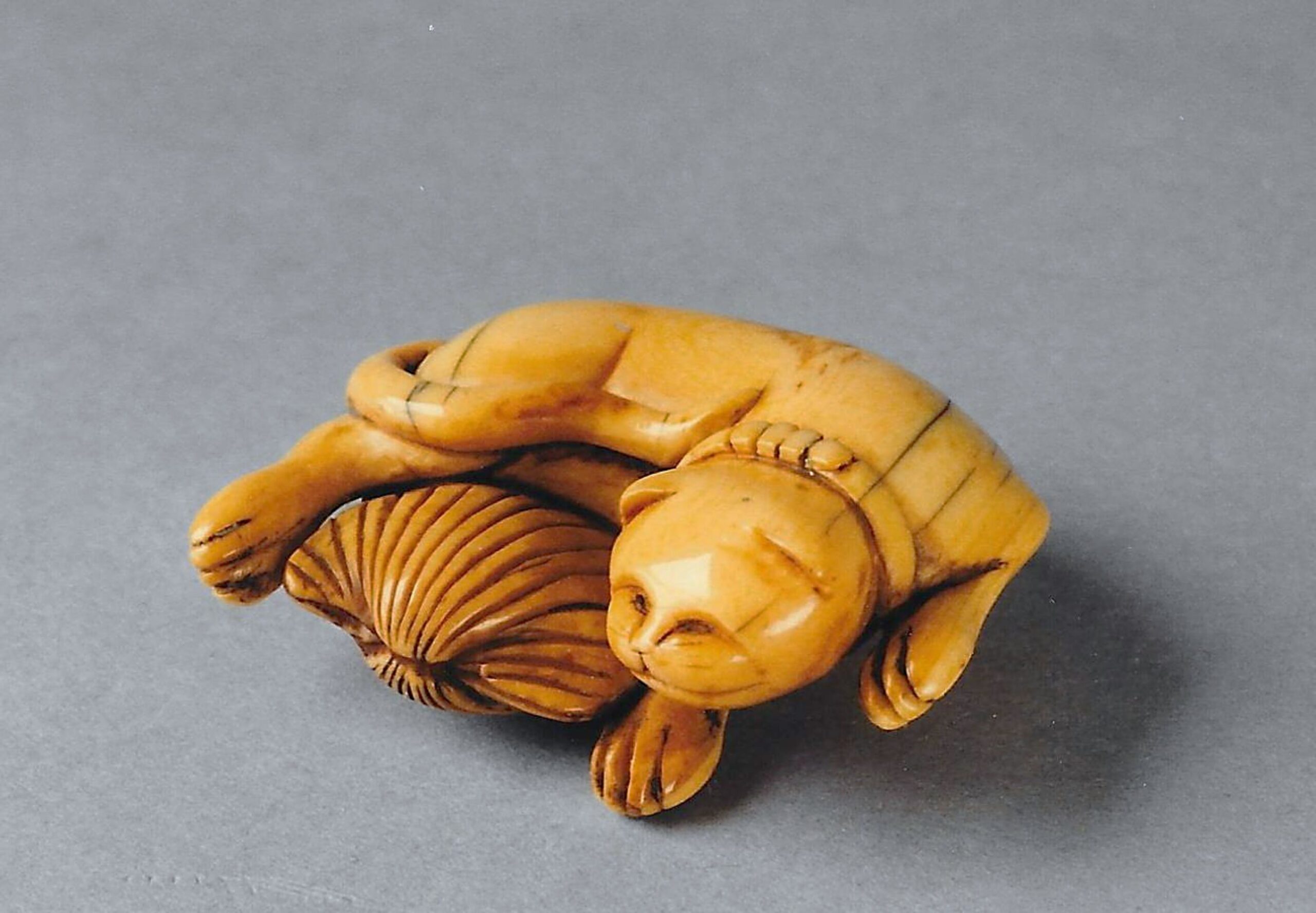 Elfenbein-Katabori. Eine Katze mit einem Halsband liegt nach rechts gerundet um eine übergrosse Muschel. Der Schwanz schmiegt sich auf der Vorderseite ihrem Körper an. Auf der Unterseite zwei unterschiedlich grosse, gut gebohrte Himotoshi, die die Rundung des linken Hinterlaufs ausnützen. Auch auf der Unterseite in einer langovalen Kartusche die Signatur RANTEI (K524, K308). Länge 40mm. Um 1800.