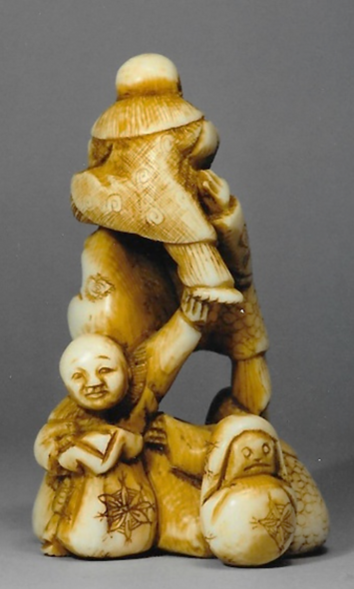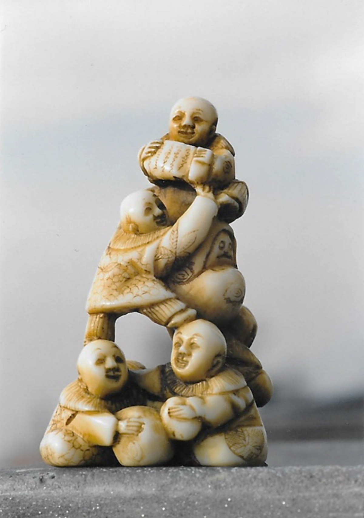 Elfenbein-Katabori, fünf Knaben, bekleidet mit geschmückten Jacken mit breiten Kragen und mit gestreiften langen Hosen, bilden eine Menschenpyramide. Dazwischen zwei Darumapuppen. Die zwei unteren Knaben formen eine weitere Puppe, vielleicht handelt es sich um Figuren aus Schnee. Der Knabe zu oberst hält eine Schriftrolle entfaltet. Höhe, 57mm, nicht signiert, ordentlich grosse Himotoshi an der Basis. Ursprünglich eingefärbt, jetzt an den exponierten Stellen glatt gescheuert und entfärbt. Das Ganze hat die Form eines Kegels, vermutlich aus der Spitze eines Elefantenzahns. Kein Meisterwerk, aber eine freundliche, ansprechende, durchbrochene Arbeit, vermutlich aus dem 20.Jh.