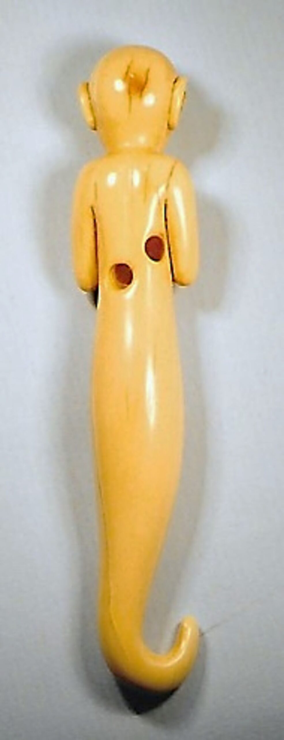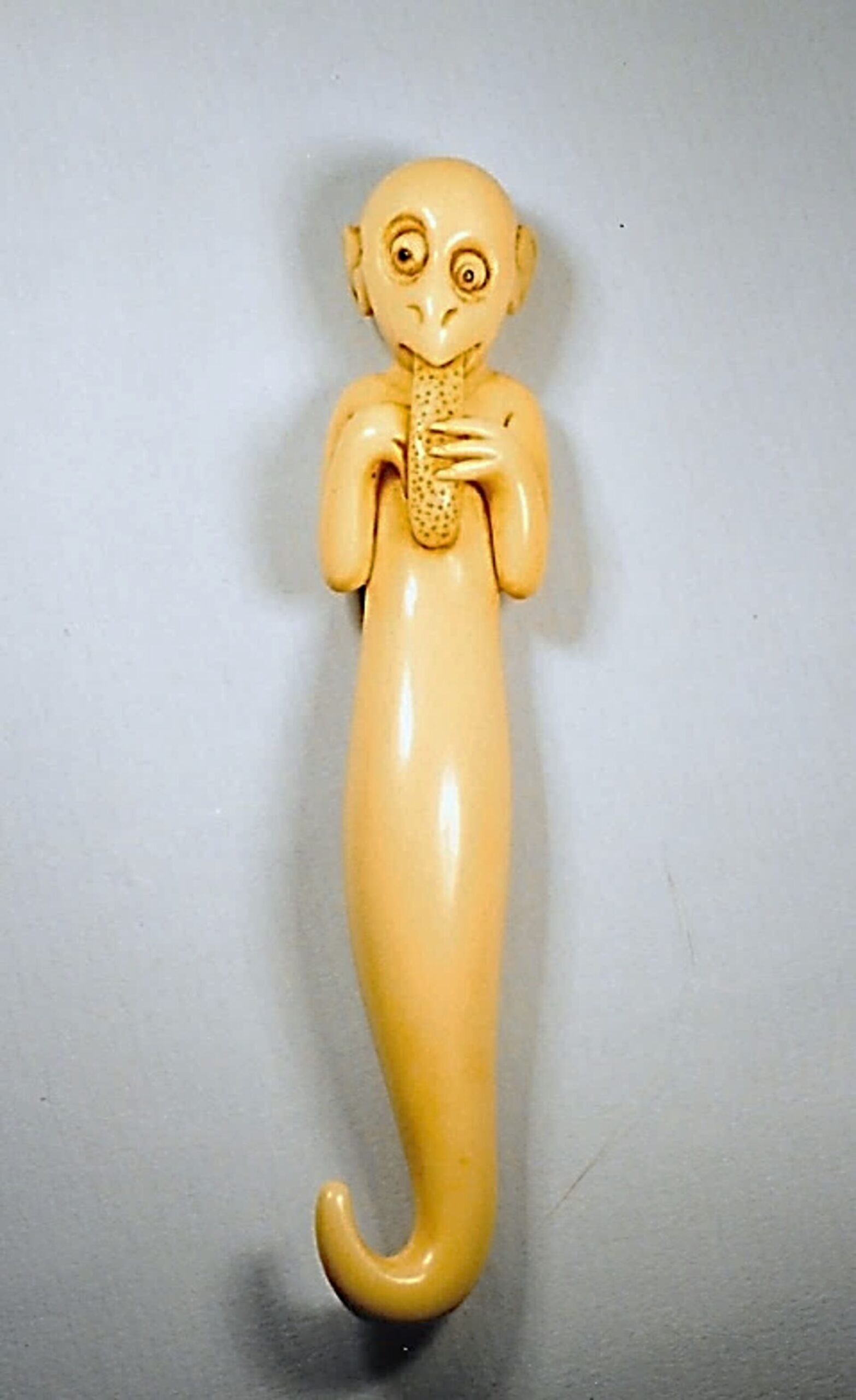 Katabori aus Elfenbein oder einem anderen natürlichen Bein. Sashi-Netsuke. Dargestellt ist ein witziger Kobold, bakemono, mit einem Vogelschnabel. Er hat zwei Arme mit je vier krallenbewehrten Fingern. Diese umfassen die lange herausgestreckte Zunge, als ob er Blockflöte spielen würde. Die zwei schiefen Augen sind in dunklem Horn eingelegt. Der langgestreckte Leib läuft in einem gekrümmten Schwanz aus. Länge 103mm. Leicht eingefärbt. Himotoshi auf der Rückseite, gut gebohrt. Einige Sprünge in der Längsrichtung. Kopie nach MASATOSHI, 20.Jh.