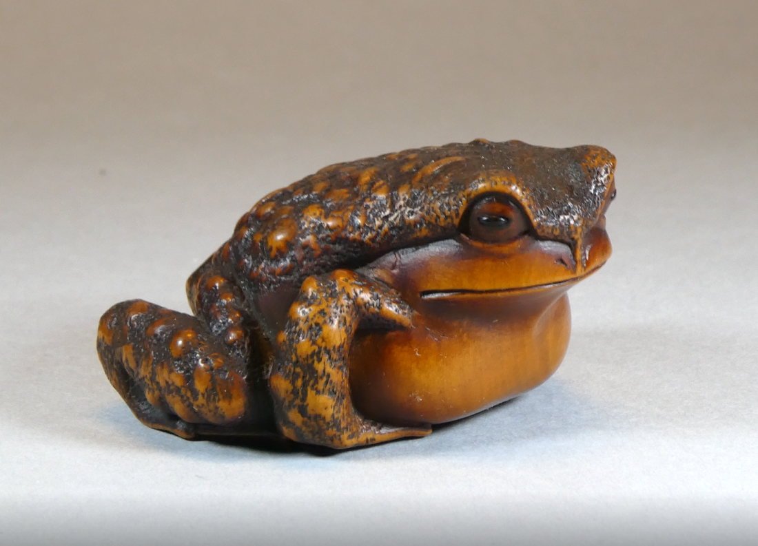 Wood-Katabori. Die äusserst fein und sorgfältig geschnitzte Kröte sitzt und wartet aufmerksam. Ihr Rücken ist über und über mit Pusteln bedeckt. Die Augen sind mit dunklem Material eingelegt. Der aufgeblähte Hals und der Bauch sind glatt und glänzend poliert. Natürliche Himotoshi unter der linken Vorderpfote. Auf dem Bauch die Signatur MASANAO, K191, K282, . Länge 49,5mm, Alter ca. Mitte 19.Jh., perfekter Erhaltungszustand.