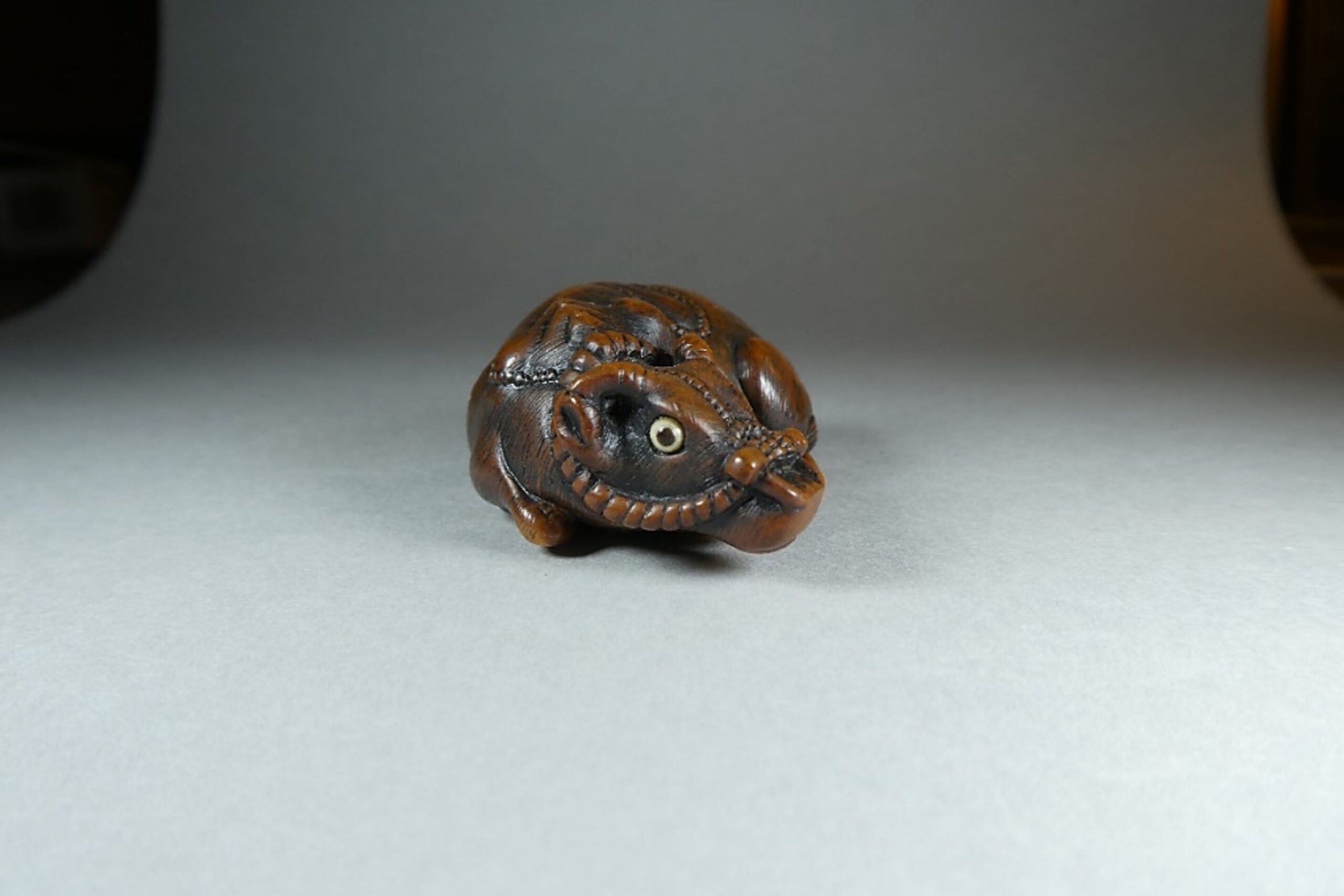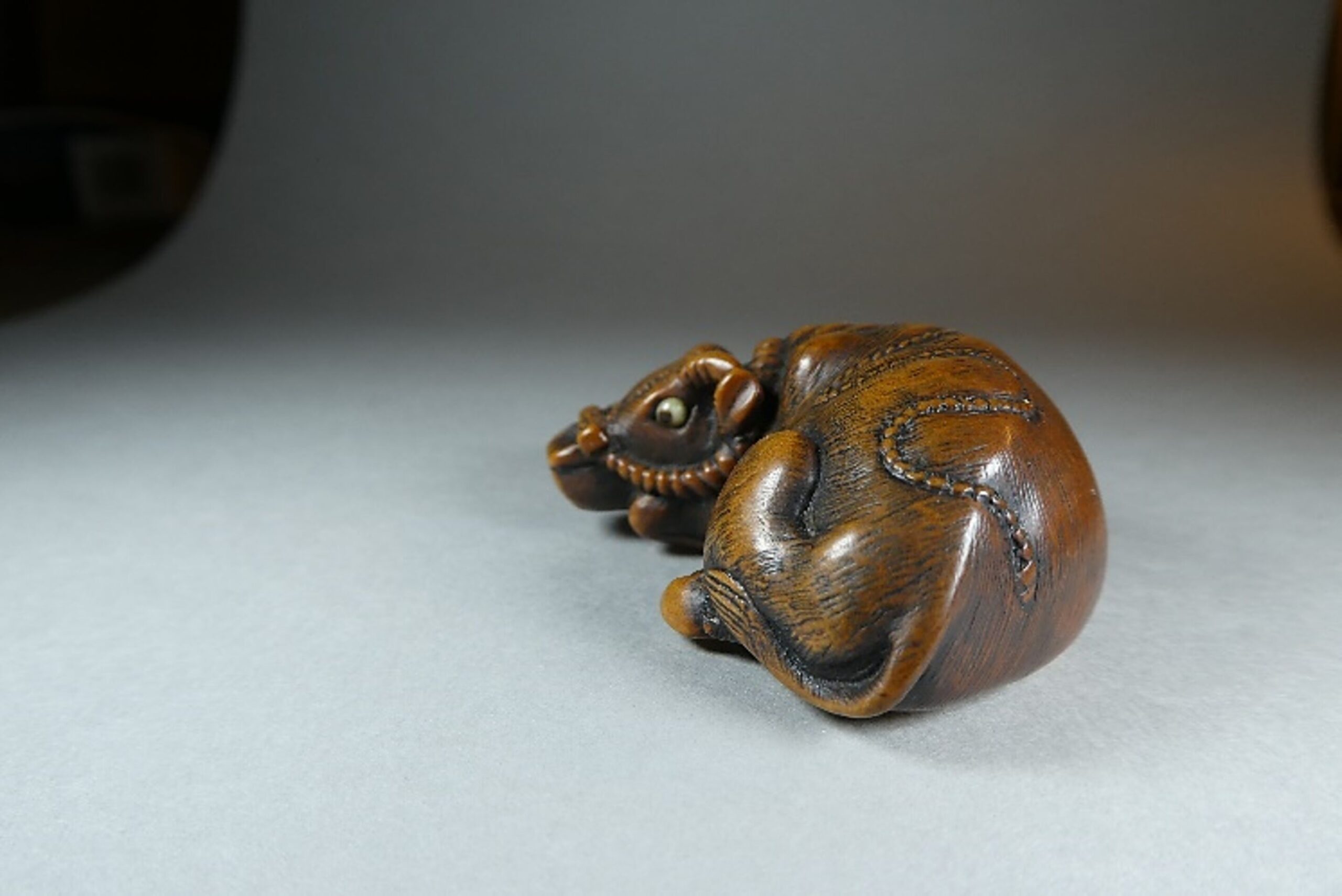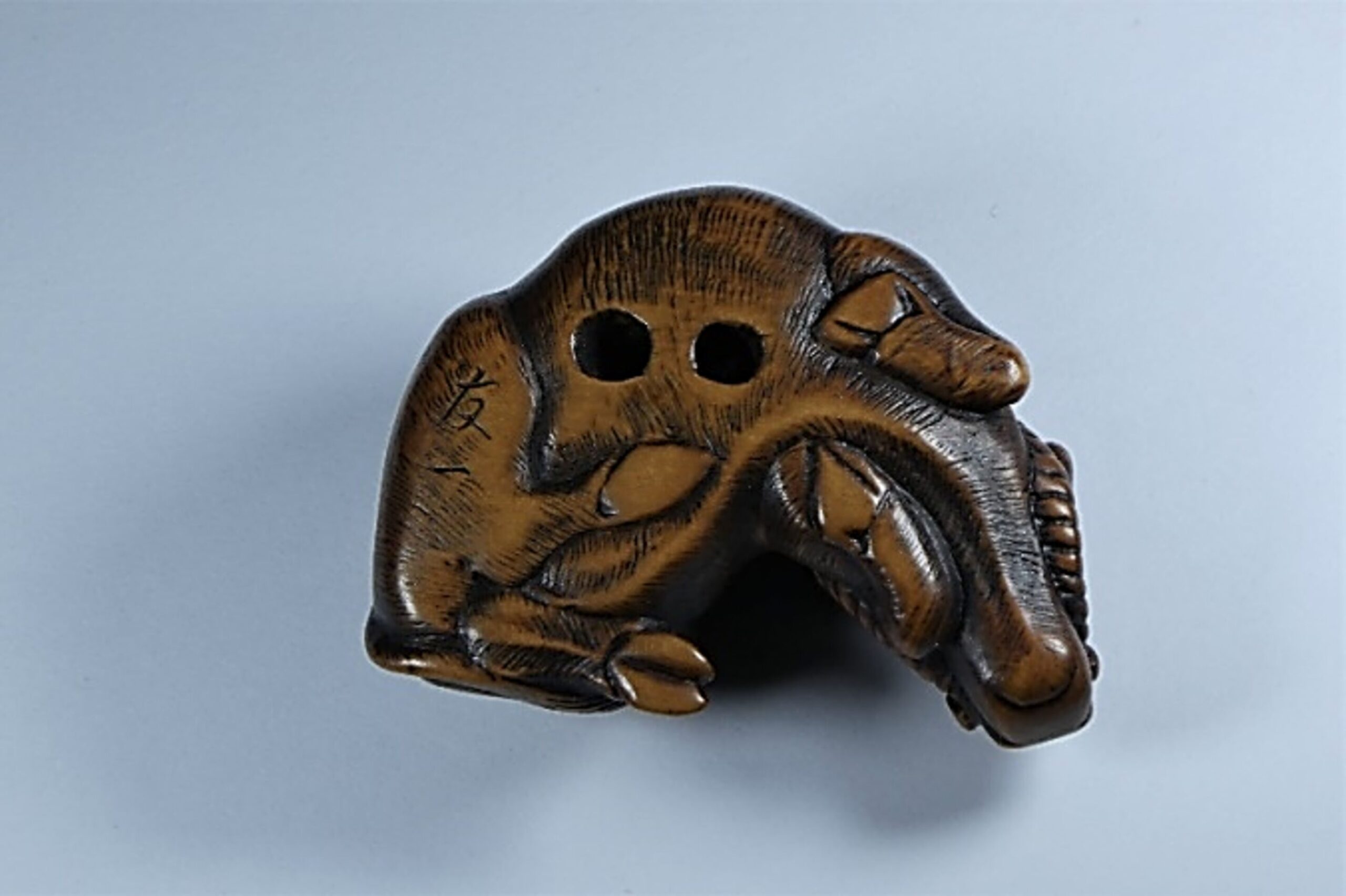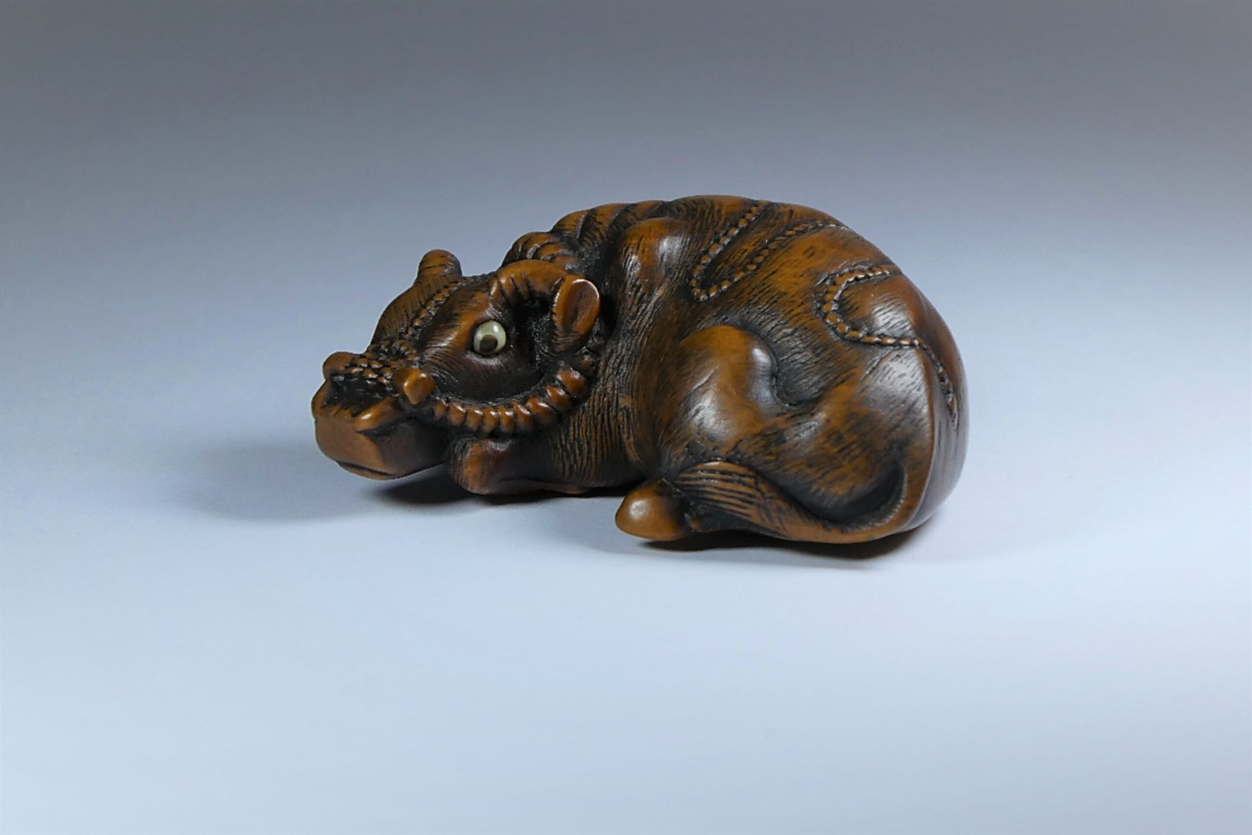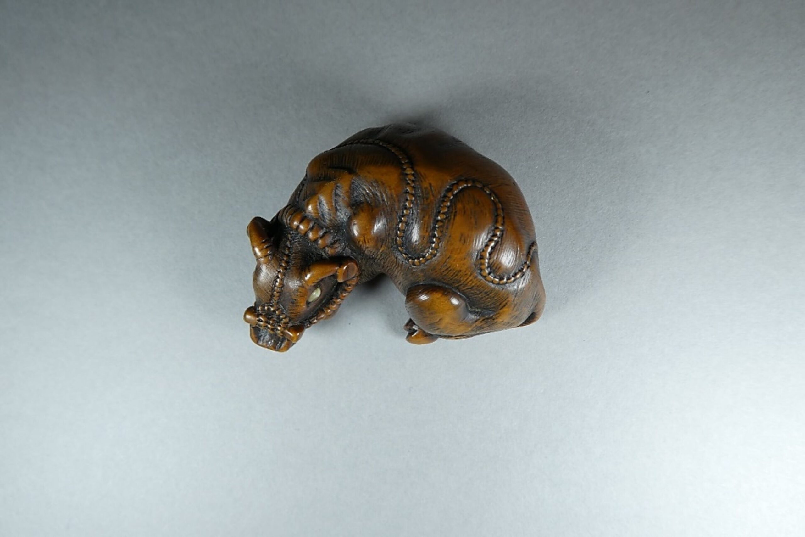Holz Katabori. Das Tomotada-Modell des liegenden gehalfterten Ochsen mit doppelt eingelegten Augen. In allen Details perfekt ausgeführt. Feine Fellzeichnung. Schöne Glanzpatina. Unterseitig zwei gut gebohrte Himotoshi. Auf dem rechten Hinterlauf signiert (?später hinzugefügt?) TOMOKAZU (K179 K141). Länge 48mm, ca. 1.H.19.Jh.