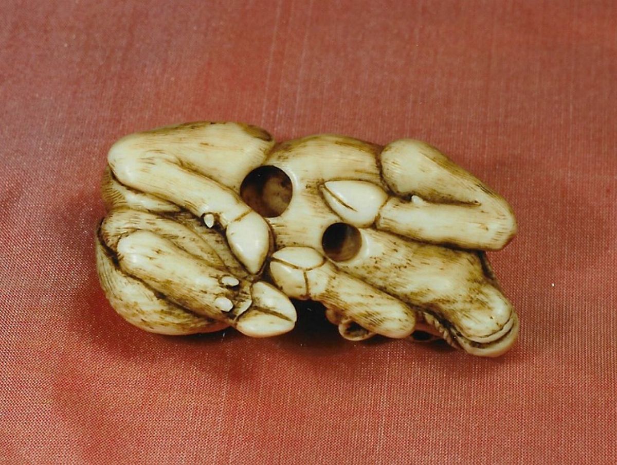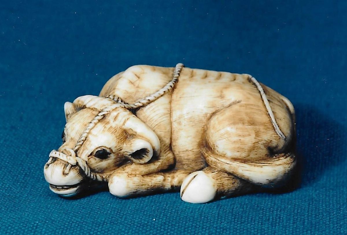 Elfenbein-Katabori, klassische Darstellung des nach links liegenden Ochsen mit dem langen Leitseil über dem Rücken, schöne Fellzeichnung, gut eingefärbt, an der Unterseite und an den exponierten Stellen schöne Glanzpatina, Augen in schwarzem Horn eingelegt, grosse, sorgfältig ausgehöhlte Himotoshi an der Unterseite. Insgesamt kompakte Form. Länge 58mm. Alter: vermutl. 19.Jh., Nicht signiert.