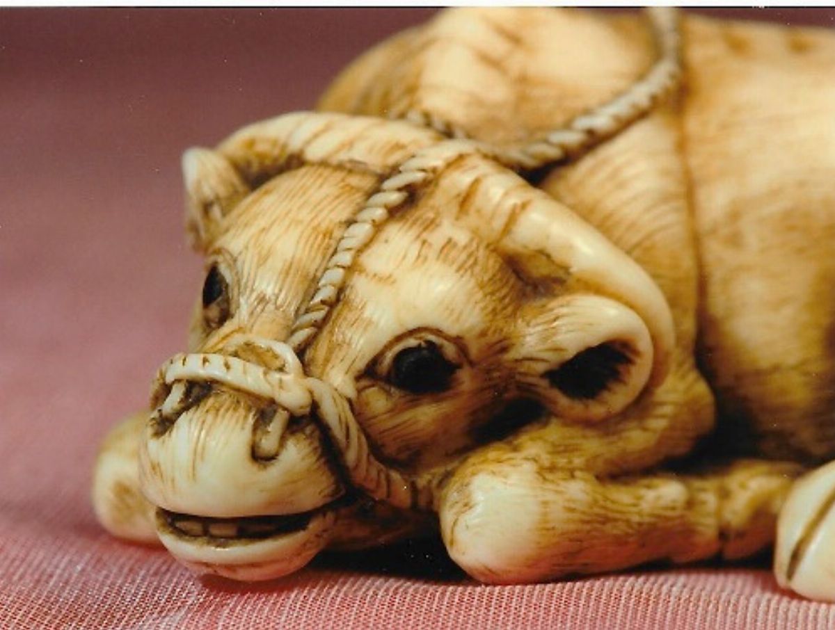 Der Ochse oder Stier Ushi ist das 2. Tier des Tierkreises. Er steht über den Stunden von 1-3 h morgens und über dem Monat Dezember. Er ist das Arbeitstier schlechthin. Er ist das Sinnbild der Beständigkeit und des Wohlstands, hängt doch von seiner kraftvollen Ausdauer das Gedeihen auf den Feldern ab. Er ist das Reittier für Weise und Heilige, Sennin und Rakan, im besonderen das Tragtier Lao Tses, das diesen auf wunderbare Weise ins Paradies trug. – Ungeklärt ist bis heute, wie Netsukeshi ersehen konnten, wie ein liegendes Rind von unten aussieht. Im Scherz wird behauptet, sie hätten Rinder dafür auf eine Glasplatte gelegt.