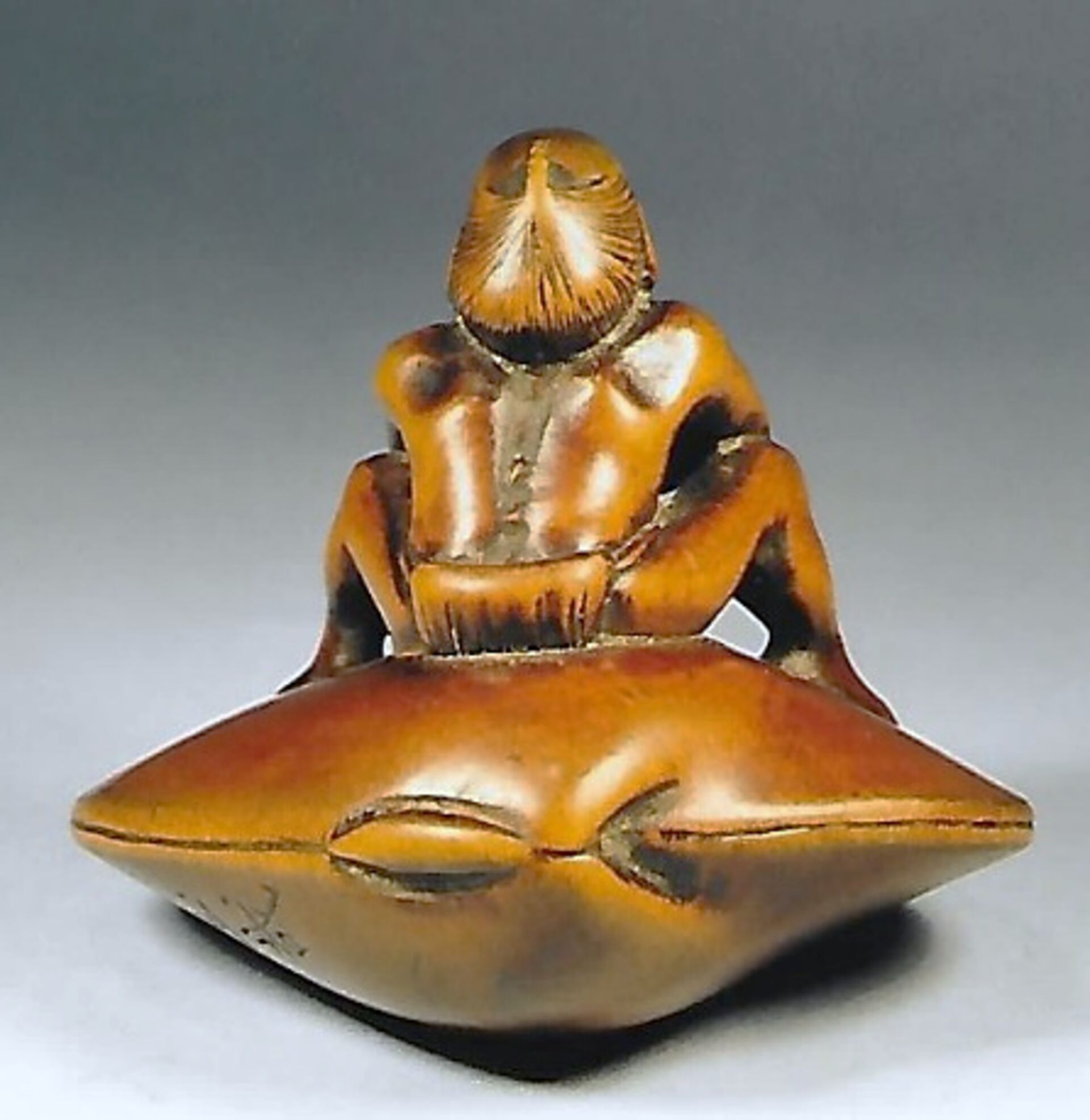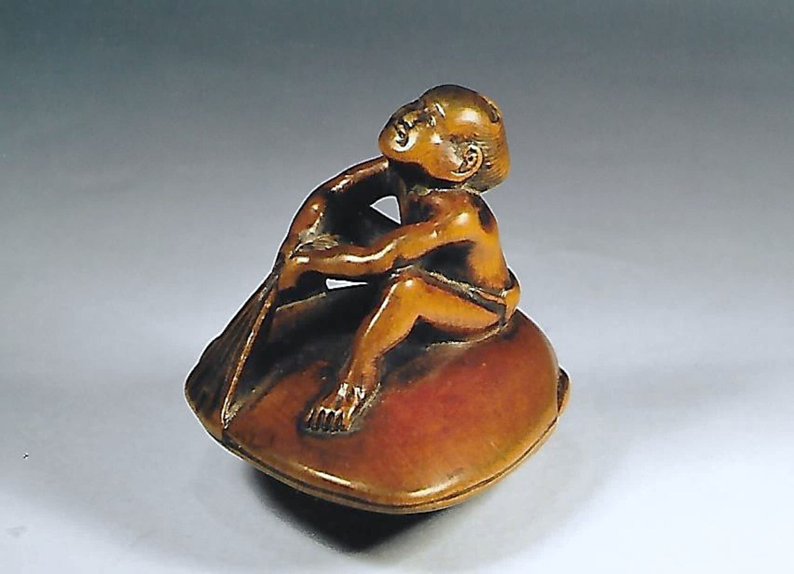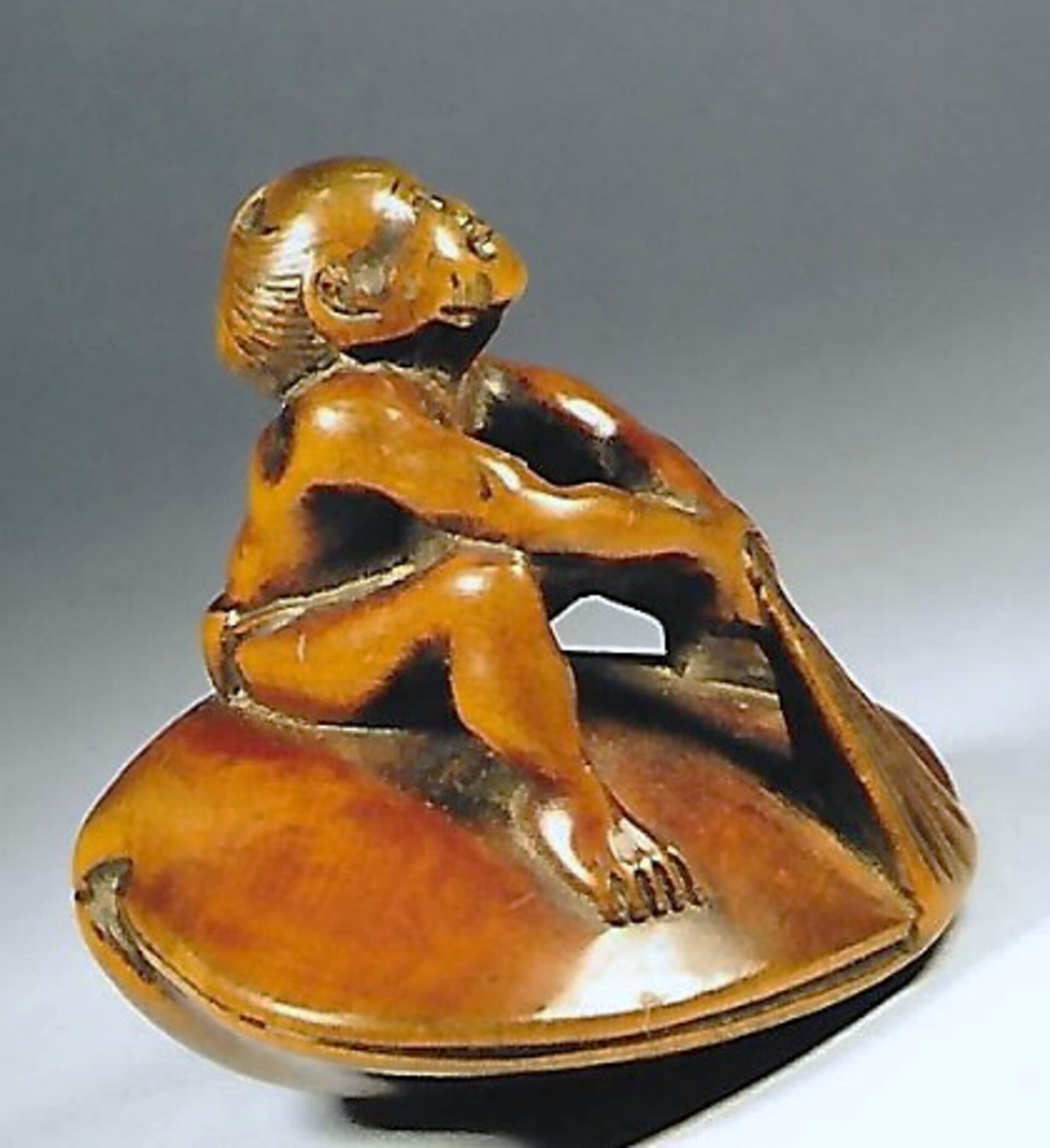 Holz-Katabori. Auf einer übergrossen Hamaguri-Muschel sitzt ein verhältnismässig kleiner Mann, nackt bis auf ein Lendentuch fundoshi, das in der Muschel eingeklemmt ist. Er bemüht sich angestrengt das Tuch herauszuziehen. Gebrauchsspuren und schöne Glanzpatina. Unterseitig die Himotoshi und die Signatur GYOKUSAI (K191, K317). Breite 44mm, Höhe 37mm. Zum Alter, s.u.