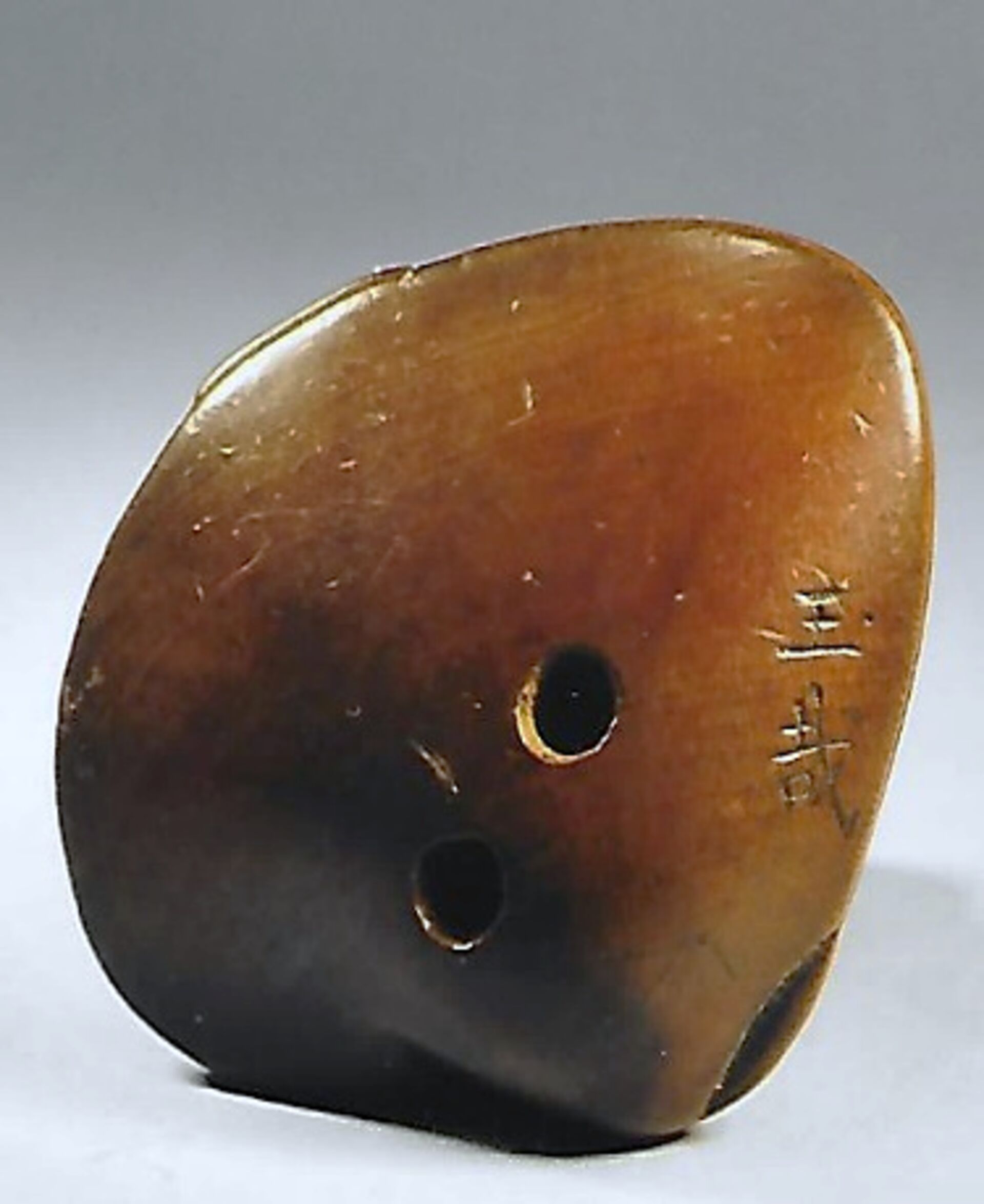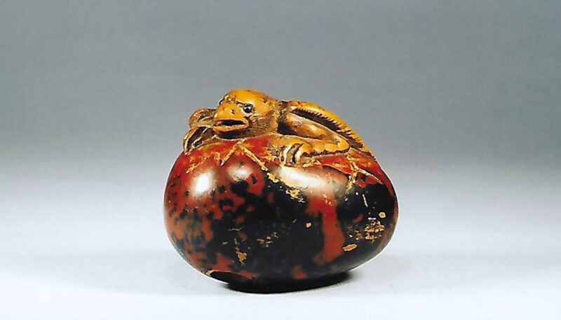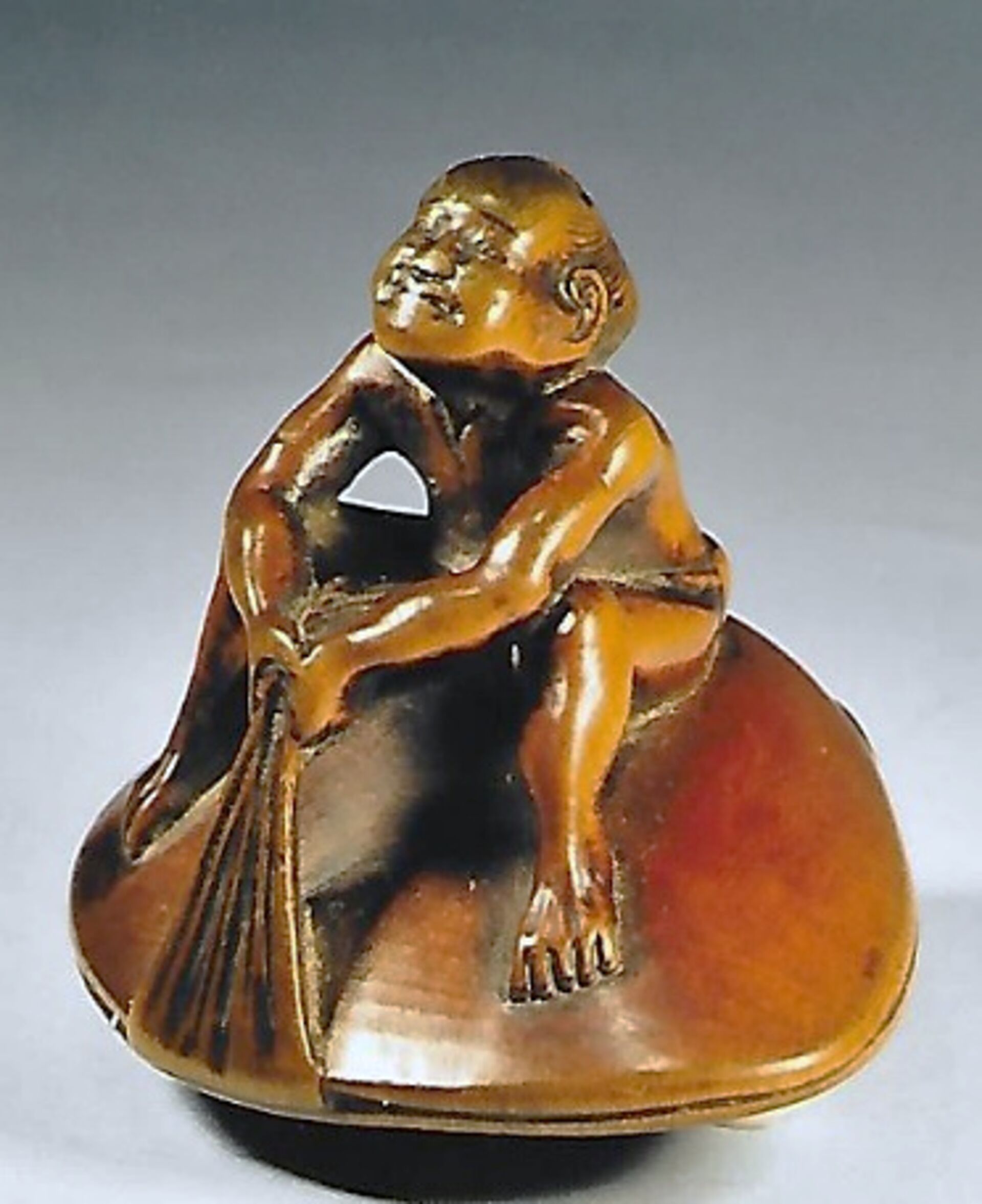 Holz-Katabori. Auf einer übergrossen Hamaguri-Muschel sitzt ein verhältnismässig kleiner Mann, nackt bis auf ein Lendentuch fundoshi, das in der Muschel eingeklemmt ist. Er bemüht sich angestrengt das Tuch herauszuziehen. Gebrauchsspuren und schöne Glanzpatina. Unterseitig die Himotoshi und die Signatur GYOKUSAI (K191, K317). Breite 44mm, Höhe 37mm. Zum Alter, s.u.