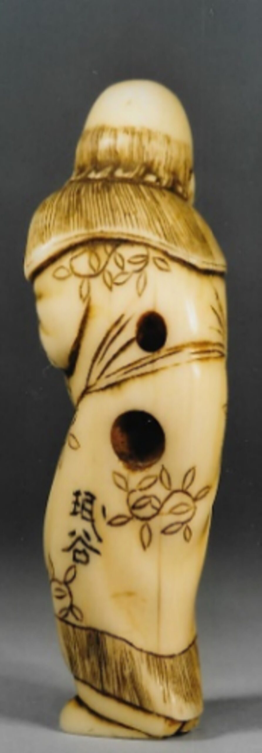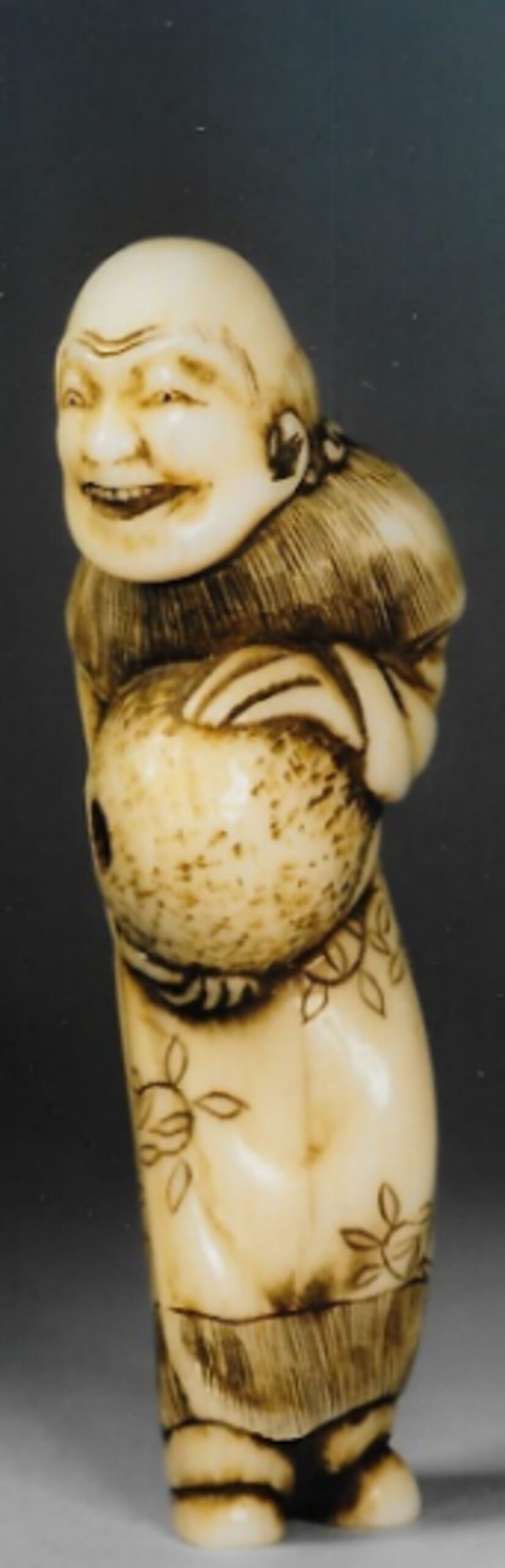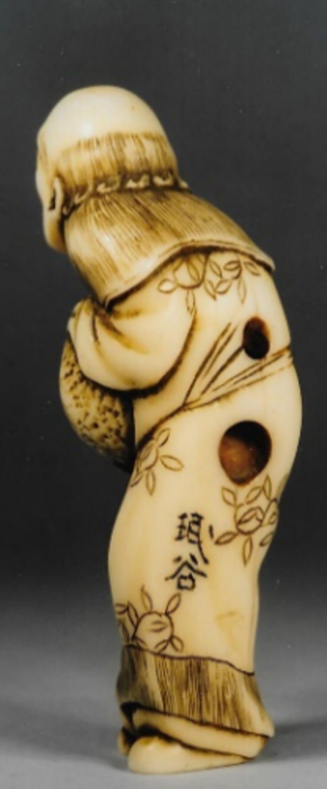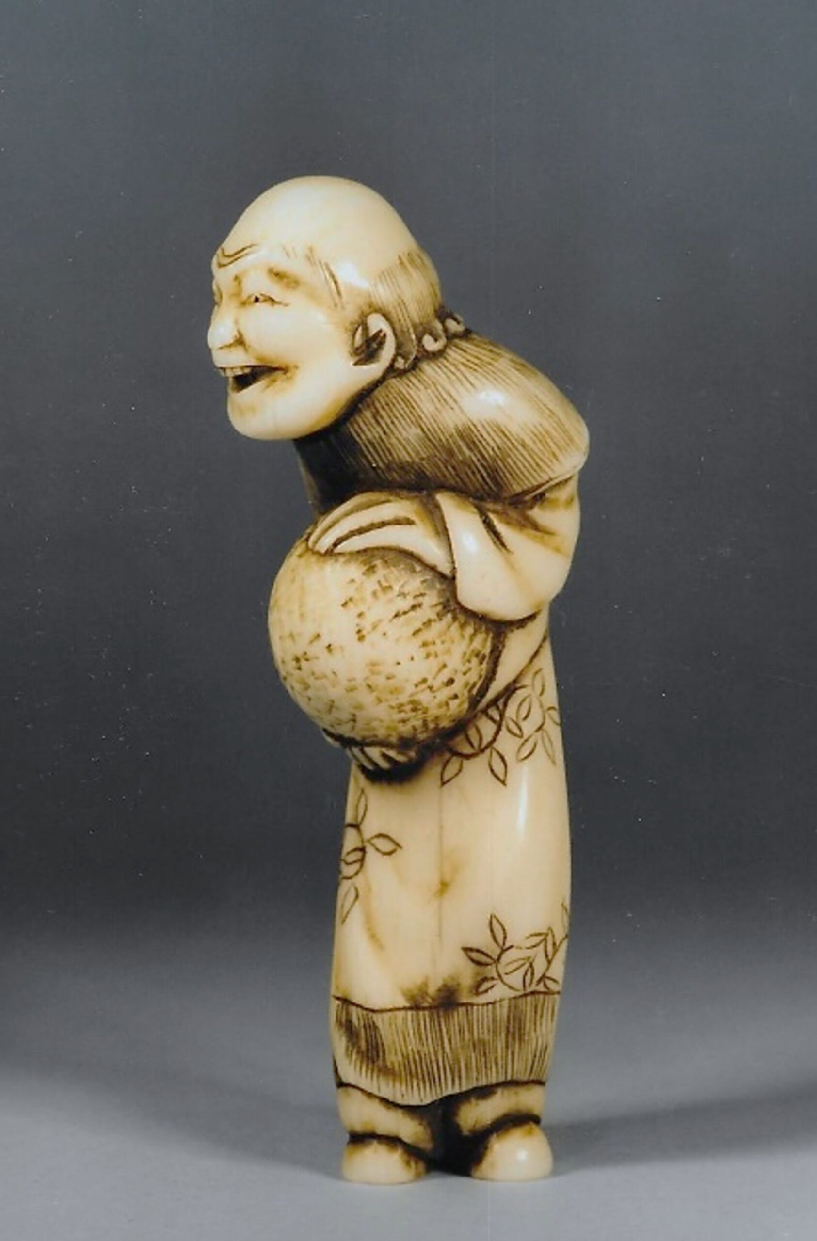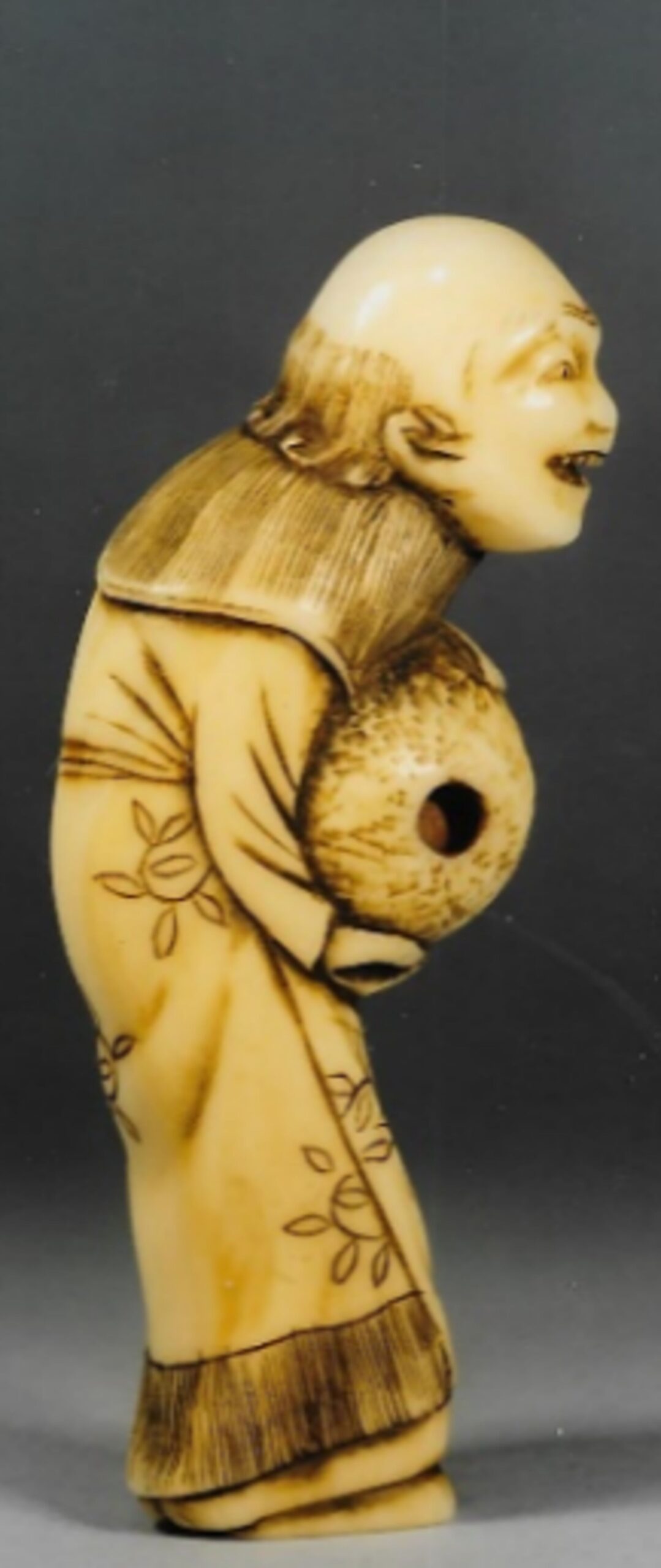 Elfenbein-Katabori. Vorgebeugt stehender Mann, glatzköpfig mit einem Rest eines lockigen Haarkranzes, freundlich verschmitzt lachend, das Gewand mit floralem Dekor und mit grossem Kragen. In Händen eine grosse Kugel oder einen Ball mit einem Loch, darin eine kleine bewegliche Kugel. Auf der Hinterseite zwei unterschiedlich grosse Himotoshi und eine Signatur MINKOKU (K194, K248). Höhe 55mm. Alter ca. Mitte 19.Jh.