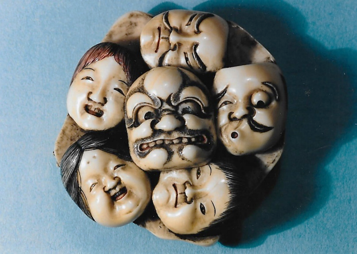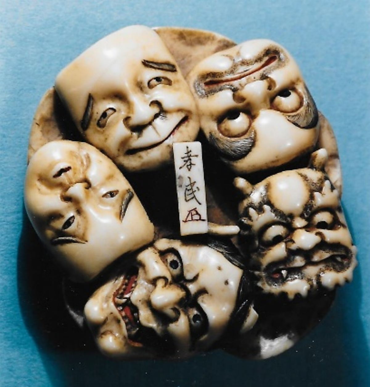Elfenbein-Manju, – Auf der Vorderseite sind 6 Theatermasken dargestellt, darunter Okame, Shôjô, Hyottoko, Buaku und vermutlich Momotarô, auf der Rückseite 5 Masken, u.a, Hannya und Oni und auf einem Steg die Signatur KOMIN (K252, K194) und ein Kakihan (persönliches Künstlersiegel), letzteres rot eingefärbt. Einzelheiten schwarz und rot eingefärbt, Durchmesser 50mm, Alter:19.Jh.