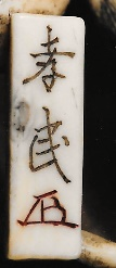 KOMIN: Verschiedene Netsukeschnitzer dieses Namens sind bekannt. Hier dürfte es sich gemäss der Signatur um Ichieisai Komin handeln, von dem Weber, Koji Hôten, Paris 1922, Vol.l, p.448, schreibt: “travaillait au XIXc siecle et sculptait des “oki-mono” et autres objets en ivoire et en bois.” Der Meinertzhagen Card Index on Netsuke in the British Museum, New York 1986, Vol.I p.383ff. bildet unter dem Namen dieses Künstlers mehrere Elfenbein-Manjû ab, dort auch die Signatur mit dem Kakihan.