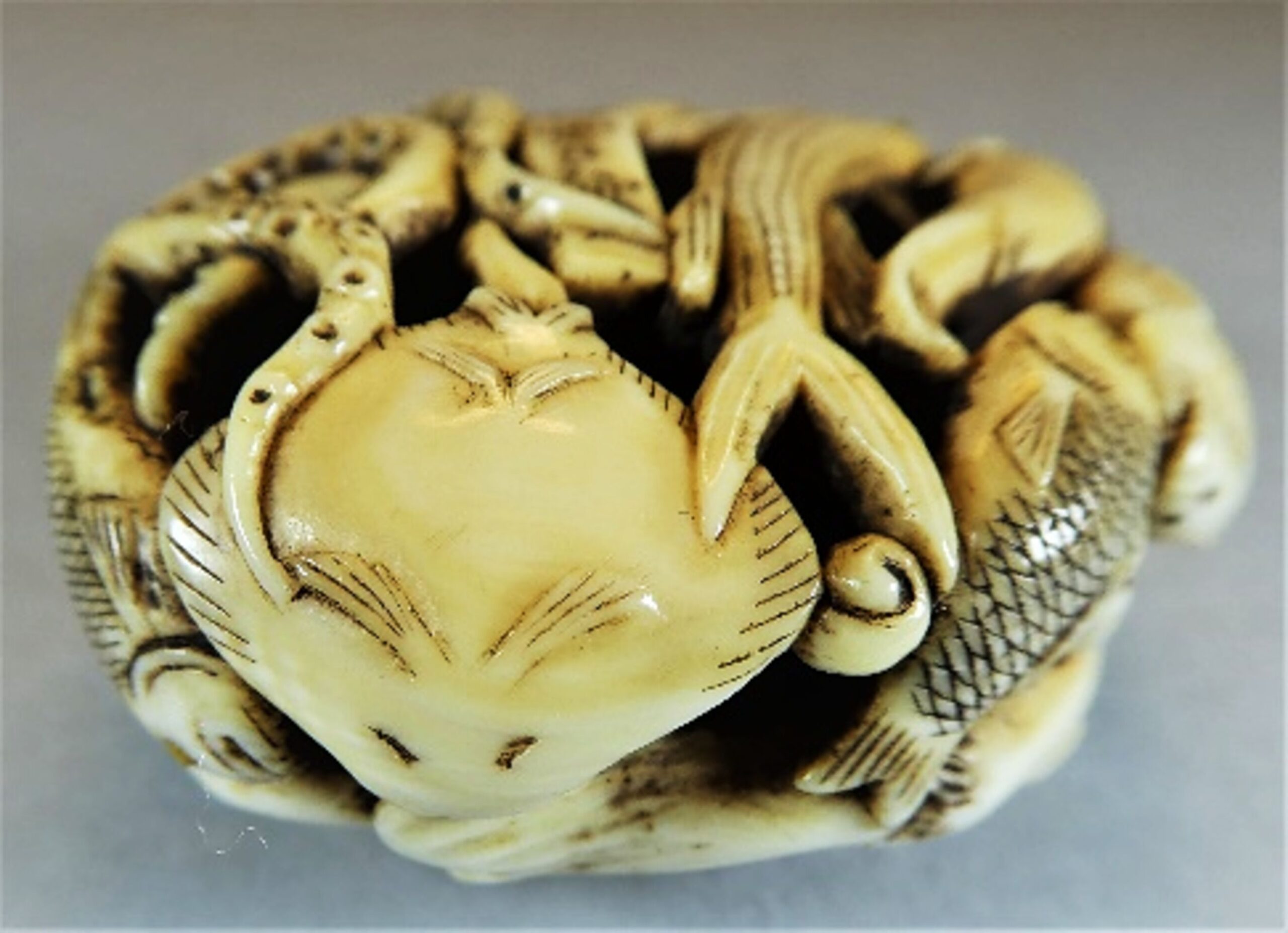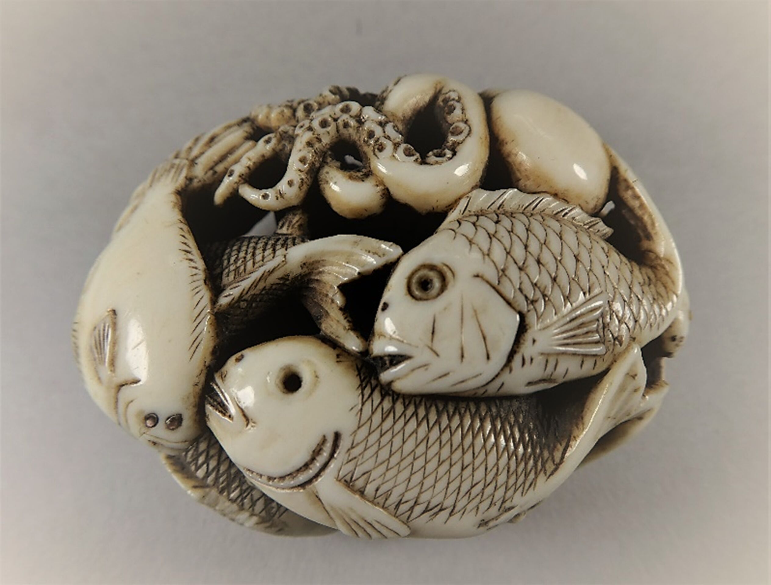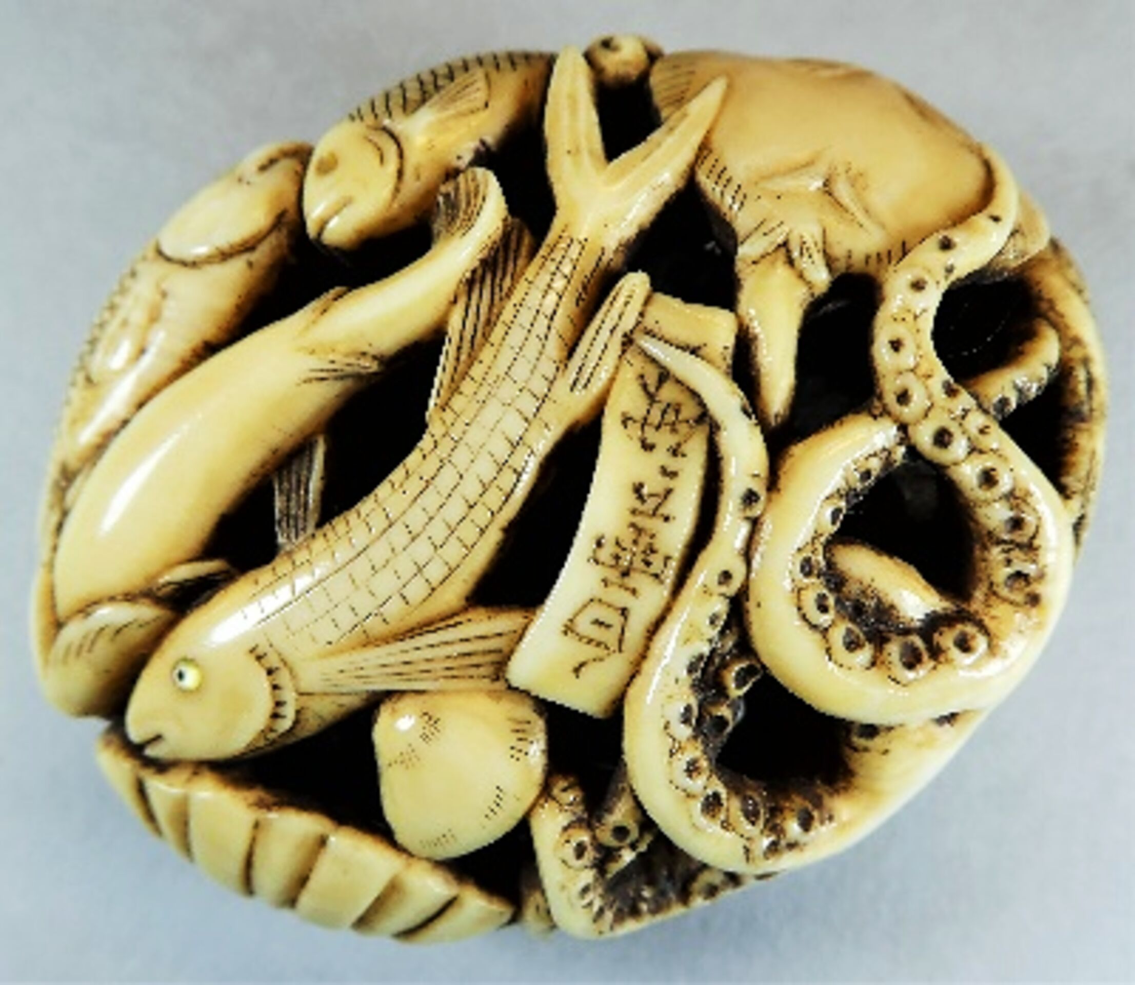Oval gearbeitetes Elfenbein-Ryûsa. Rundum und durchbrochen beschnitzt mit 9 verschiedenen Fischen, einer grossen und einer kleinen Muschel, einem Oktopus und einem Mantarochen. Augen der Tiere zum Teil eingelegt in Perlmutt. Helles Elfenbein, unterseitig bereits eine gewisse Patina. Dort auch auf einer länglichen Flagge die Signatur HAKUUNSAI, (K195, K398, K497). Feine originelle Arbeit, die Formen der Tiere sind den Rundungen des Stücks erfinderisch angepasst. Länge 50mm, Alter, ca. Mitte 19.Jh. Mit dieser Signatur ist mir kein ähnliches Stück bekannt.