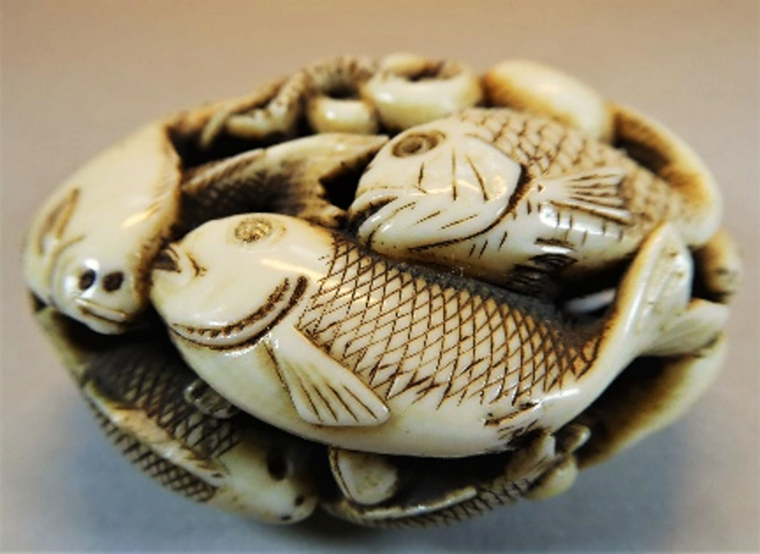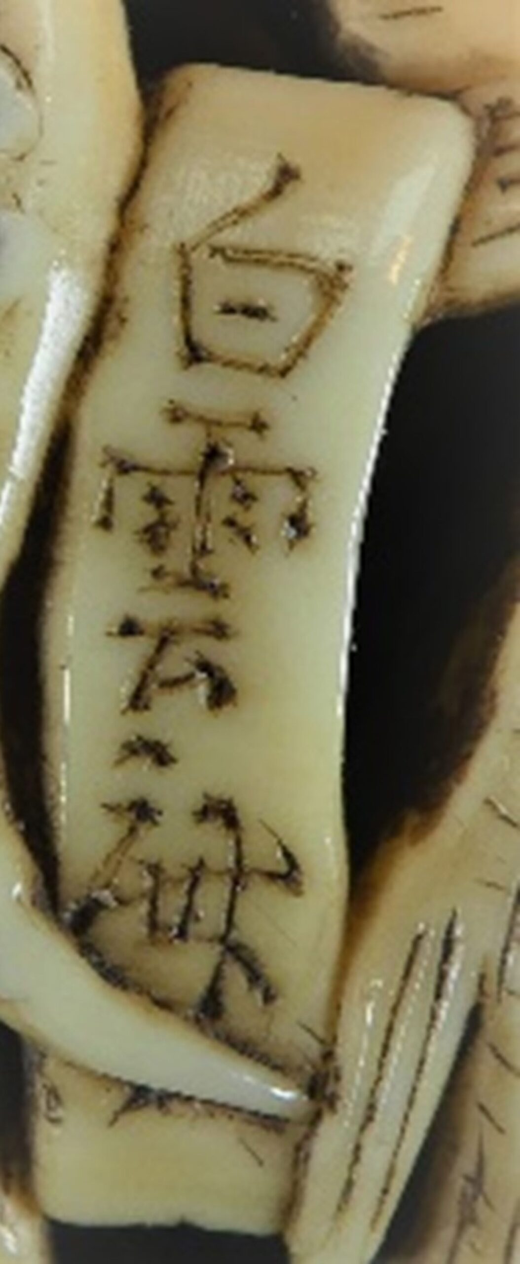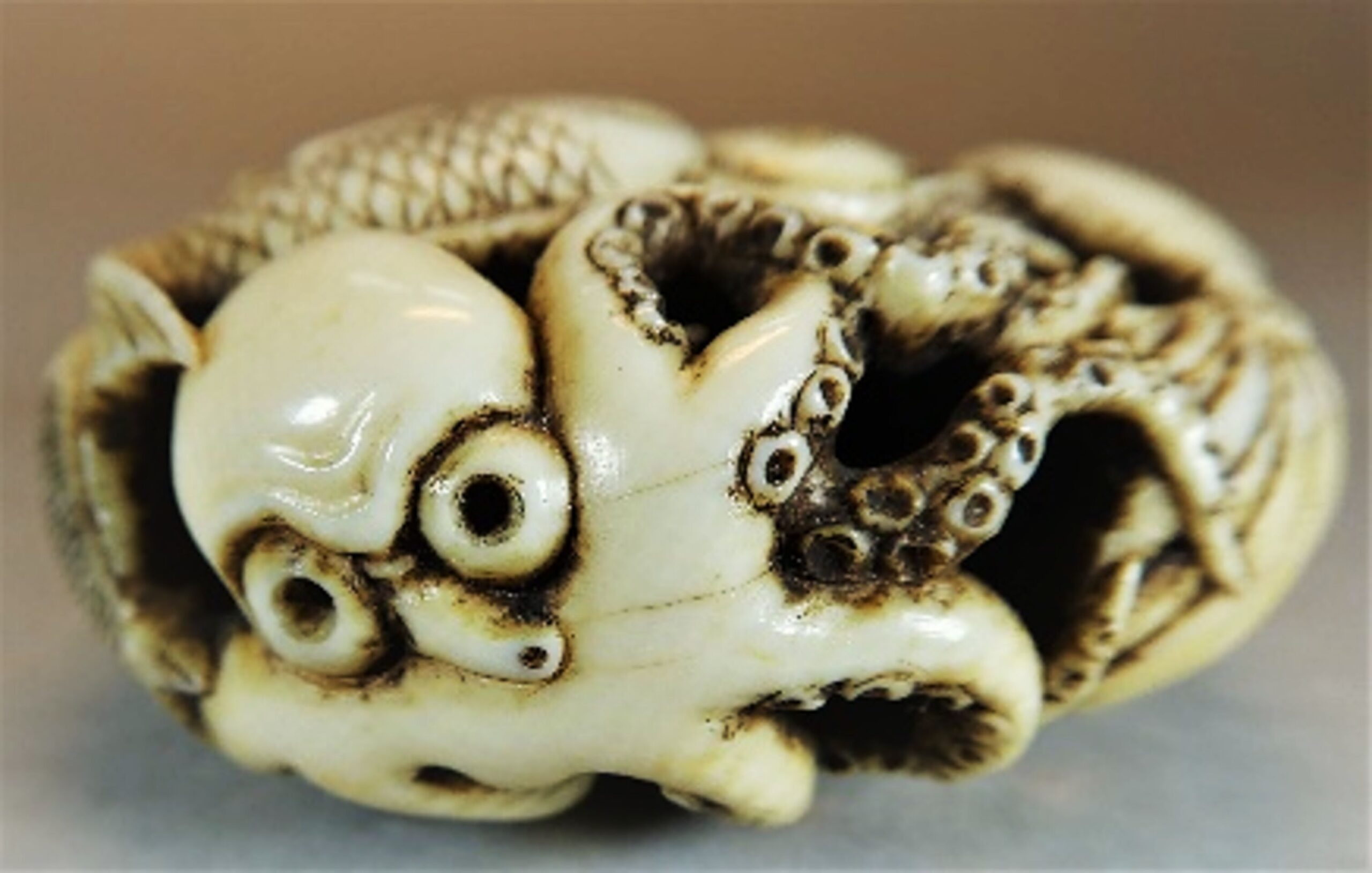Oval gearbeitetes Elfenbein-Ryûsa. Rundum und durchbrochen beschnitzt mit 9 verschiedenen Fischen, einer grossen und einer kleinen Muschel, einem Oktopus und einem Mantarochen. Augen der Tiere zum Teil eingelegt in Perlmutt. Helles Elfenbein, unterseitig bereits eine gewisse Patina. Dort auch auf einer länglichen Flagge die Signatur HAKUUNSAI, (K195, K398, K497). Feine originelle Arbeit, die Formen der Tiere sind den Rundungen des Stücks erfinderisch angepasst. Länge 50mm, Alter, ca. Mitte 19.Jh. Mit dieser Signatur ist mir kein ähnliches Stück bekannt.