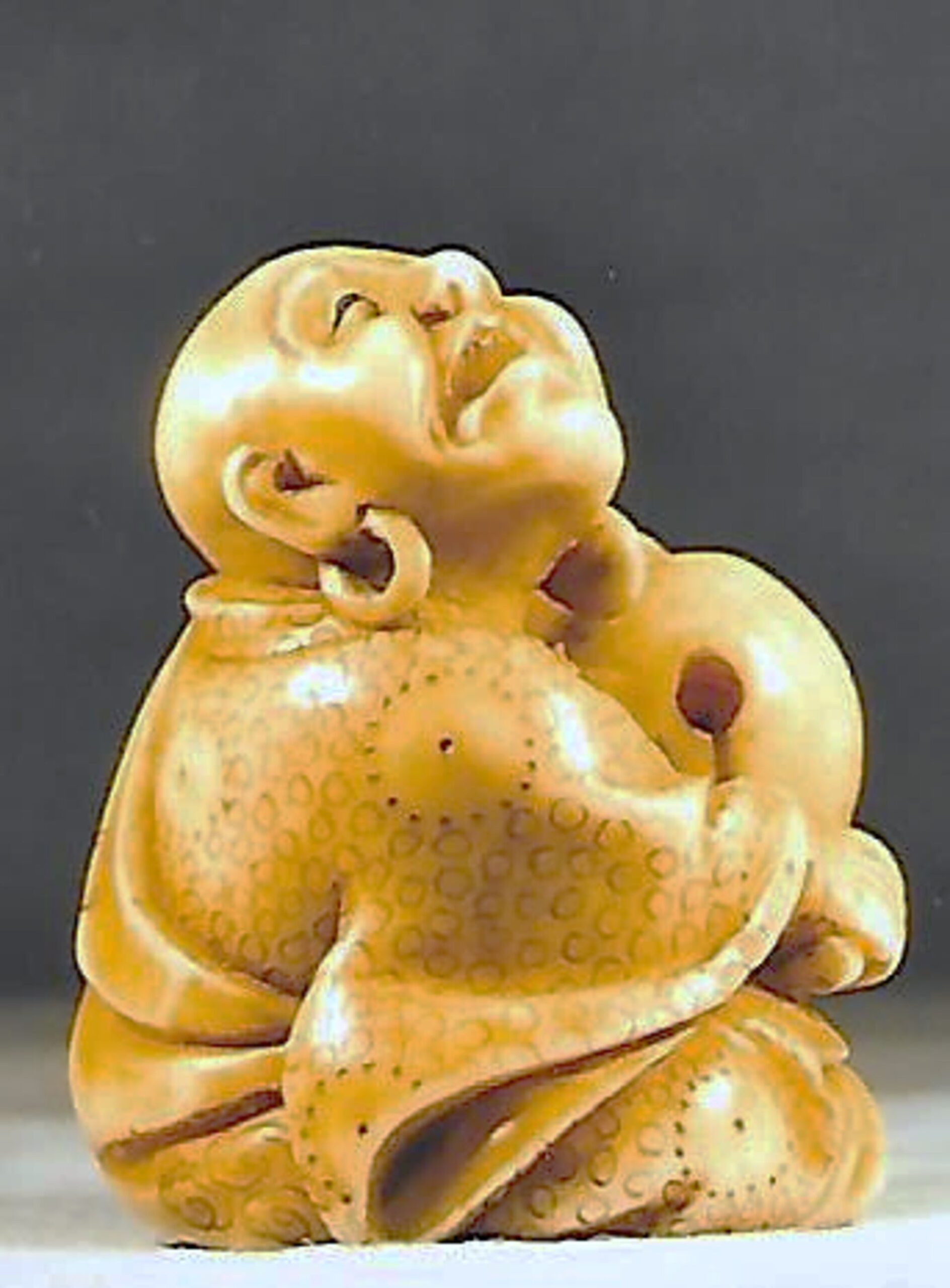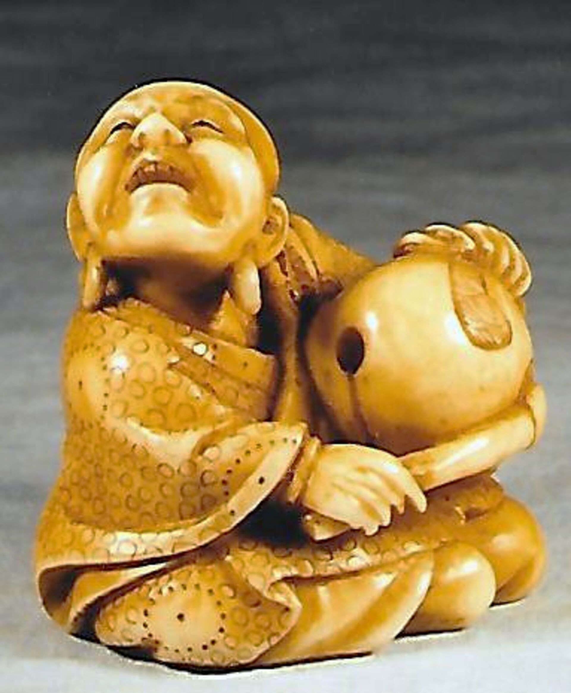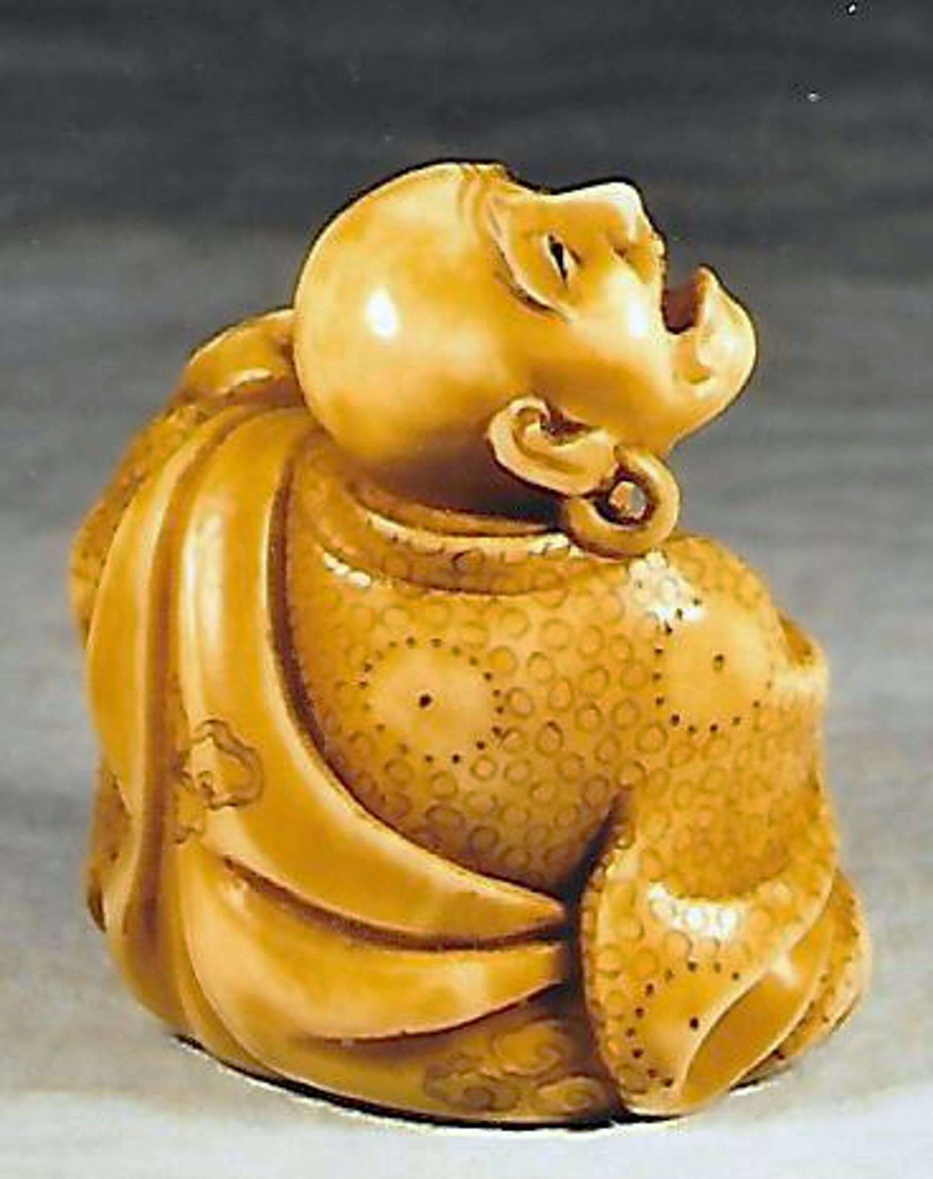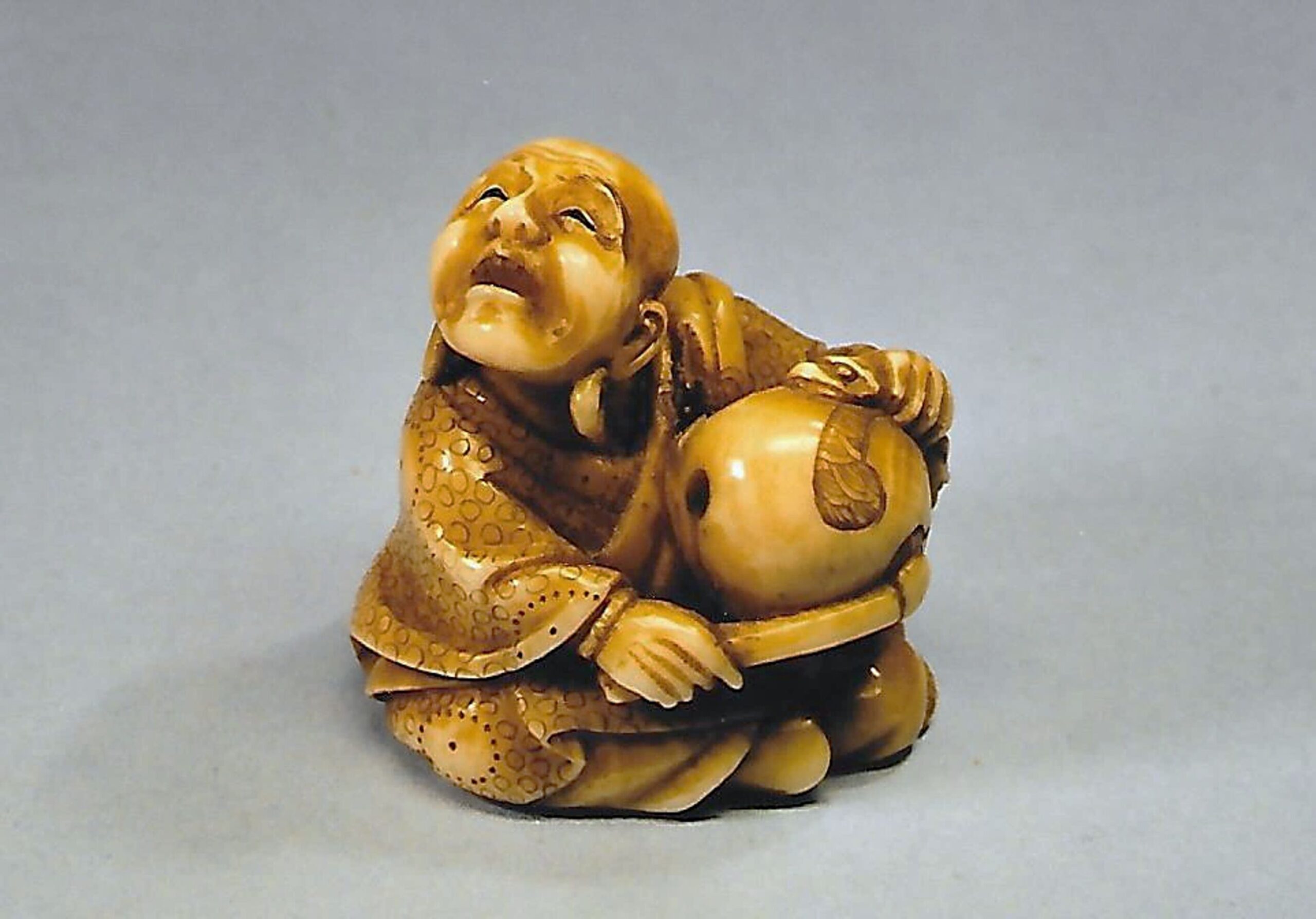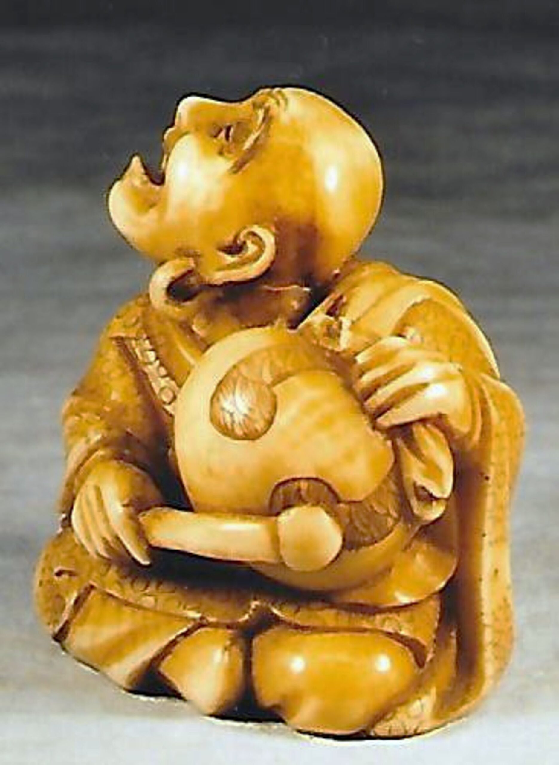 Elfenbein-Katabori. Ein glatzköpfiger Mönch mit Ohrringen sitzt mit untergeschlagenen Beinen auf dem Boden und lauscht verzückt dem Klang des hölzernen Gongs, Mokugyo, den er mit einem Schlegel, den er in der rechten Hand hält, anschlägt. Der Griff des Gongs ist aus zwei Drachen gebildet. Das Gewand des Mannes ist mit kleinen und grossen Ringen dekoriert, sein Schal mit einem Wolkenmotiv. Höhe 34mm, das Elfenbein ist etwas gefärbt. Das Stück dürfte aus der Mitte eines Elefantenzahns stammen, denn von der linken Schulter bis zur Basis ist der Nervenkanal offen und bildet zwischen den beiden unterseitigen, umringten Himotoshi einen Sprung. An der Basis auch die Signatur YOSHIKAZU (K312, K141). Alter: vermutlich spätes 19. Jh.