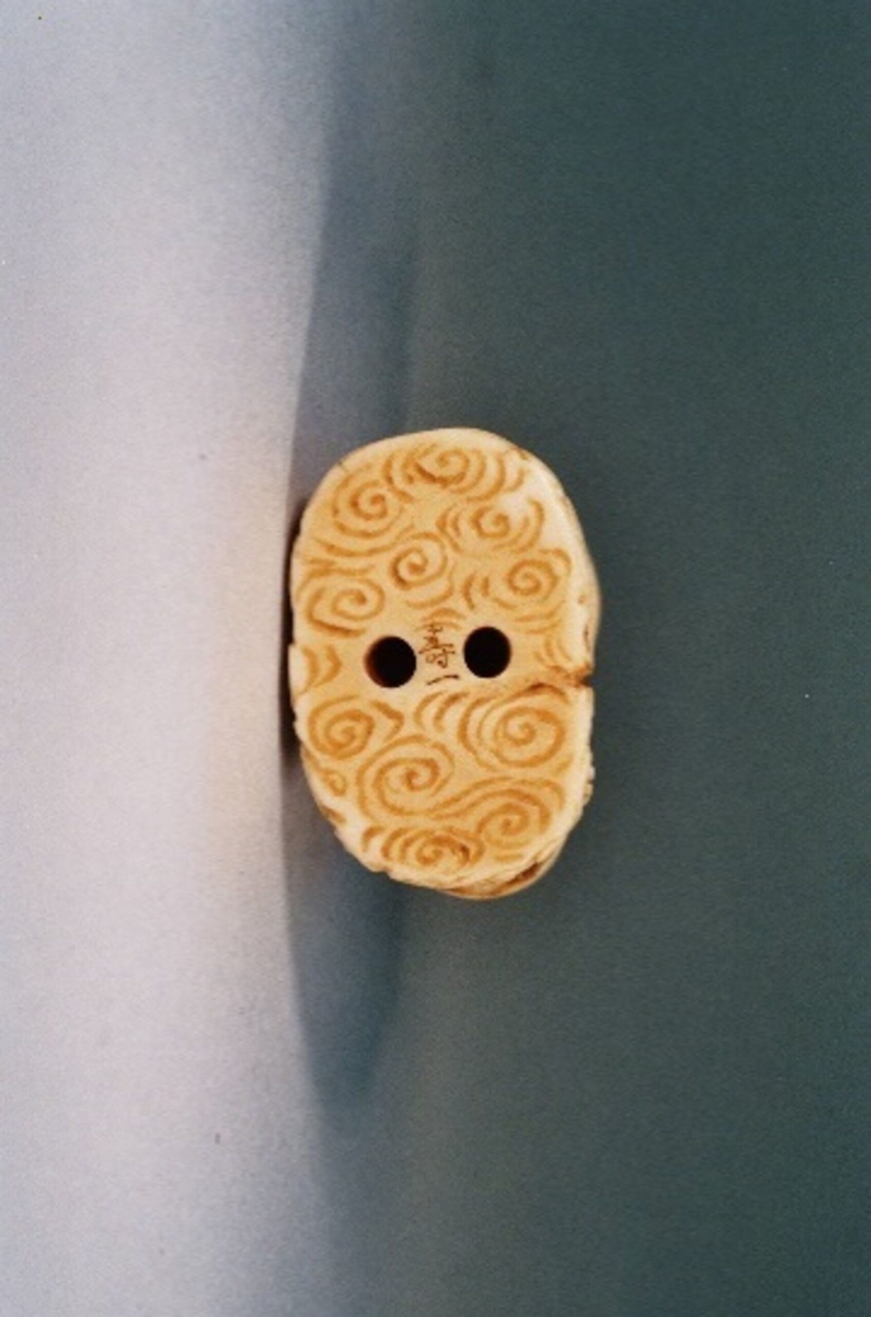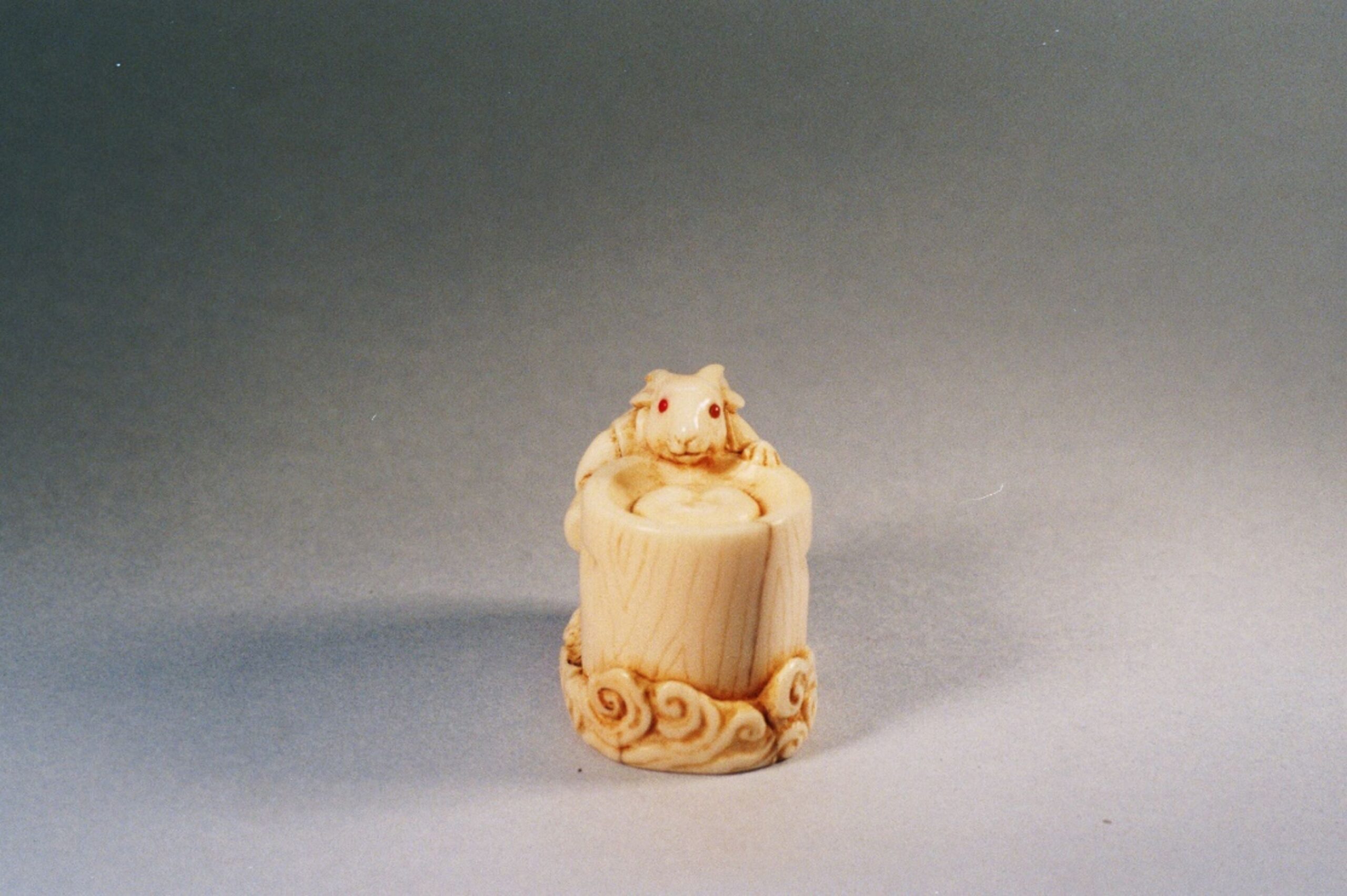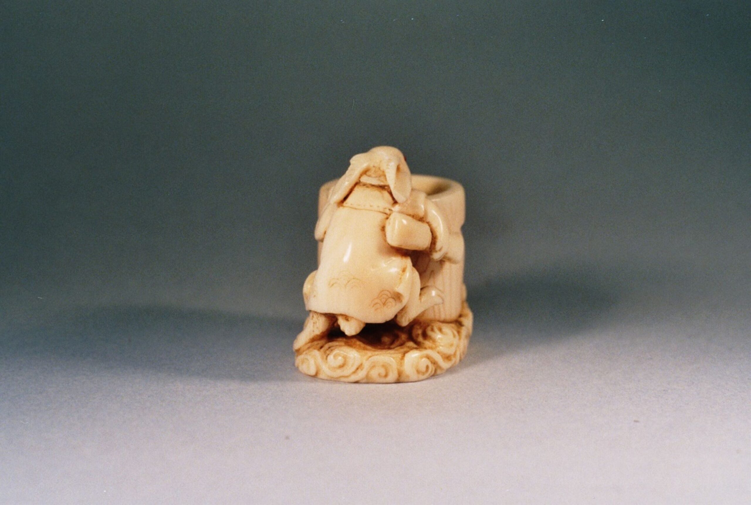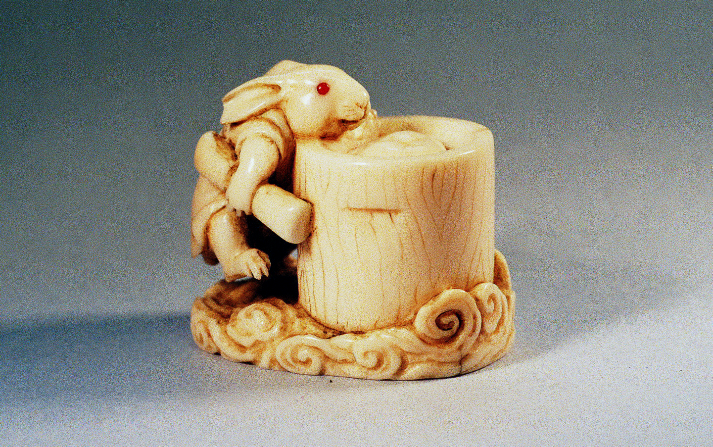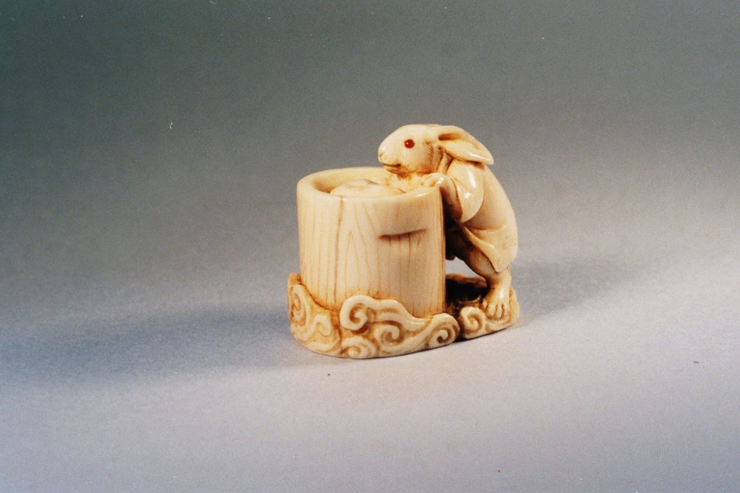 Elfenbein-Katabori. Auf einer Wolkenbasis steht der freundliche Mondhase, gekleidet in ein kurzärmeliges Mäntelchen, das mit Wellendekor verziert ist. Vor sich hat er einen grossen Mörser mit Holzmaserung, zu dem er kaum hinaufreicht. Darin liegt ein rundes Reisküchlein Mochi. In der rechten Vorderpfote hält er den Stössel. Die Augen sind rot eingelegt. Unterseitig zwei kleine Himotoshi. Zwischen diesen die Signatur TERAICHI (K227, K141). Höhe 30mm, Alter: ca. 1900. Ein sehr freundliches Stück.