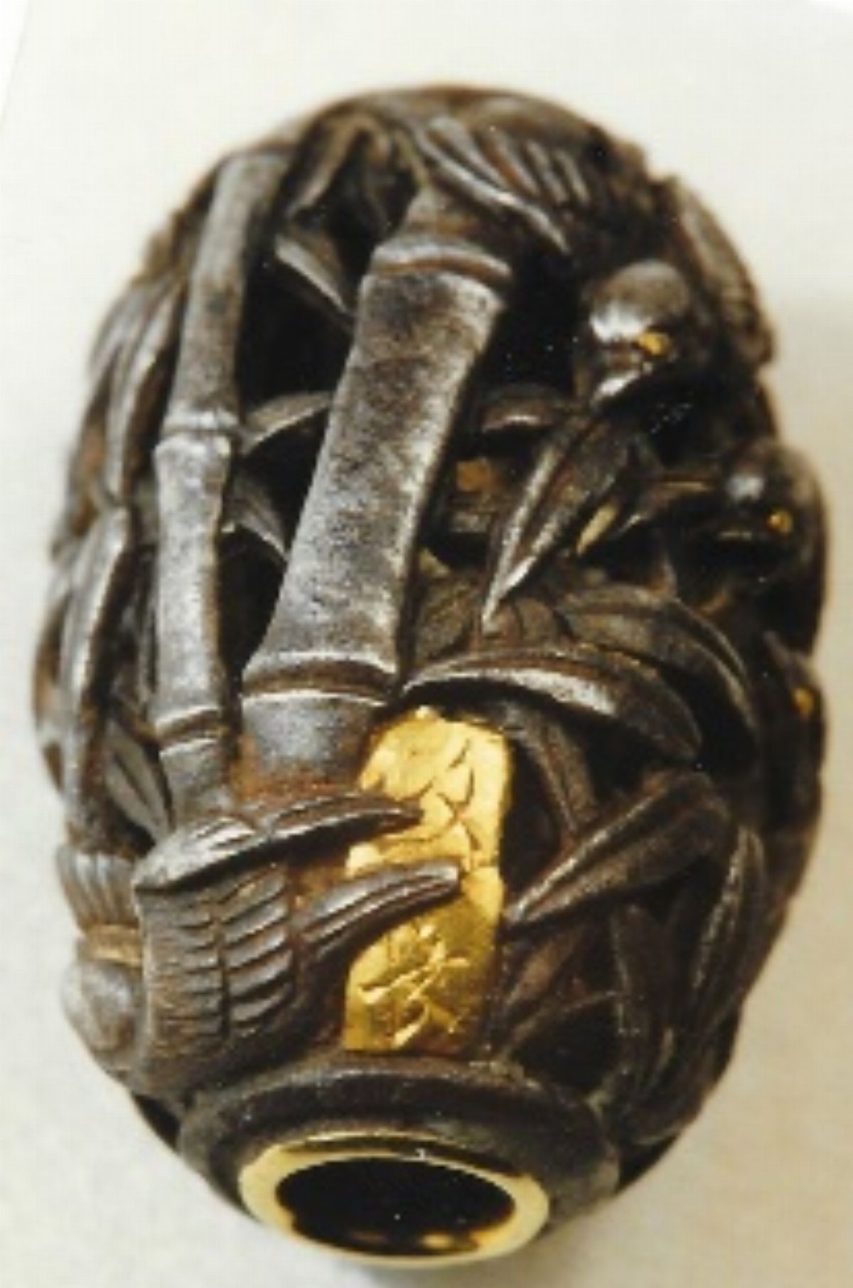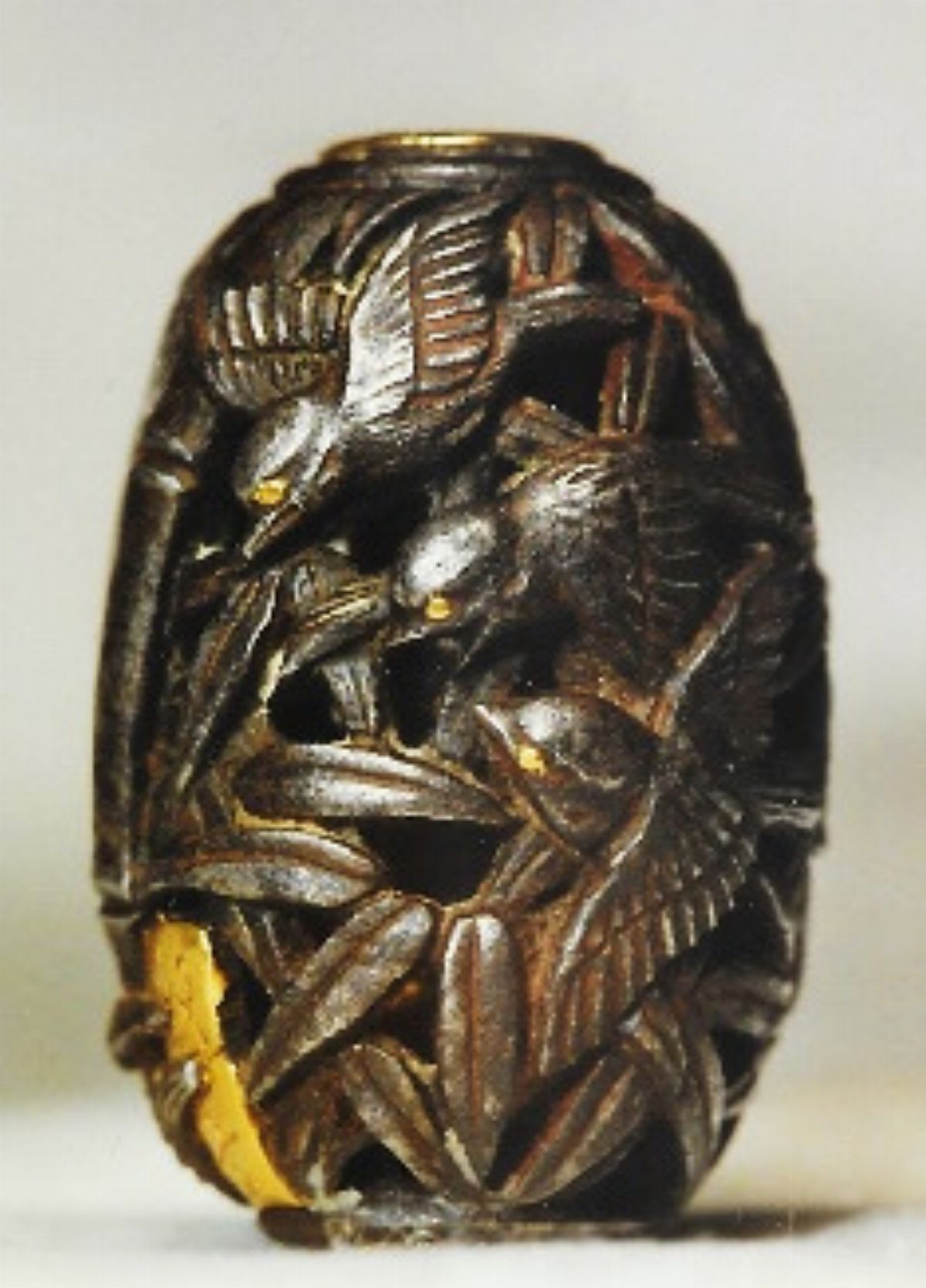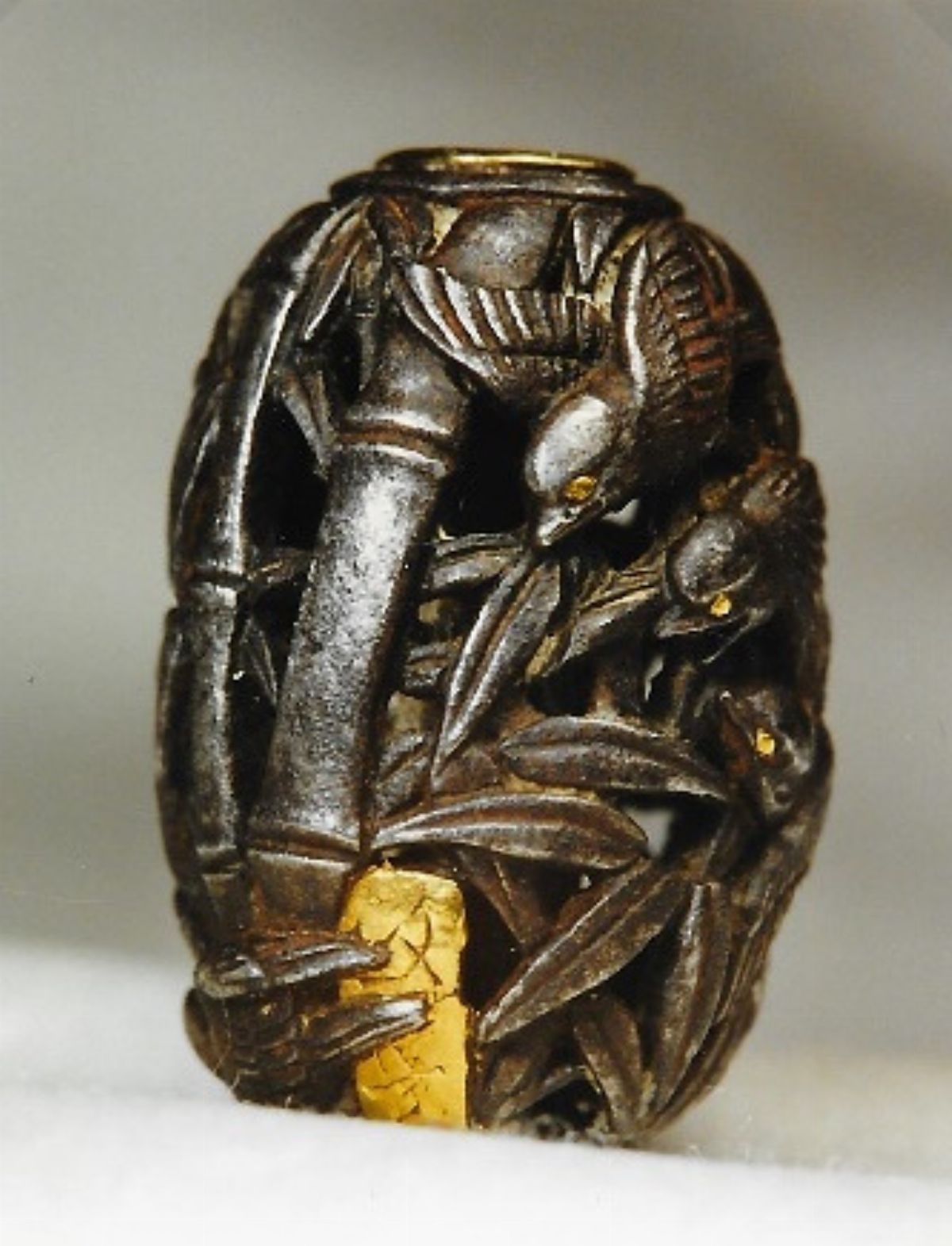 Bambus in Eisen, die zentrale Hülse, die Augen der Spatzen und das Plättchen mit der Signatur in Gold. Signatur: MASANAGA (Eisuke Masanaga, Schüler von Ishiguro Masahiro).