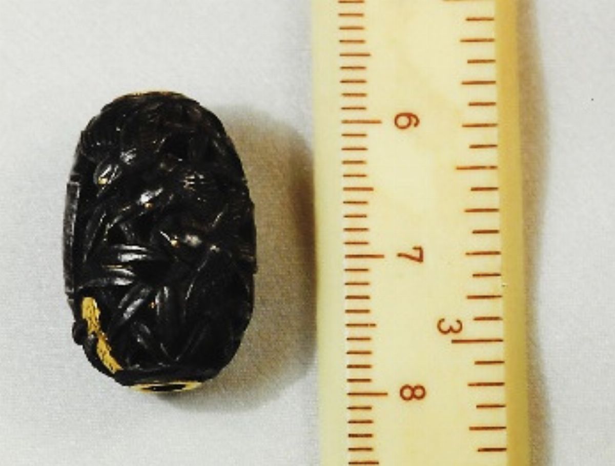 Zylindrisches Ojime, Eisen und Gold, Höhe 21mm, Ø 14mm. Hohl gearbeitet, Spatzen und