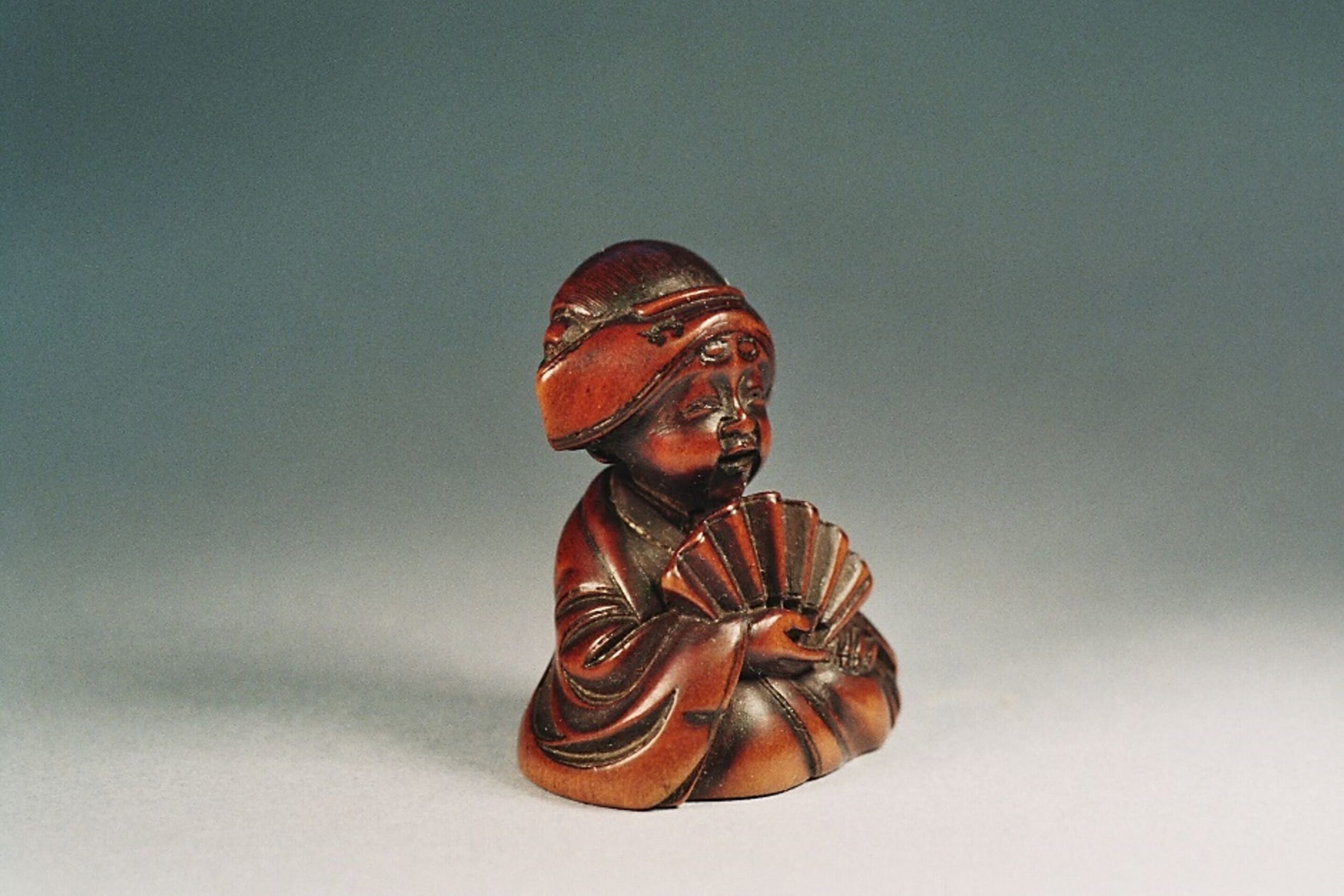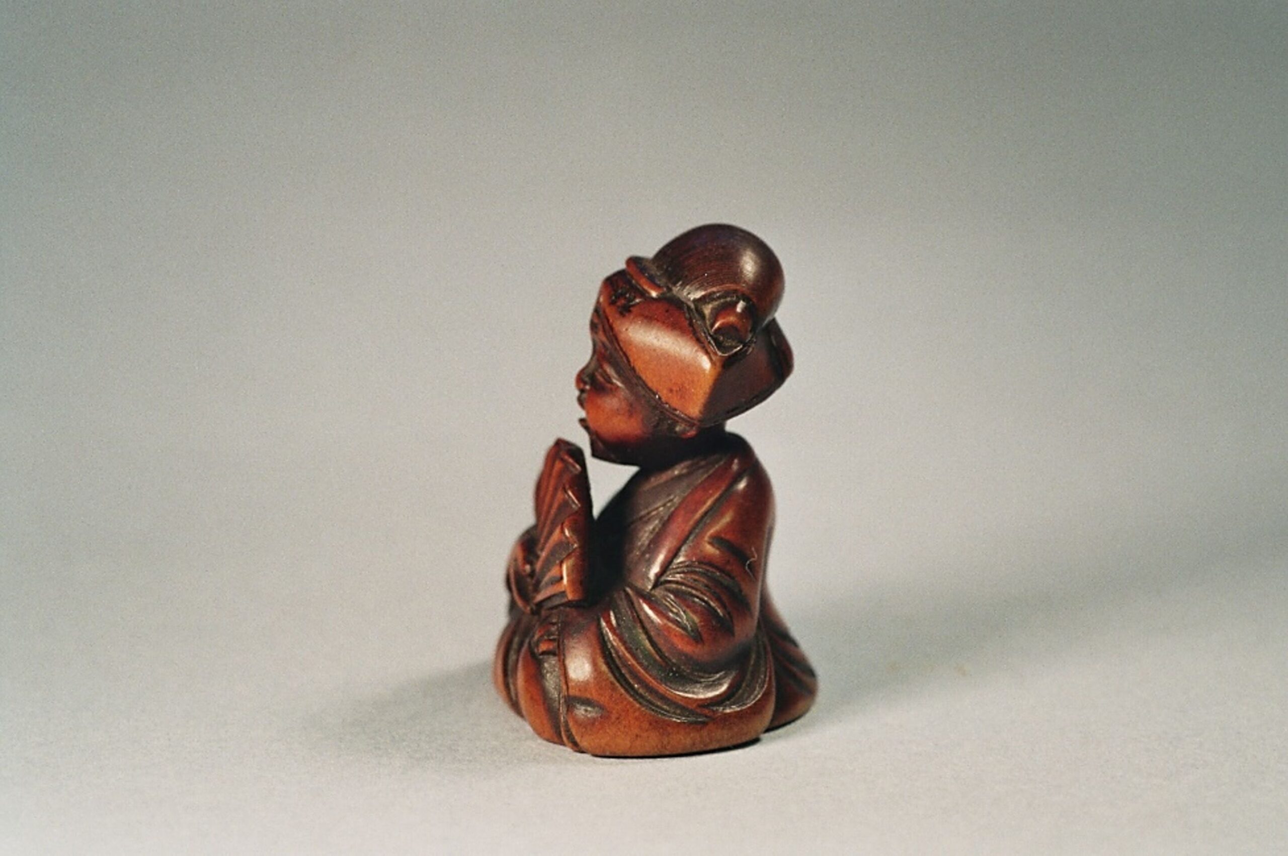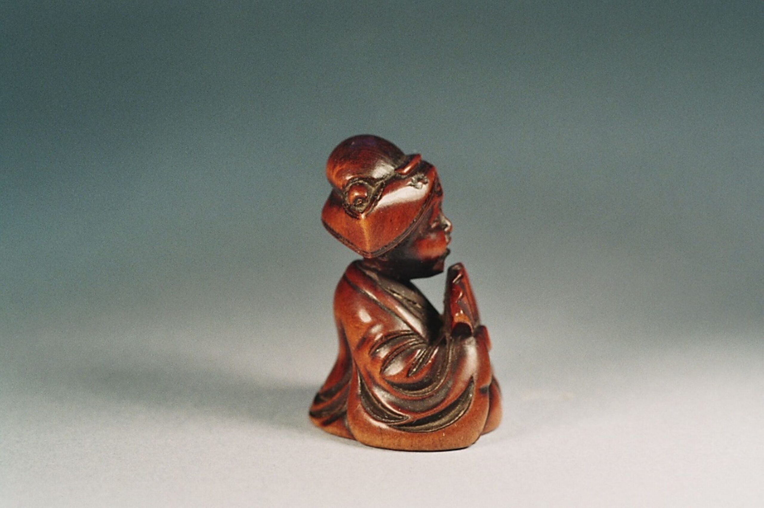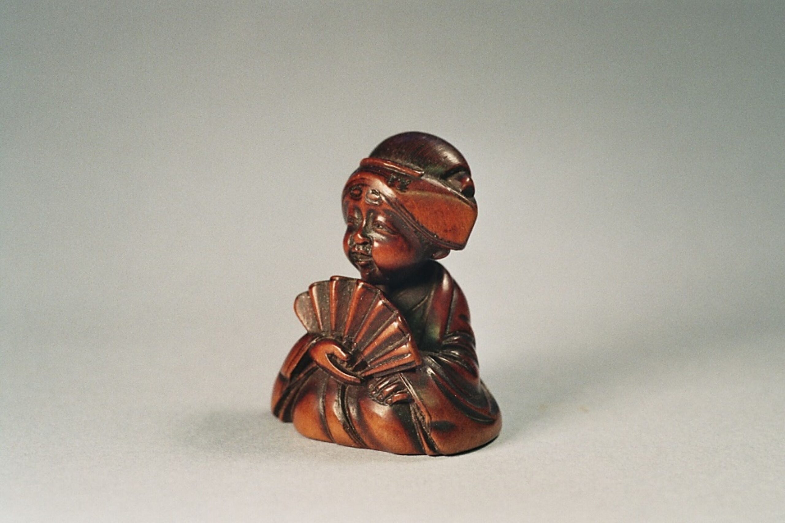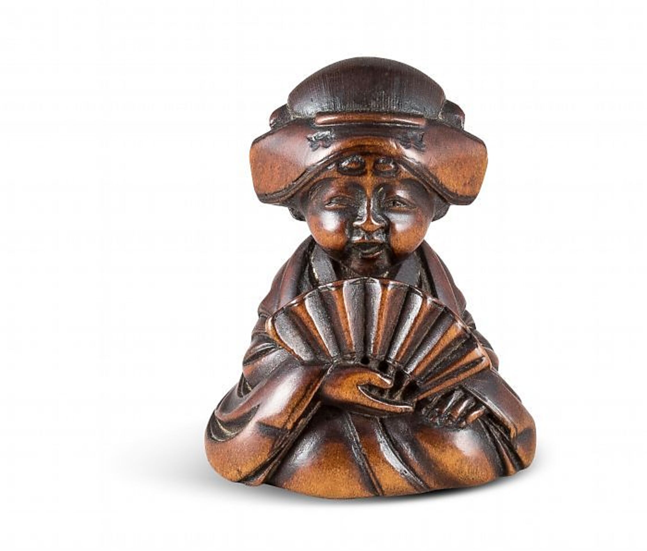 Kleines Holz-Katabori. Kirschholz mit schöner glänzender Patina. Okame als freundliche Braut, kniend im Kimono (deutsch „Anziehding“ von kiru = anziehen und mono = Ding), das traditionelle Tsuno-kakushi-Tuch um die sorgfältig hoch gesteckte Frisur geschlungen. Einen geöffnetem Faltfächer in der Rechten. Unterseitig zwei ungleich grosse, nicht umrandete Himotoshi, das grössere oval und sehr gross. Unterseitig auch die Signatur SHUMIN saku (K220, K299, K233), Höhe 30mm. Alter ca. 1.H.19. Jh.