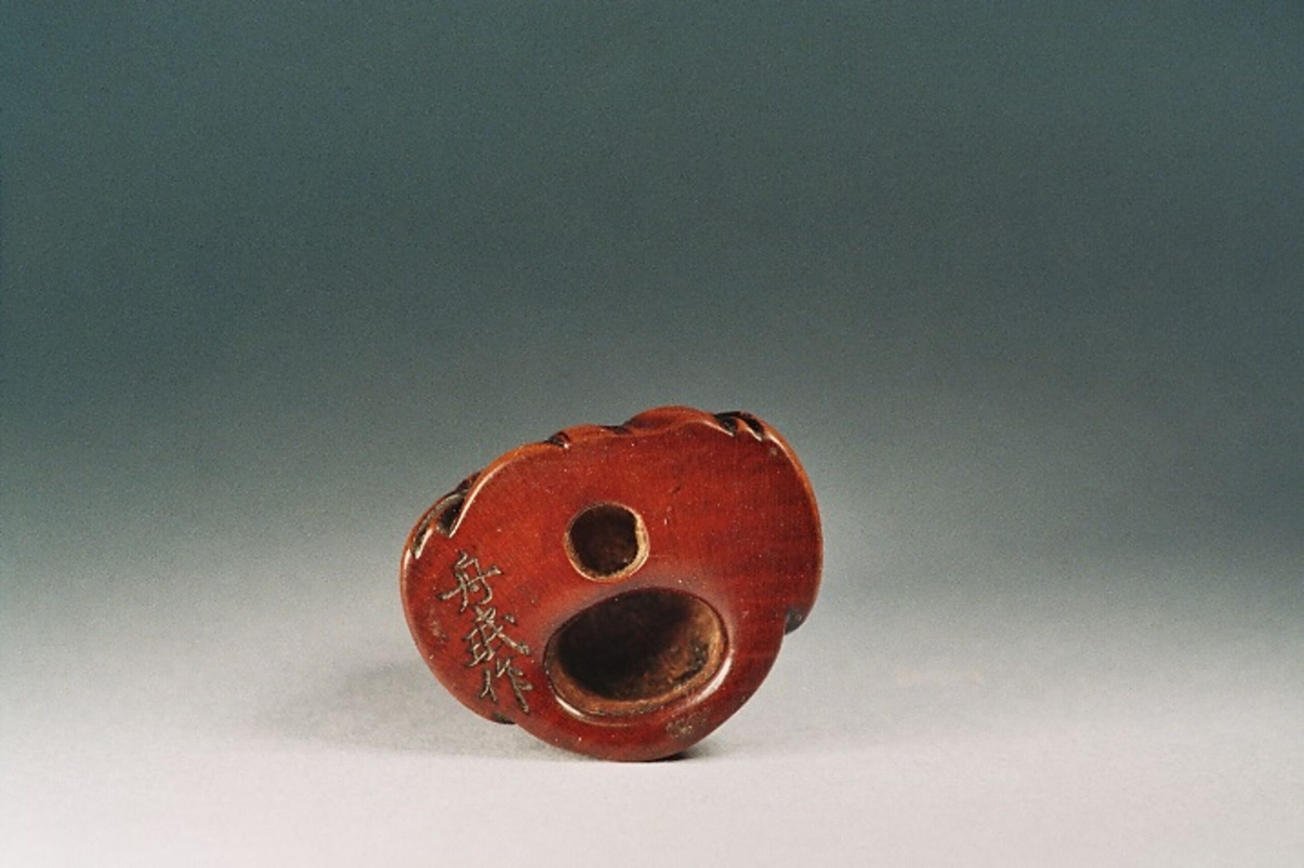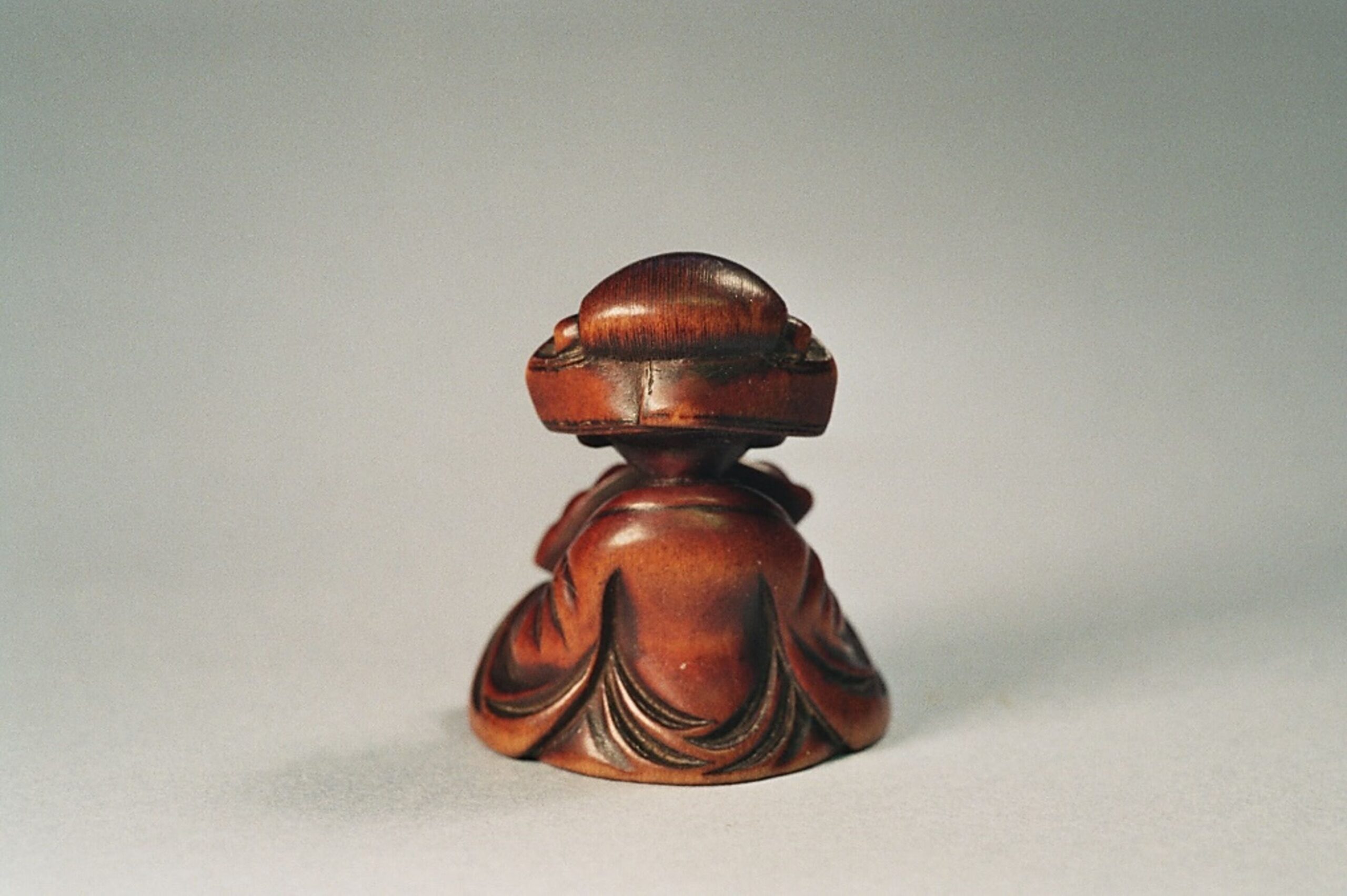 SHUMIN: der Signatur nach handelt es sich um Shumin II aus einer Tôkyôter Schnitzerschule (Shumin I-III). Die einschlägige Literatur datiert ihn in die 1. Hälfte des 19.Jh. Das Stück könnte von Shumin II oder einem Schüler stammen, der dieselbe Signatur verwendete. Shumin III käme ebenfalls in Frage, er wird in die Mitte des 19.Jh. datiert, doch Meinertzhagen in MCI p.777 stellt in einer Handnotiz von 1951 die Existenz eines Shumin III in Frage. Das umseitige etwas plumpere Vergleichsstück aus Magnolienholz trägt dieselbe Signatur und wird im Auktionskatalog von Frau Klefisch ebenfalls ins frühe 19.Jh. datiert.