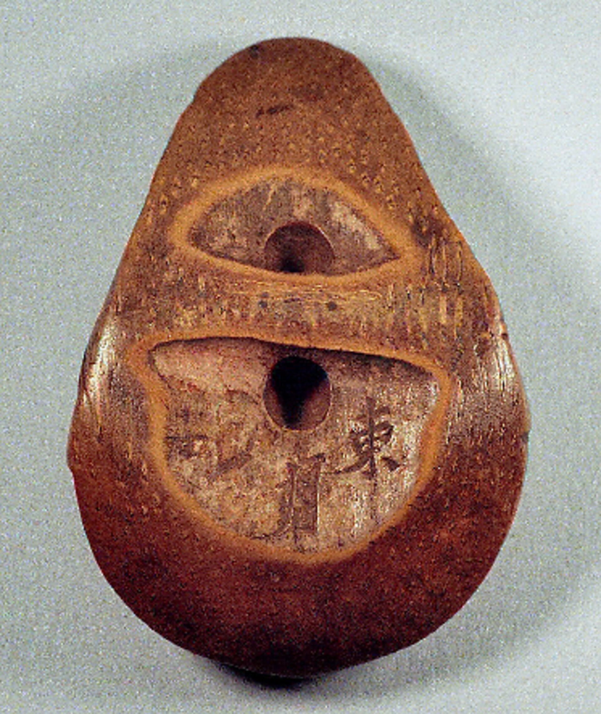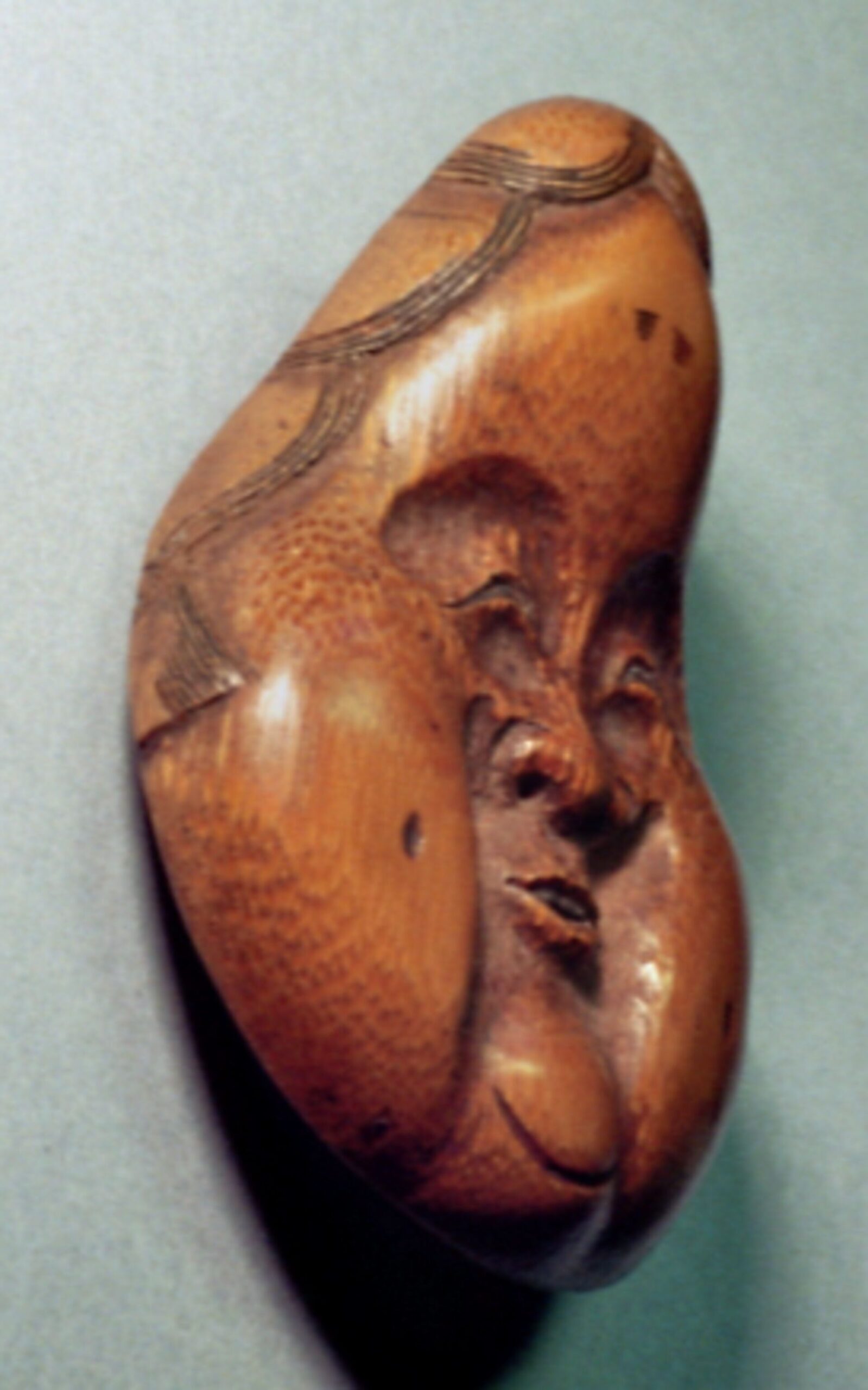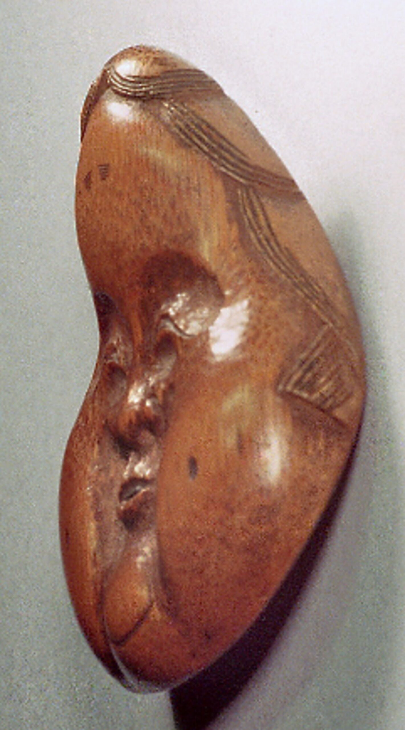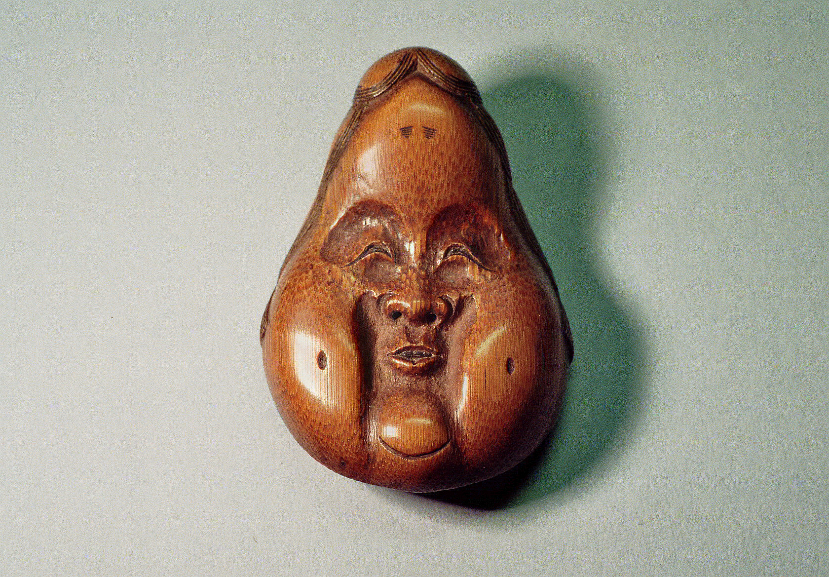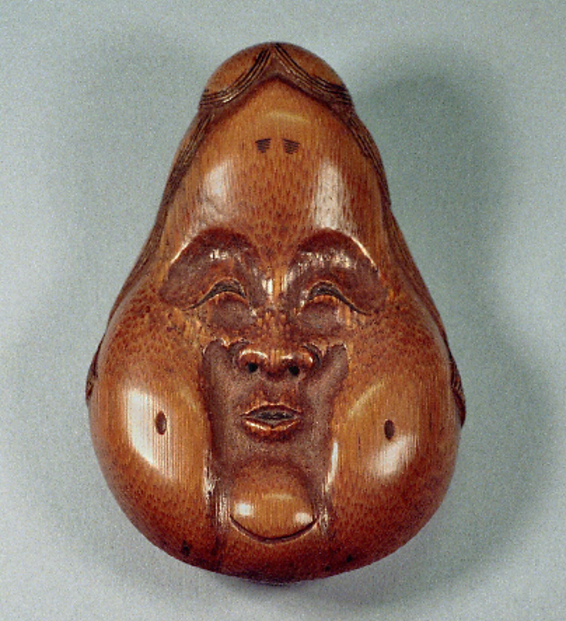 Bambusmaske der heiteren Göttin der Sinnlichkeit. Extrem birnenförmig. Bambus, 53mm, schöne Glanzpatina mit Gebrauchspuren, rückseitig signiert TOGETSU (K 279, K183) = „Ostmond“. Alter: vermutlich 2.H. 19.Jh.