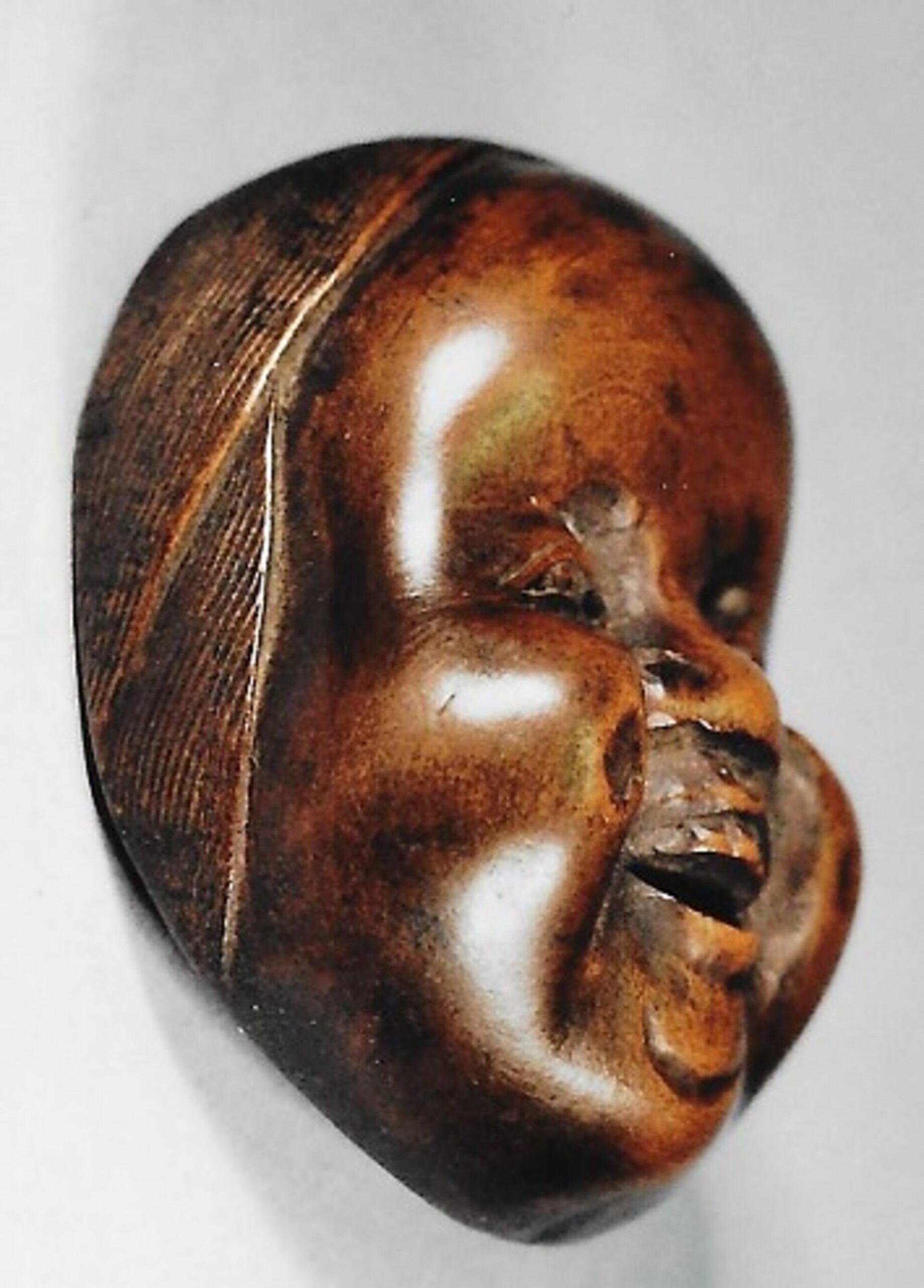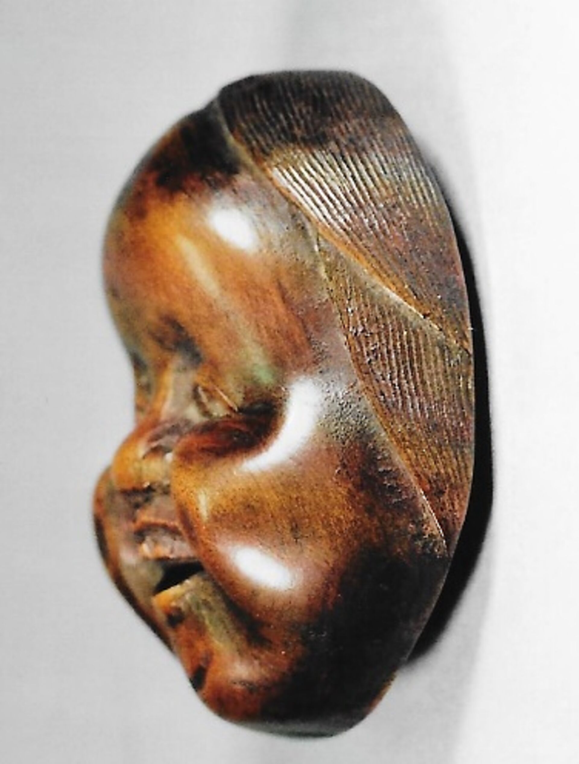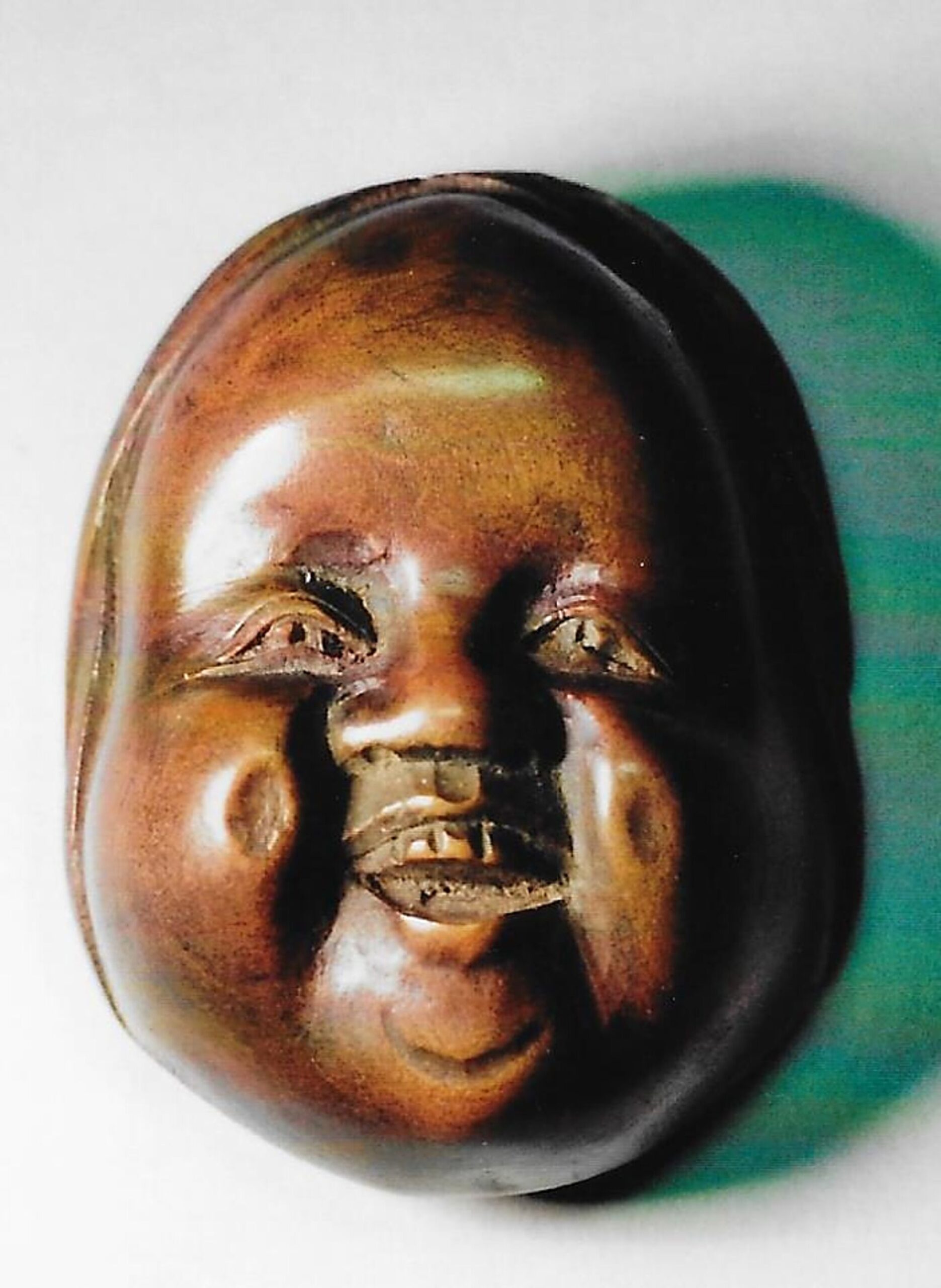 Holz-Maske. Maske der Shintö-Fruchtbarkeitsgöttin Okame. Pausbäckig lachend, Grübchen in den Wanken, obere Zahnreihe zeigend. Buchsbaumholz, dunkel gefärbt, 47mm. Auf dem Steg hinten links die Signatur: Ichi-ko (K141, K229) = IKKO. Alter: Mitte 19.Jh.,