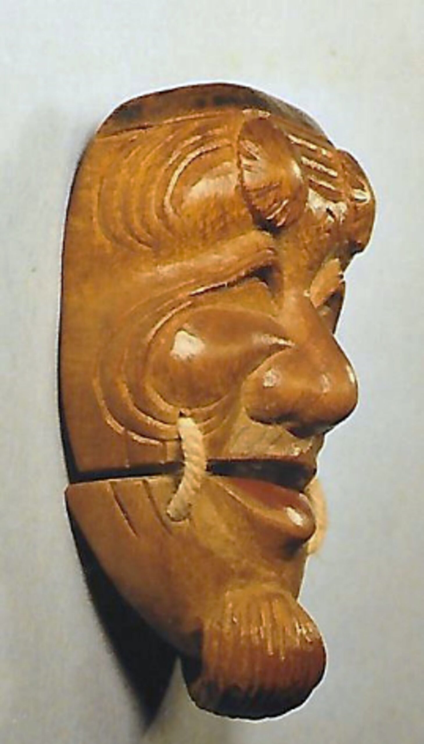 Holzmaske eines lachenden alten Mannes mit lebhaftem Ausdruck. Runzeln und zwei runde Haarbüschel auf der Stirn. Die Augen sind zur Gänze ausgeschnitten. Lachfalten an den Augen Richtung Wangen und abwärts. Im Oberkiefer zwei schwarze Zähne. Der Unterkiefer ist beweglich und mit Schnüren gehalten. Die Unterlippe ist gerötet, der lange Bart nach hinten umgeschlagen und in die Hinterseite der Maske gelegt. Hinten auf dem horizontalen Steg die Signatur MANNEN (K150; K221). Höhe 43mm, Alter: vermutlich 2. Hälfte 19.Jh.
