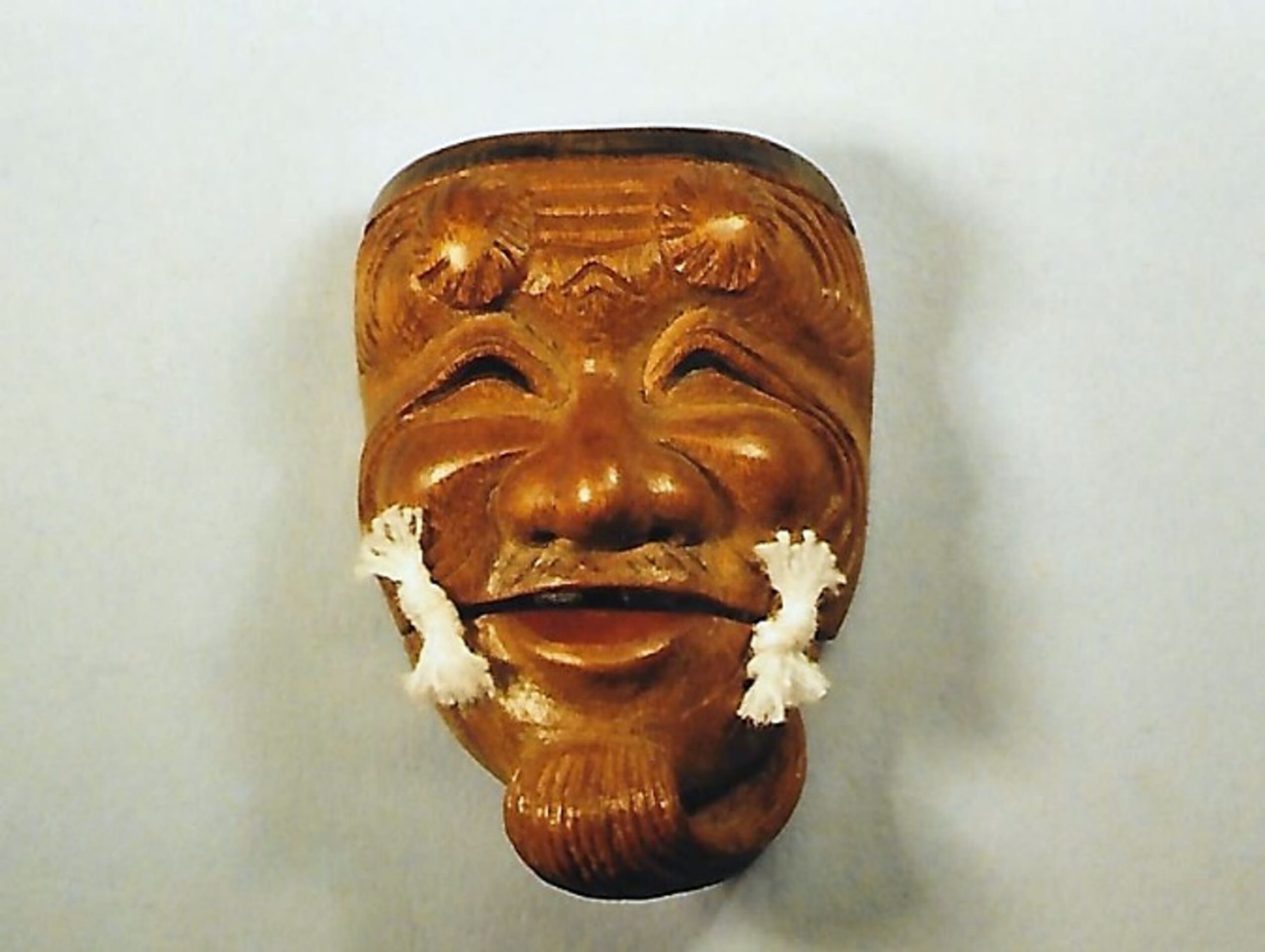 Okina, bedeutet „alter Mann“, Sammelname für die Tänze Okina, Senzai und Sambasô, älter als die Nô-Tradition, ursprünglich religiös und nur von Priestern aufgeführt. Bis heute ein religiöser Tanz, der zu Jahresanfang und bei besonderen Anlässen in Tempeln und Schreinen zum Dank und für Bitten… aufgeführt wird. Soll als Segen für langes Leben und Fruchtbarkeit gelten, festlich und fröhlich aufgeführt werden. Wird bei besonderen Gelegenheiten auch im Nô-Theater aufgeführt. Okina im engeren Sinn. Ist ein erhabener und heiterer Tanz, ein hochgeachteter alter Mann bewegt sich gemessen und rituell in symbolischer Bedeutung. Sambasô, im Gegensatz dazu, ist ein ausgelassener komischer Tanz, der von einem Kyôgen-Schauspieler ausgeführt wird. – Die Okinamaske, die eigentlich Hakushiki-jô heisst, „weisser alter Mann“, im Gegensatz zu der, abgesehen von der Farbe identischen Sambasô-Maske Kokushiki-jô „schwarzer alter Mann“, wird in grossen Ehren gehalten. Es ist die einzige Maske, die der Schauspieler auf offener Bühne anlegt, nachdem er sich rituell gereinigt hat. Er nimmt die Maske aus einer Lackschatulle, die auf einem kleinen Altar ruht, und konfrontiert sich mit ihr, um gleichsam ihre Essenz in sich aufzunehmen. Dann kehrt er die Maske um und, indem er sich verbeugt, fügt er sein Gesicht in die Maske ein. Ein Gehilfe schnürt die Maske um seinen Kopf. Im Gegensatz zu anderen Masken, bei denen lediglich die Pupillen ausgeschnitten sind, sind bei Okinamasken, die Augen zur Gänze ausgeschnitten. Sie ist die einzige Maske, die aus zwei Teilen, mit separatem Kinn gefertigt wird, was bei Netsuke-Masken infolge der geringen Grösse meist nur angedeutet sichtbar ist. – Lit.: Bushell R, Netsuke Masks, 1985, p.82ff.