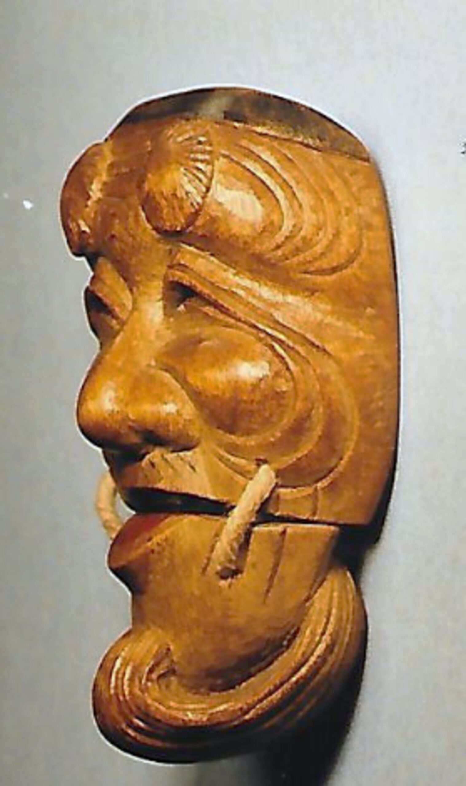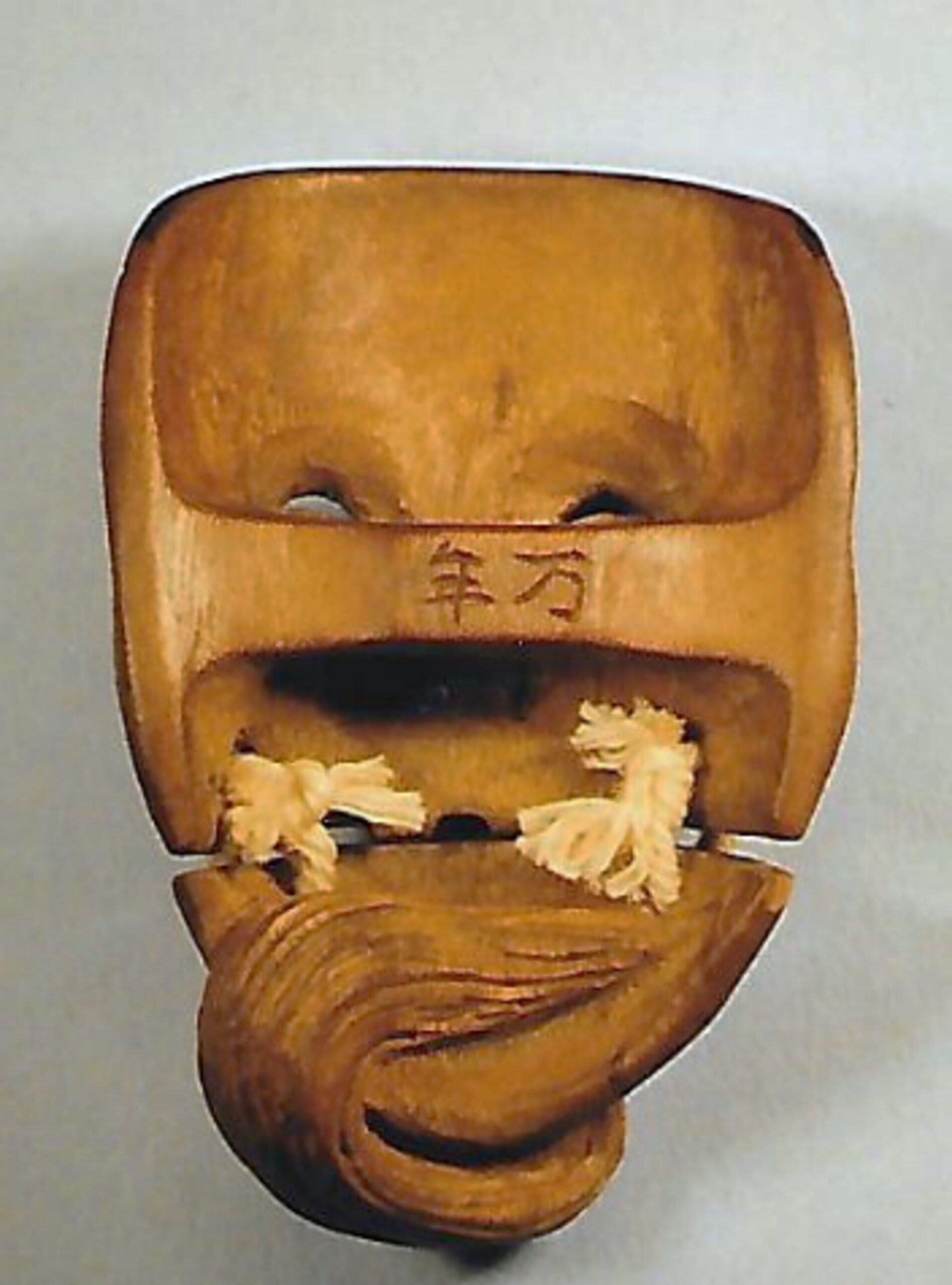 Mannen: Dieser Künstler ist nur mit einigen wenigen Masken in der Literatur vertreten. Bushell, Netsuke Masks, 1985, führt zwei Masken von ihm an und zeigt deren Signatur unter Nrn. 171 und 172.