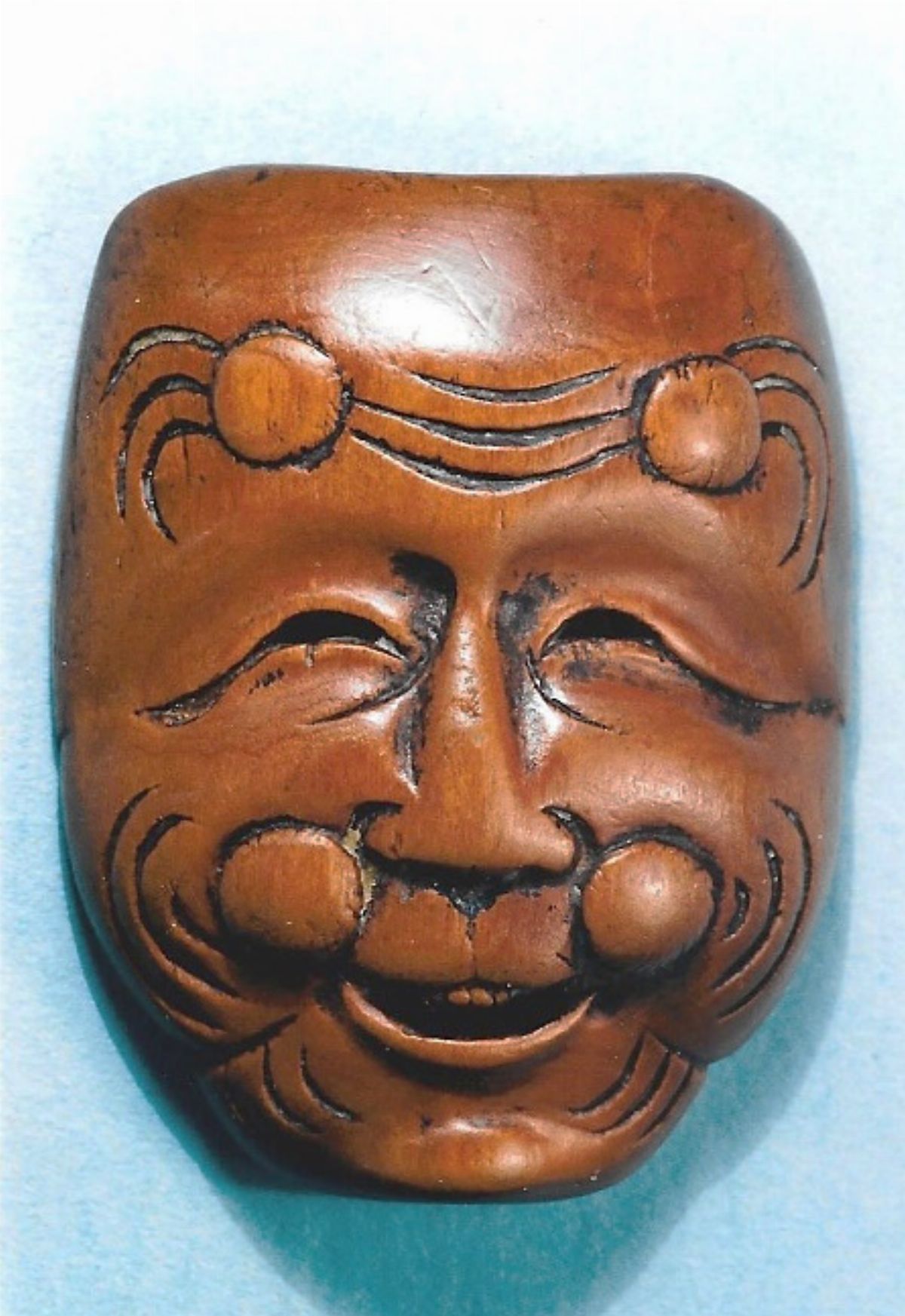 OKINA, bedeutet „alter Mann“, Sammelname für die Tänze Okina, Senzai und Sambasô, älter als die Nô-Tradition, ursprünglich religiös und nur von Priestern aufgeführt. Bis heute ein religiöser Tanz, der zu Jahresanfang und bei besonderen Anlässen in Tempeln und Schreinen zum Dank und für Bitten… aufgeführt wird. Soll als Segen für langes Leben und Fruchtbarkeit gelten, festlich und fröhlich aufgeführt werden. Wird bei besonderen Gelegenheiten auch im Nô-Theater aufgeführt. Ist ein erhabener und heiterer Tanz, ein hochgeachteter alter Mann bewegt sich gemessen und rituell in symbolischer Bedeutung. Sambasô, im Gegensatz dazu, ist ein ausgelassener komischer Tanz, der von einem Kyôgen-Schauspieler ausgeführt wird. – Die Okinamaske, die eigentlich Hakushiki-jô heisst, „weisser alter Mann“, im Gegensatz zu der, abgesehen von der Farbe identischen Sambasô-Maske Kokushiki-jô „schwarzer alter Mann“, wird in grossen Ehren gehalten. Es ist die einzige Maske, die der Schauspieler auf offener Bühne anlegt, nachdem er sich rituell gereinigt hat. Er nimmt die Maske aus einer Lackschatulle, die auf einem kleinen Altar ruht, und konfrontiert sich mit ihr, um gleichsam ihre Essenz in sich aufzunehmen. Dann kehrt er die Maske um und, indem er sich verbeugt, fügt er sein Gesicht in die Maske ein. Ein Gehilfe schnürt die Maske um seinen Kopf. Im Gegensatz zu anderen Masken, bei denen lediglich die Pupillen ausgeschnitten sind, sind bei Okinamasken, die Augen zur Gänze ausgeschnitten. Sie ist die einzige Maske, die aus zwei Teilen, mit separatem Kinn gefertigt wird, was bei Okina- oder Sambasô-Maske-Masken infolge der geringen Grösse meist nur angedeutet sichtbar ist. – Lit.: Bushell R., Netsuke Masks, 1985, p.82ff.