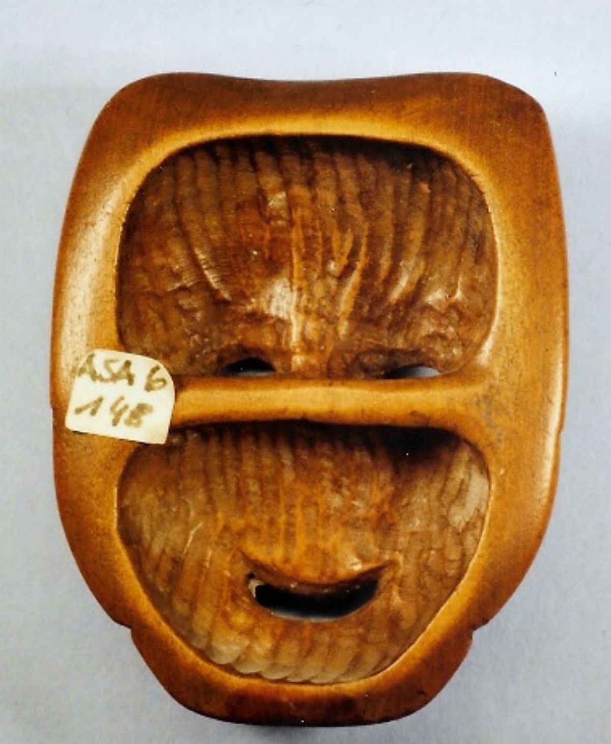 Holz-Maske, nicht gefärbt, um 1800, verschmitzter, schelmischer Ausdruck, gut abgegriffen. Öse auf der Rückseite. Höhe 51mm, nicht signiert.