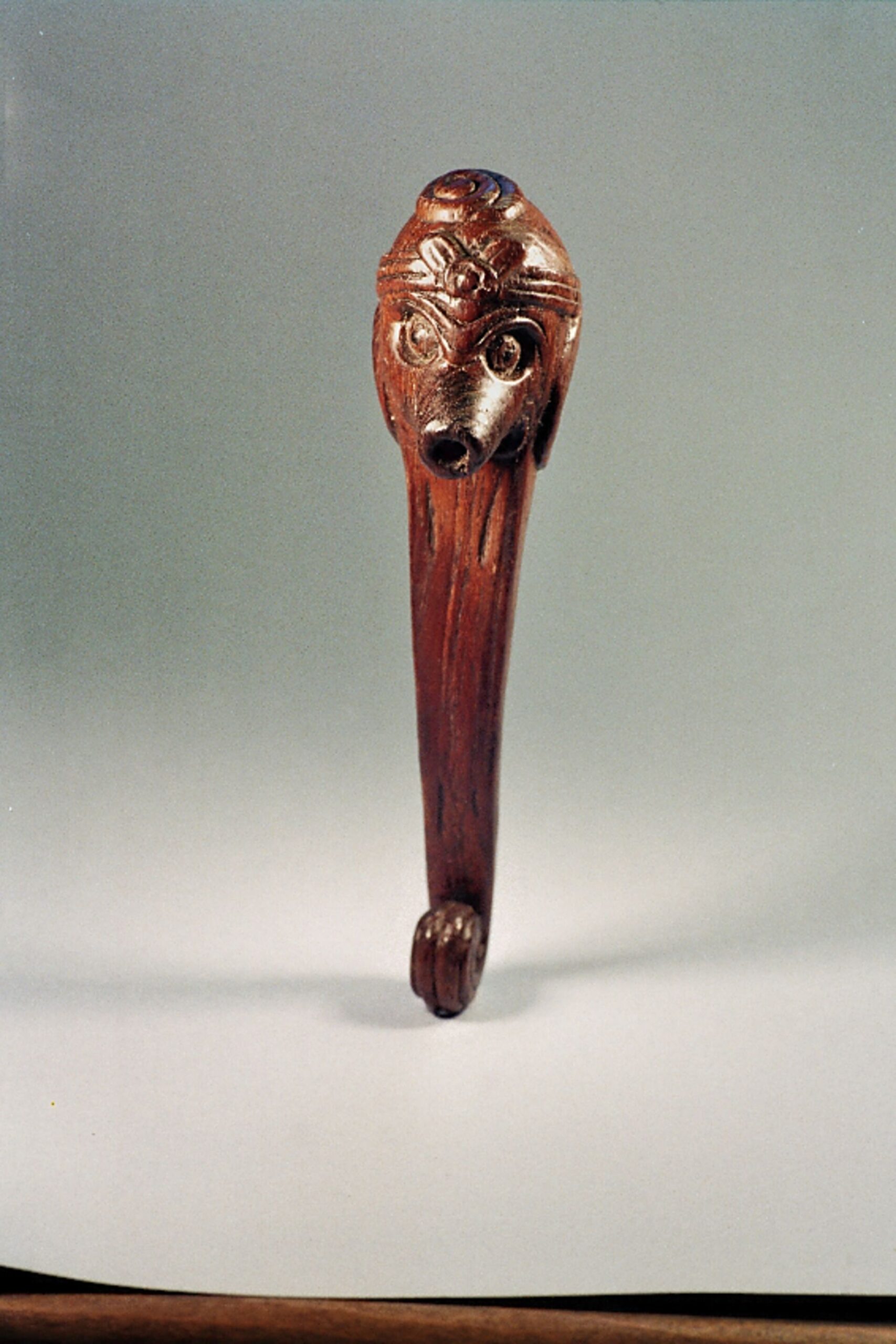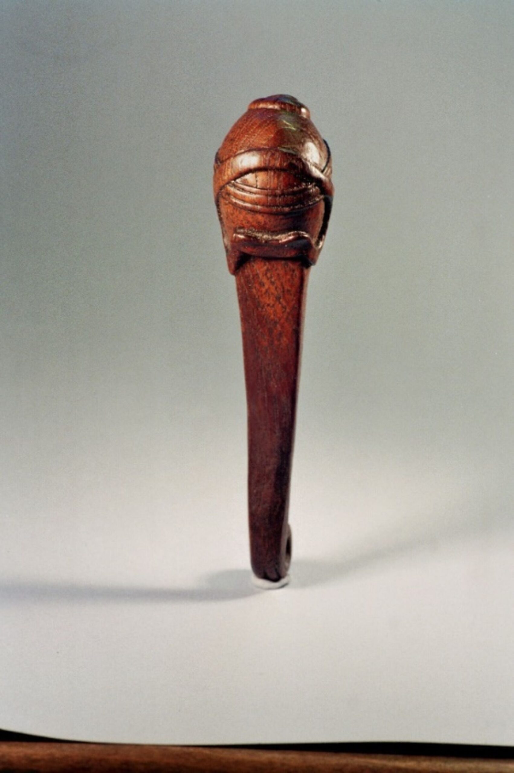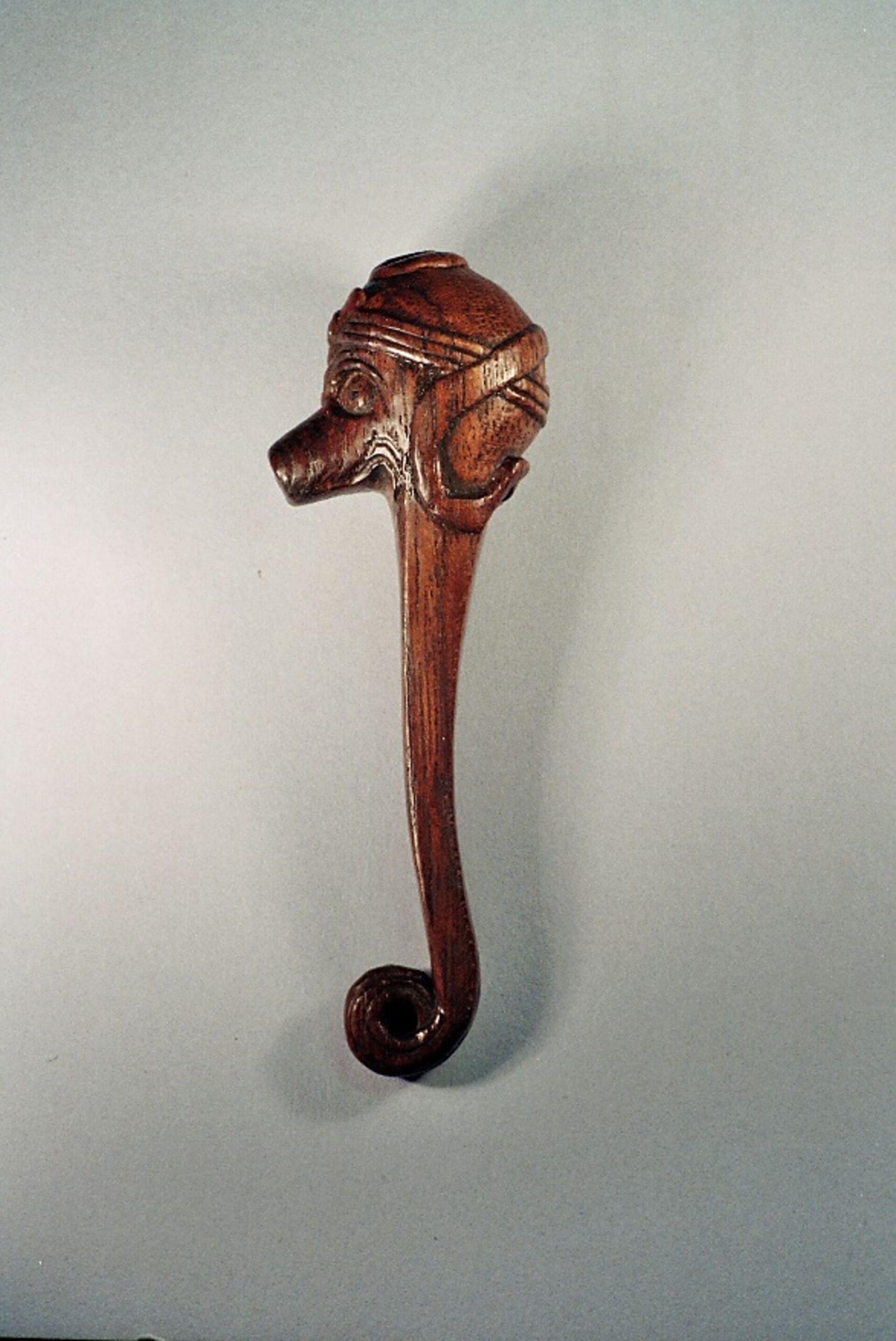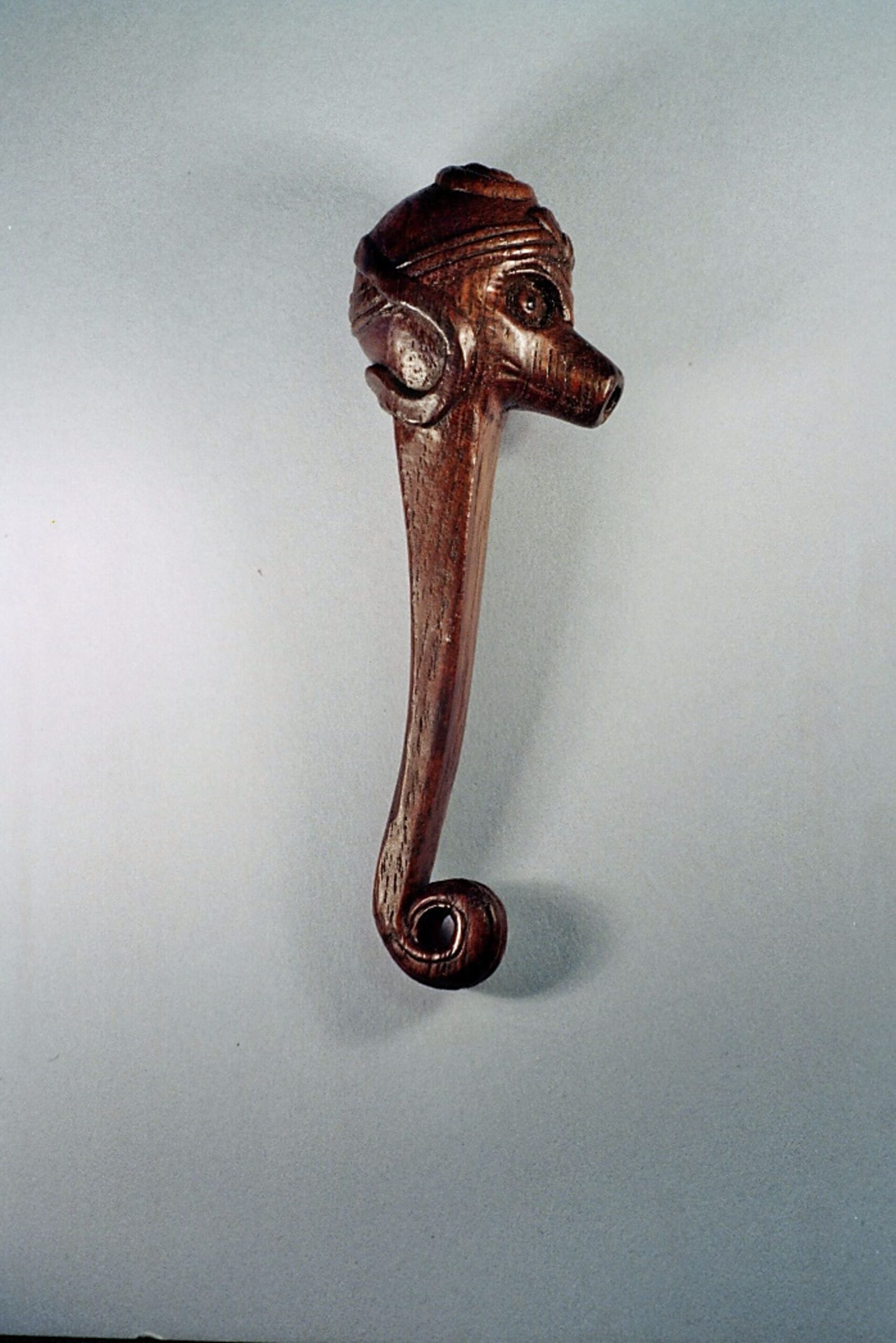 Holz-Katabori. An der typischen Schnauze, dem Ausdruck der Augen und an der Kopfform ist dieses kuriose Wesen als Oktopus zu erkennen. Doch hat er nur ein Tentakel. So erinnert er auch ein wenig an ein Seepferdchen. Um den Kopf trägt er ein Schweiss-Stirnband tenugui, über Hinterkopf und Nacken eine Art Schleier und auf dem Scheitel ein schneckenförmig-spiralig gewundenes Gebilde. Vielleicht handelt es sich dabei um eine Kreiselschnecke, sazae. Das Ganze wirkt irgendwie humorvoll und rätselhaft. Höhe 103mm. Augen eingelegt in dunklem Material. Das Tentakel ist abgeflacht, sodass das Ganze sich gut als Sashi unter dem Gürtel durchschieben lässt. Das untere Ende des Tentakels ist eingerollt und bildet eine Öffnung, an der sich gut ein Hängeding Sagemono befestigen liesse. Höhe 103mm, nicht signiert, Alter: vermutlich 2. Hälfte 19.Jh., bis um 1900 oder vielleicht sogar später.