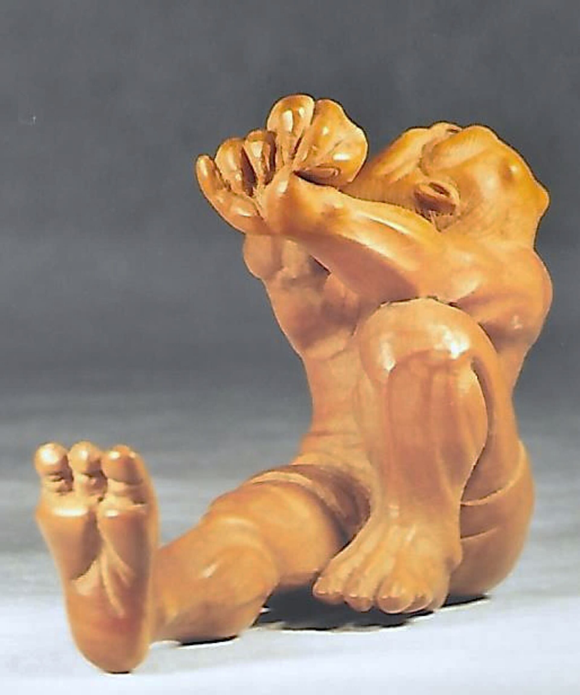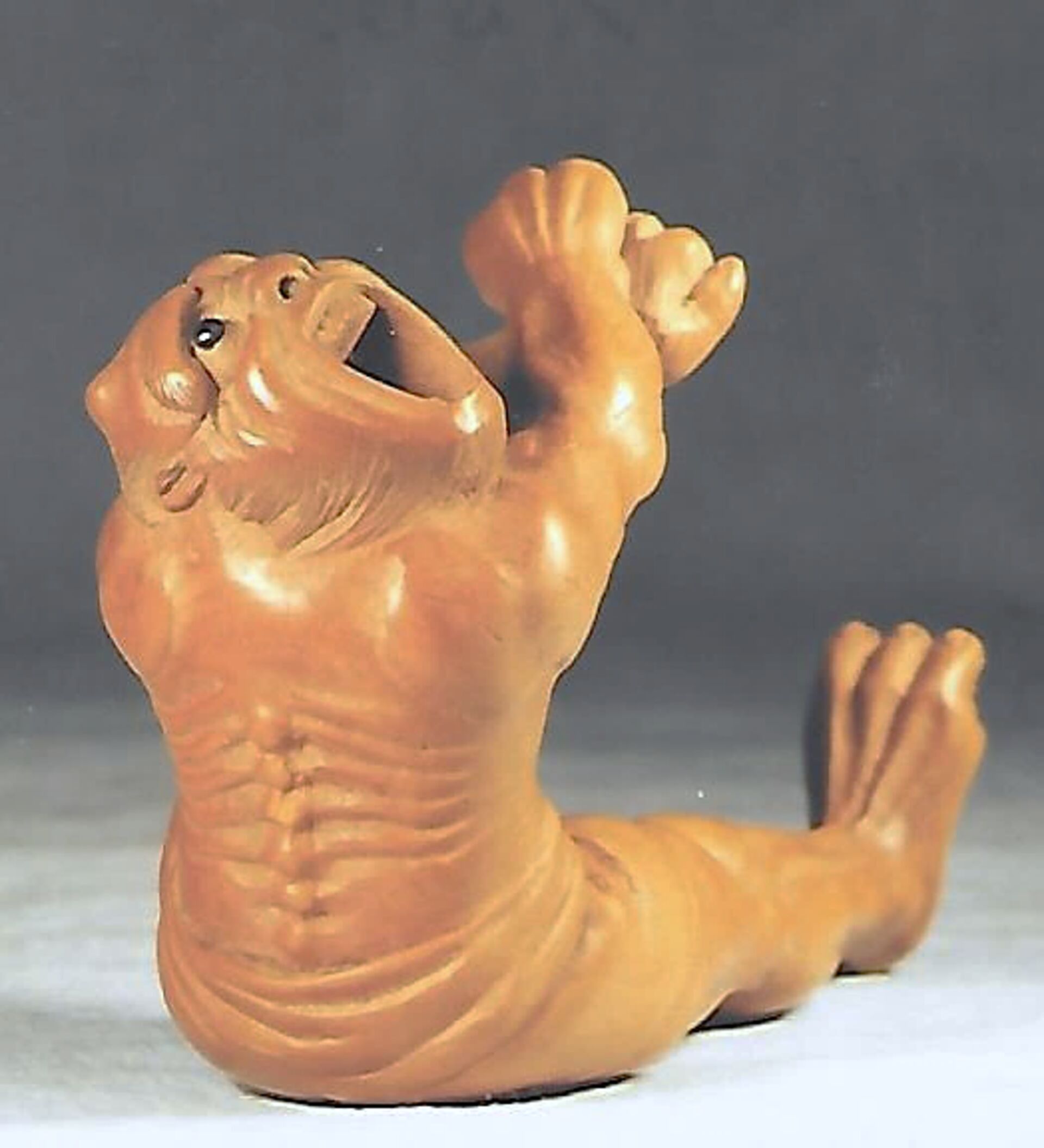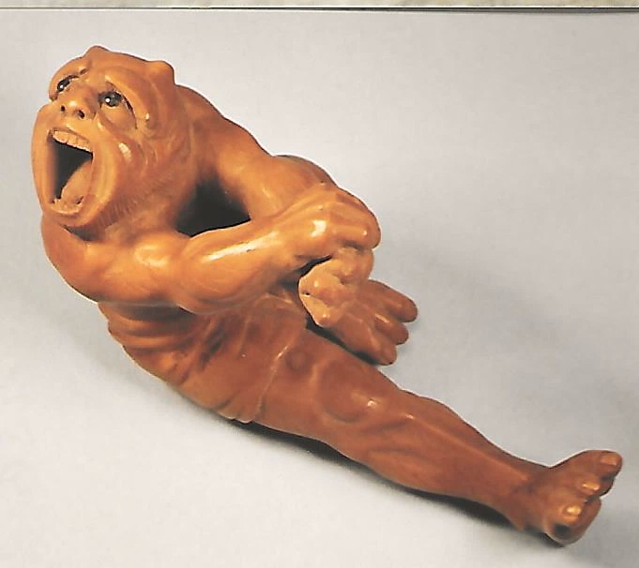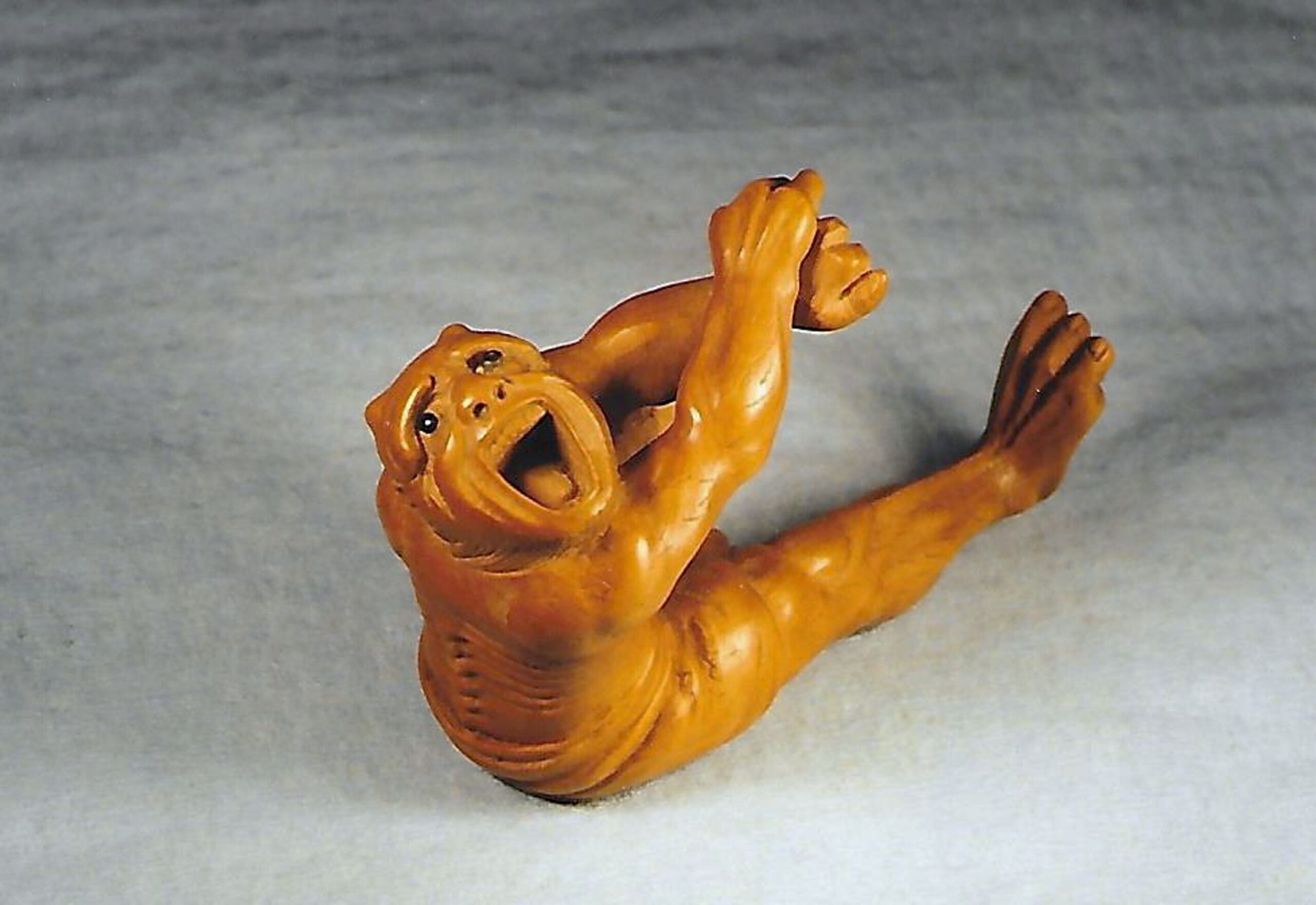 Holz-Okimono. Der Oni, ein Dämon, erkennbar an den Hörnern und den dreiklauigen Händen und Füssen, sitzt auf dem Boden. Er ist nackt bis auf eine kurze Hose. Das rechte Bein ist gestreckt, das linke angezogen. Der Körper ist stark behaart, das Gesicht von einem Bart umrandet. Die Arme sind gestreckt, die Hände überkreuzt. Der Kopf ist nach rechts oben gewendet, der Mund weit offen gähnend. Die Pupillen sind in dunklem Horn eingelegt. Die Muskulatur und die Rippen sind kräftig, fast übertrieben deutlich dargestellt. Länge 70mm. Keine Himotoshi. Alter: vermutlich um 1900. Die Darstellung ist eine Allegorie auf Daruma, der den Buddhismus nach China brachte und nach neun Jahren in Meditation oftmals gähnend und sich streckend dargestellt wird. Also der Teufel, der den Heiligen imitiert.