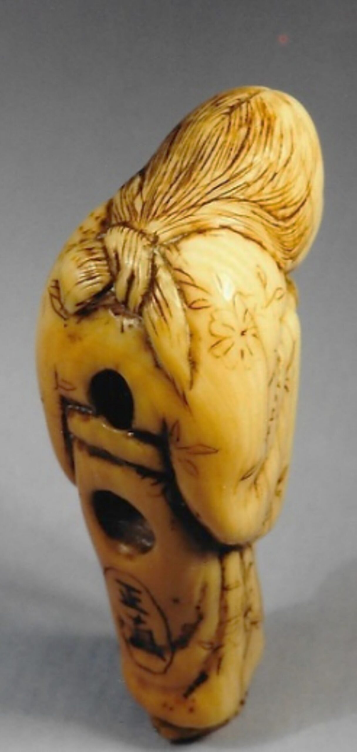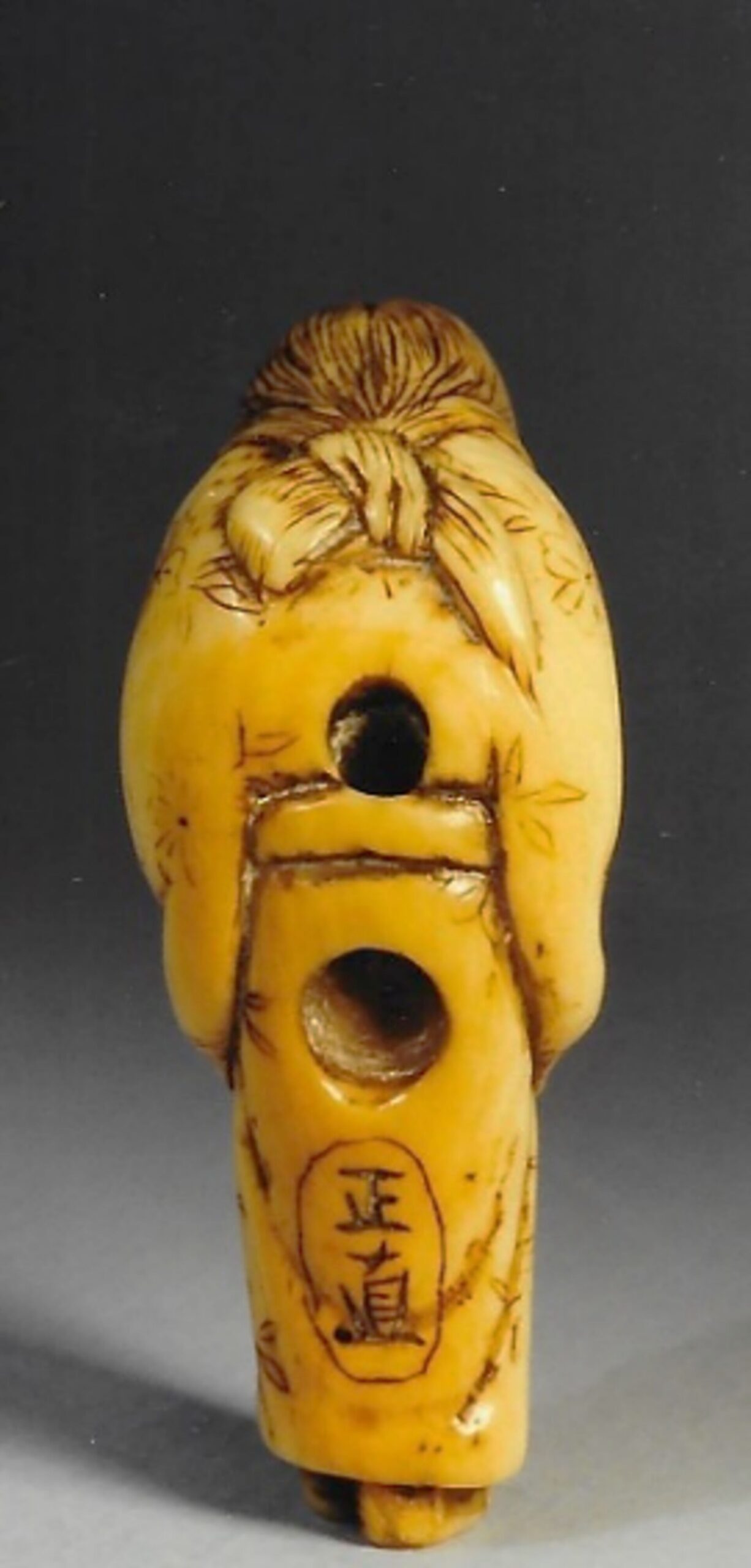 Falls die Signatur echt ist, ist sie bedeutend. MASANAO· von Kyôto ist bereits 1781 im Sôken Kishô erwähnt. Dort heisst es (übersetzt) “He is skillful at carving ivory, wood, and other materials. He deserves high praise and recognition.” Bushell (“Collector’s Netsuke”) schreibt: “He has the uncanny ability to penetrate to the heart of his subject and to portray it with artistic distortions, exaggerations, and idealisations that make it more real than realism… His designs often incorporate contrasts and harmonies in a most artful and pleasing manner.” Lazarnick schreibt, dass Fälschungen selten seien. Aber was weiss man schon mit Sicherheit? – Meine Liebe zu diesem Frauchen war auf den ersten Blick, und erst später identifizierte ich die Signatur. – Die Haltung der Dame ist dieselbe wie “Hotei, einen Hahnenkampf beobachtend” auf dem Bild von Miyamoto Musashi.