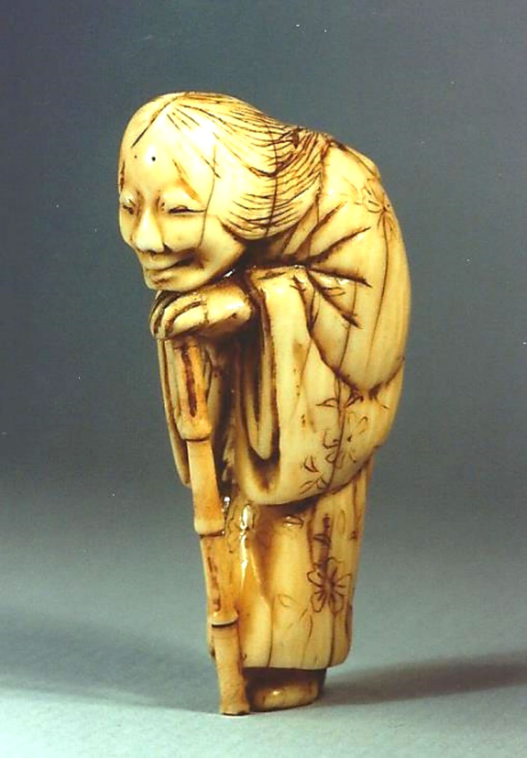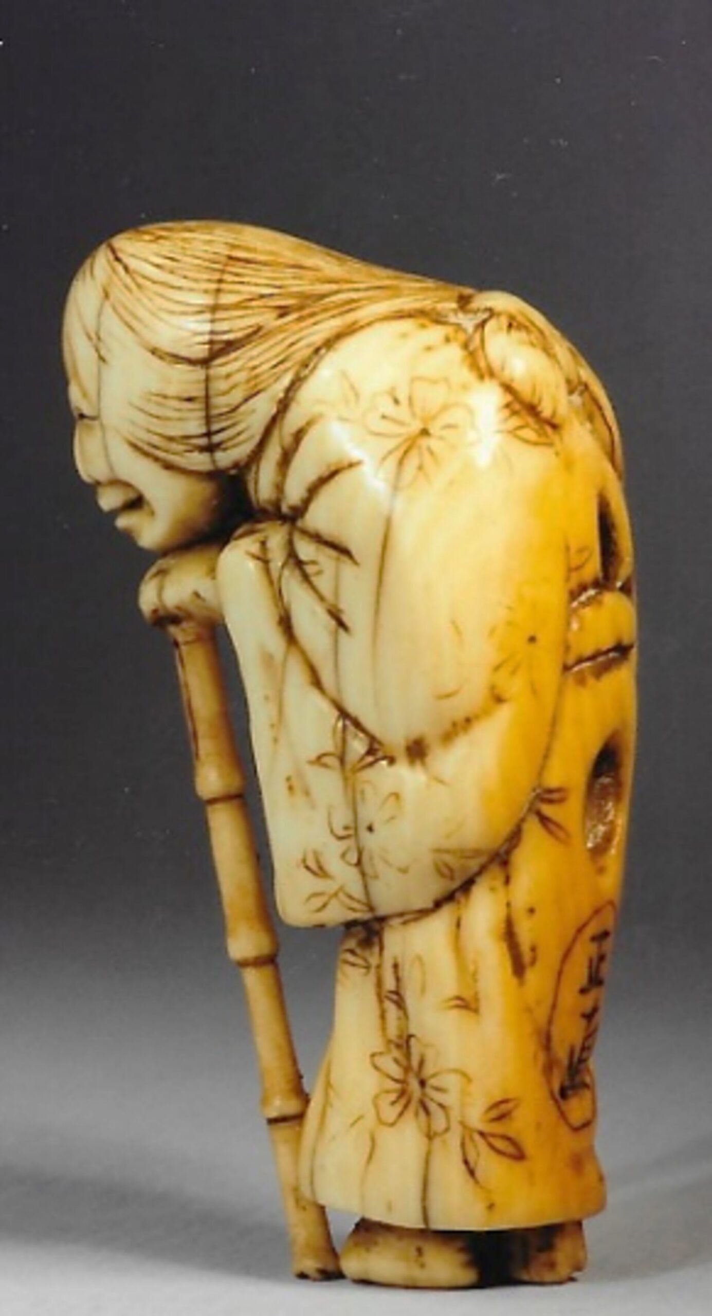 Elfenbein-Katabori, Die greise Dichterin steht tief gebückt, auf einen Stock gestützt. Ihr Gesichtsausdruck ist eine Mischung von stolz und bedrückt, freundlich und leidend. Das lange Haupthaar ist hinten zu einer Masche zusammengebunden. Der Kimono zeigt ein florales Muster. Die Himotoshi im Rücken sind unterschiedlich gross, gut gebohrt, mit schönen Tragspuren. Darunter die Signatur MASANAO (K191, K282) in einer ovalen Reserve. Sehr schöne Alterspatina, gut abgegriffen, handschmeichlerisch. Höhe 47mm. Etliche feine Alterssprünge. Alter 18.Jh.