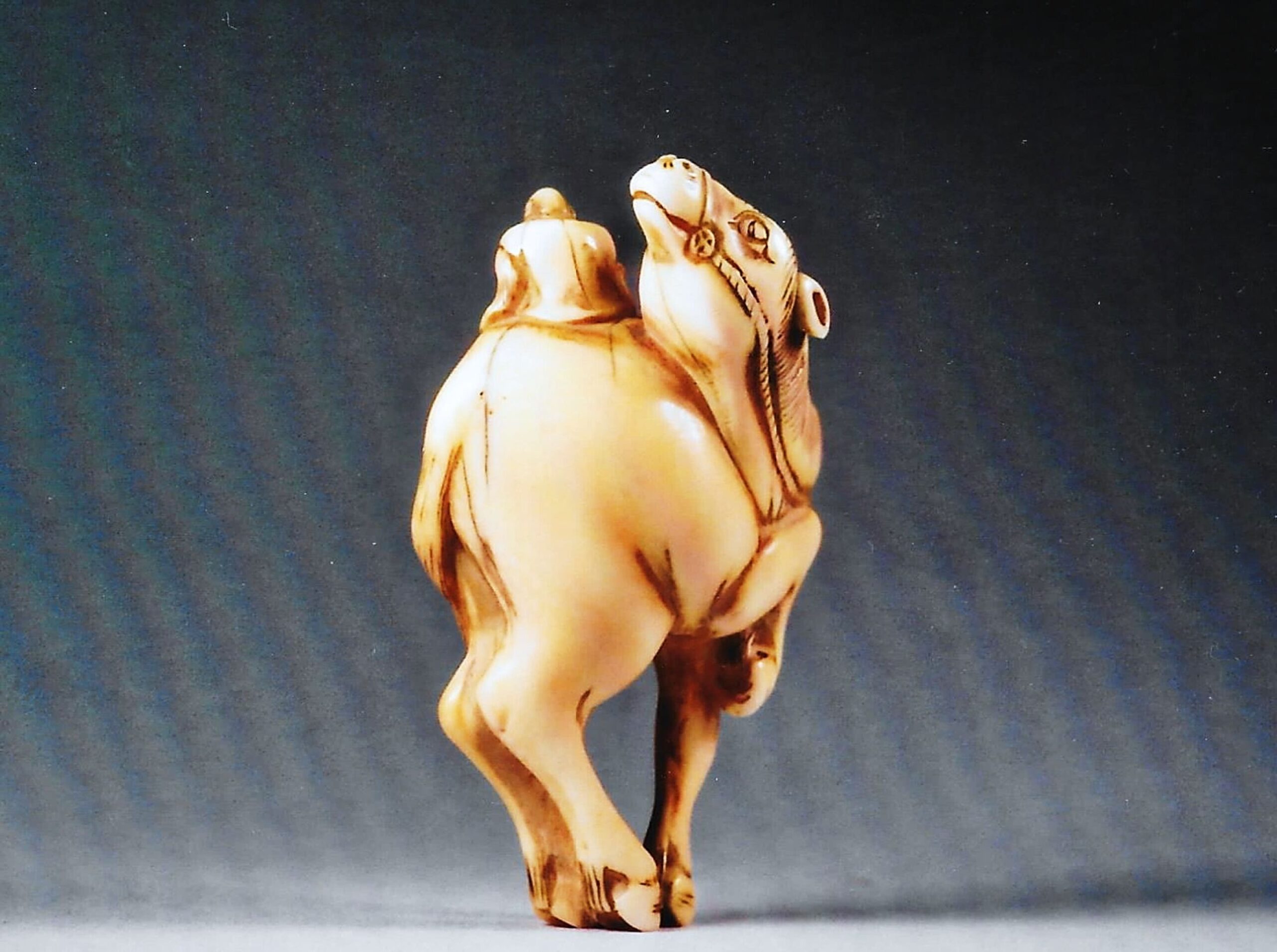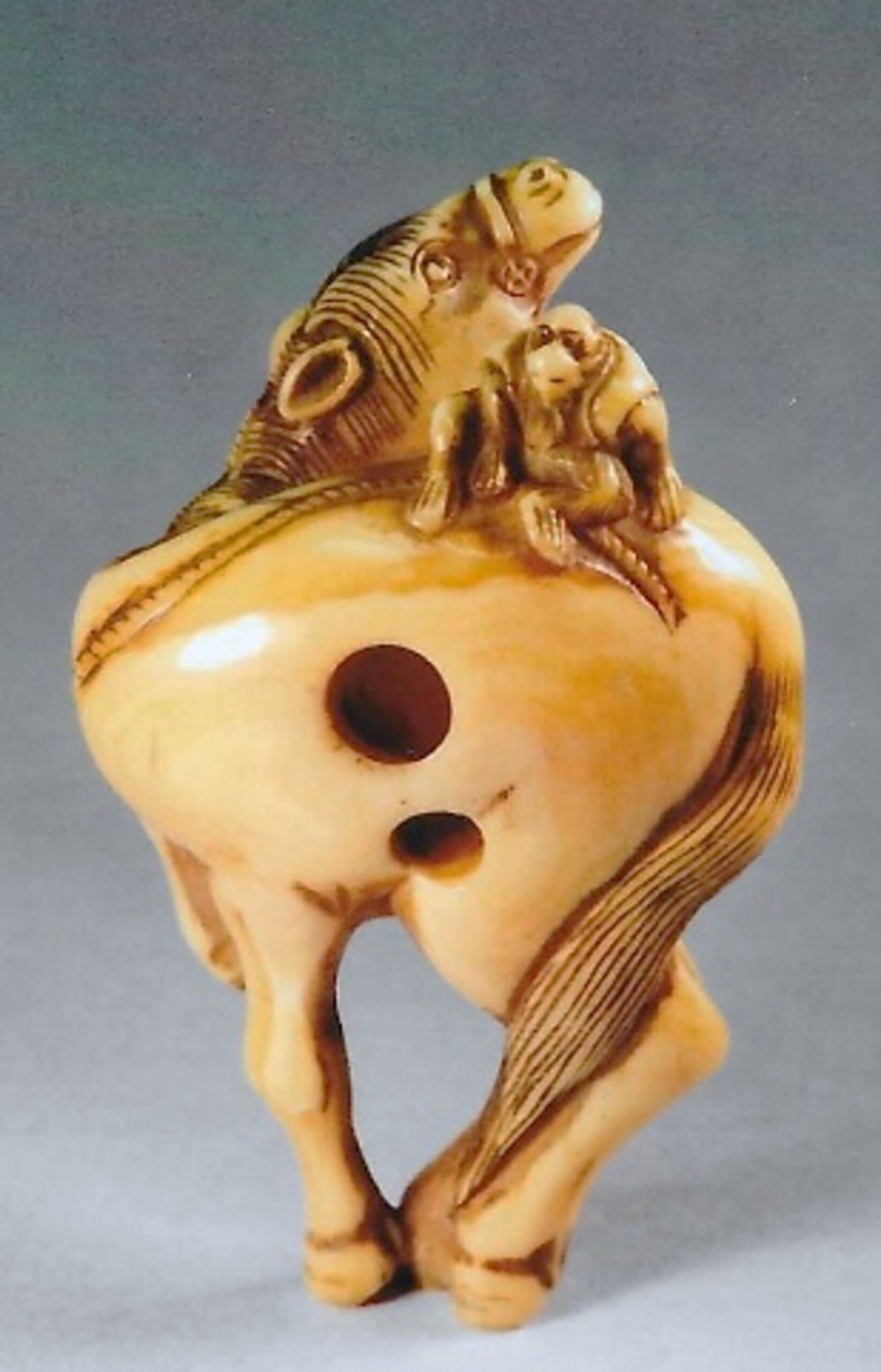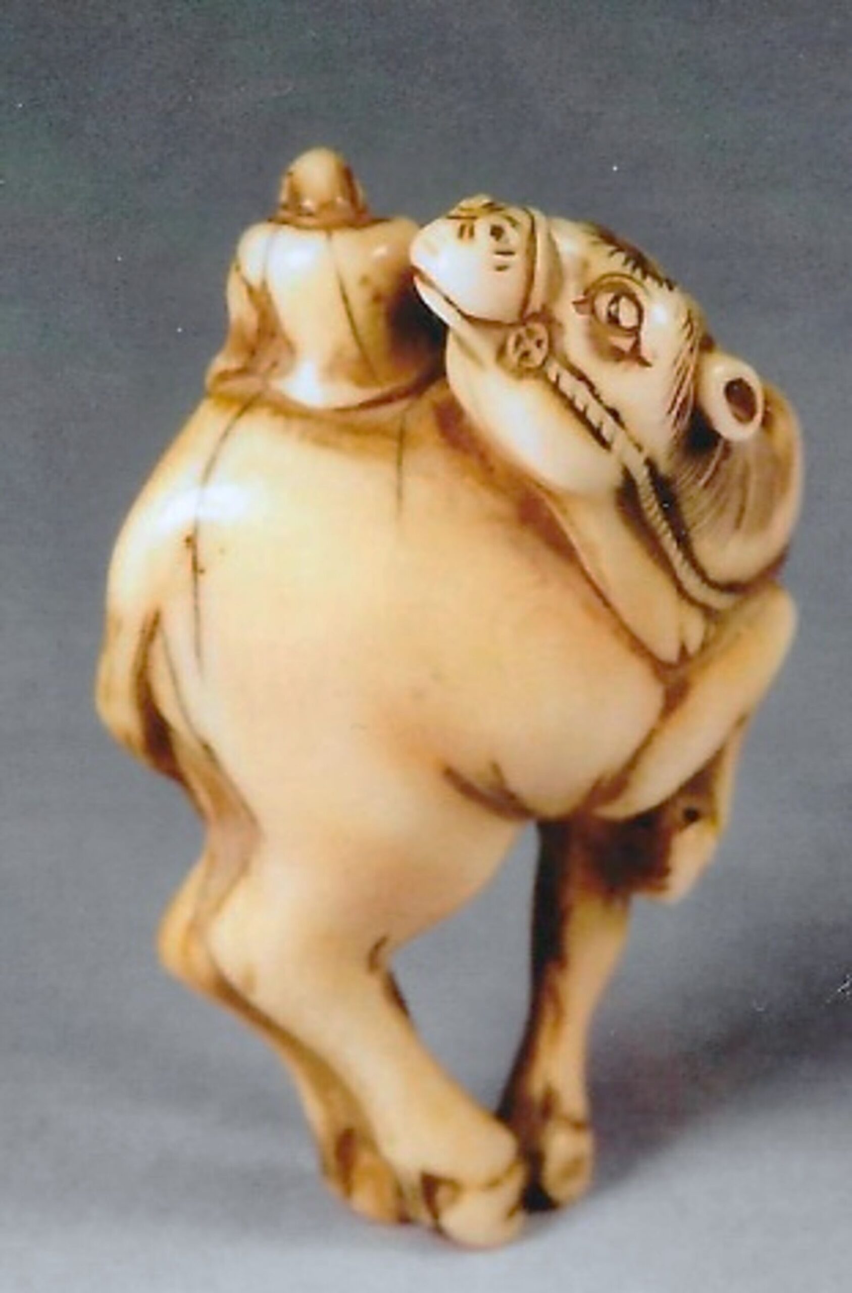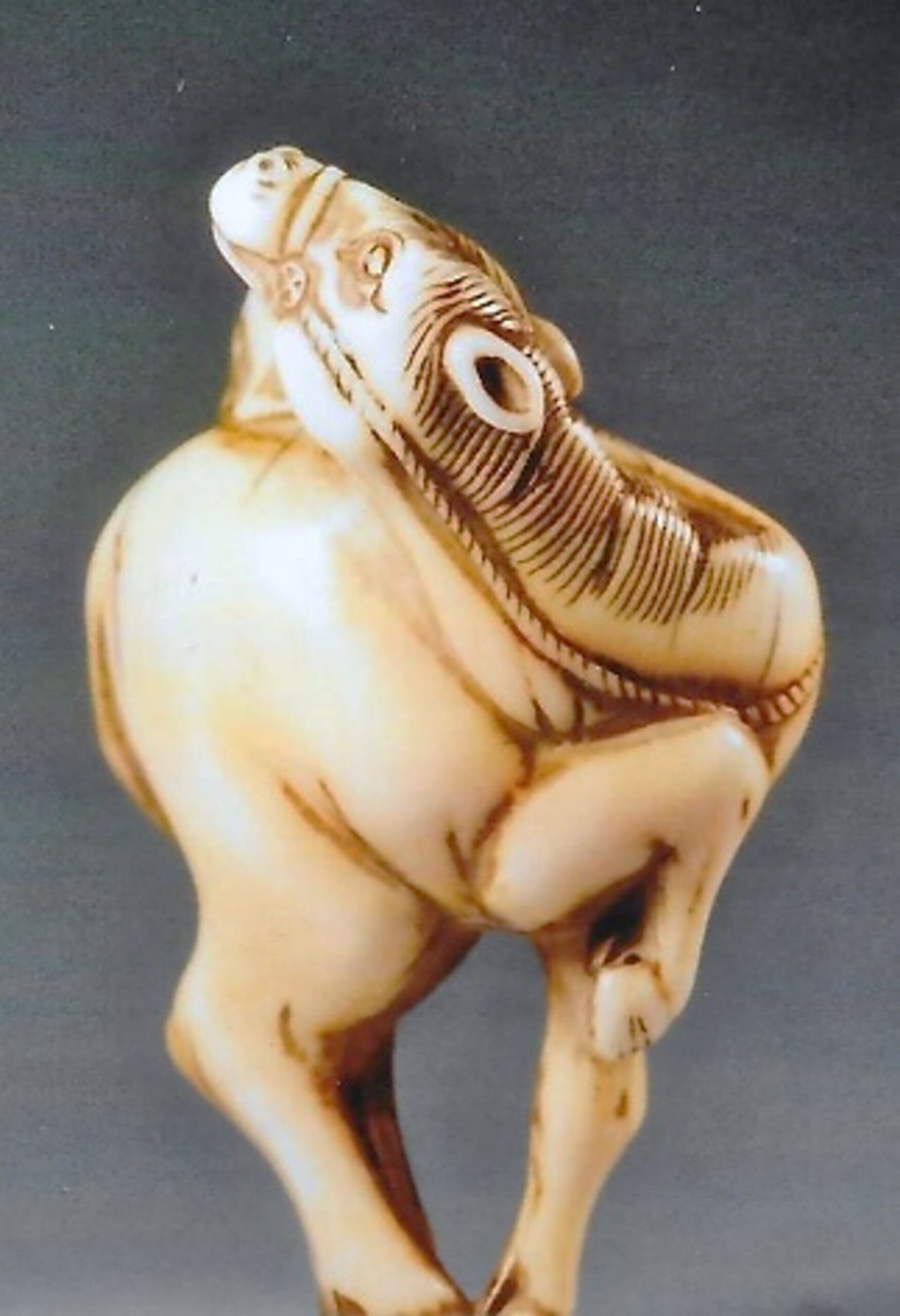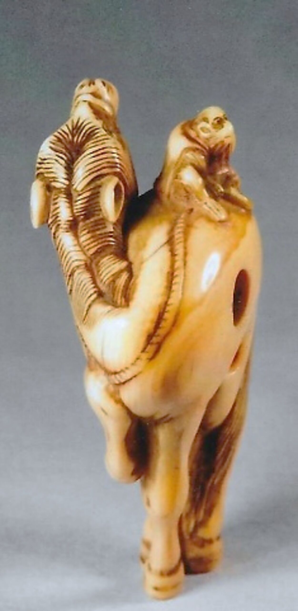 Elfenbein-Katabori. Das Pferd steht auf drei eng beisammen positionierten Beinen, das rechte Vorderbein ist angehoben. Der Kopf ist aus Gründen der Kompaktheit und wohl auch wegen der Materialökonomie extrem nach rechts hinten gewendet. Auf dem Rücken des Pferdes sitzt ein kleiner Affe, gekleidet in eine ärmellose Jacke. Ein Balance-Netsuke. Auf ebener Unterlage ist das Stück im Gleichgewicht. An der linken Seite des Pferdekörpers, der Hinterseite, zwei gut gebohrte, ungleich grosse Himotoshi. Tragespuren. Schöne goldgelbe Patina. Einige Alterssprünge. Höhe 56mm. Alter ca. 1. Hälfte 19.Jh. Nicht signiert..