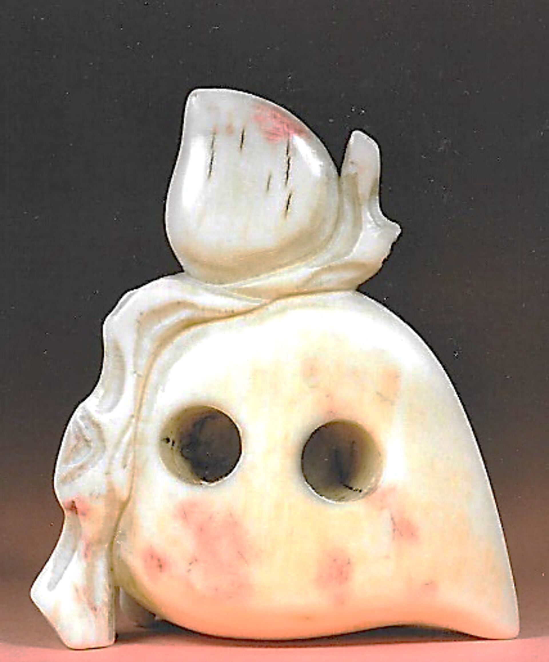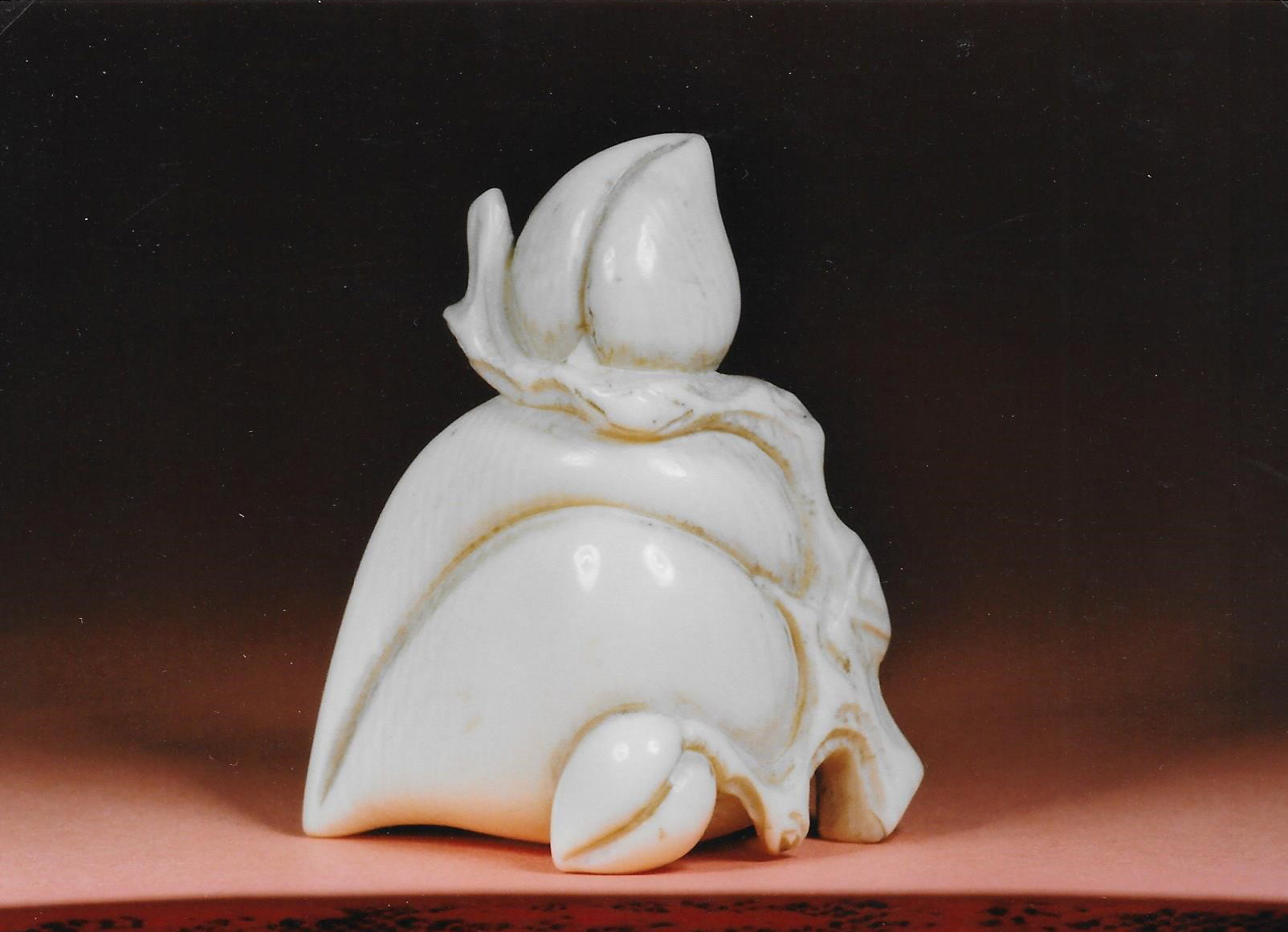 Elfenbein-Katabori, darstellend drei verschieden grosse Pfirsiche mit dem dazugehörigen Ast. Dreieckig sowohl von vorne wie von oben. Das Elfenbein ist auf der Rückseite etwas dunkler, gelblicher als vorne. An der Rückseite des grössten Pfirsichs zwei gleich grosse, gut gebohrte Himotoshi. Höhe 39 mm, Breite 35 mm.