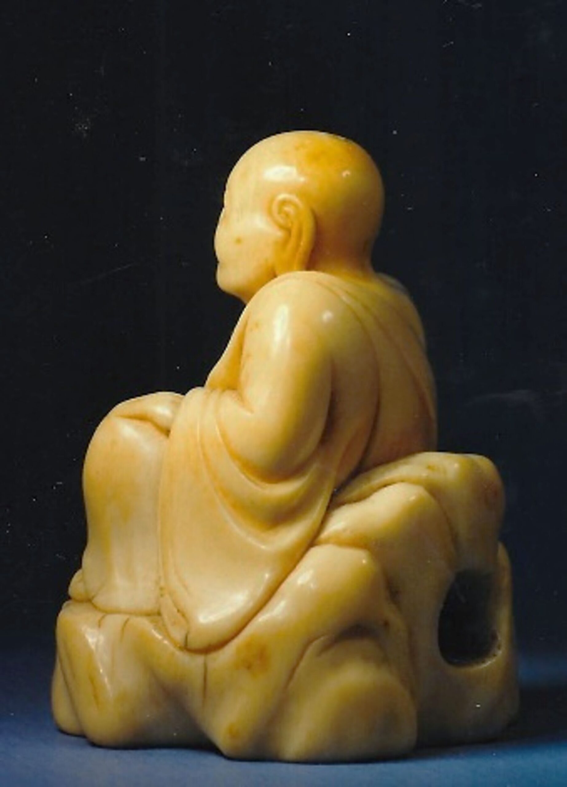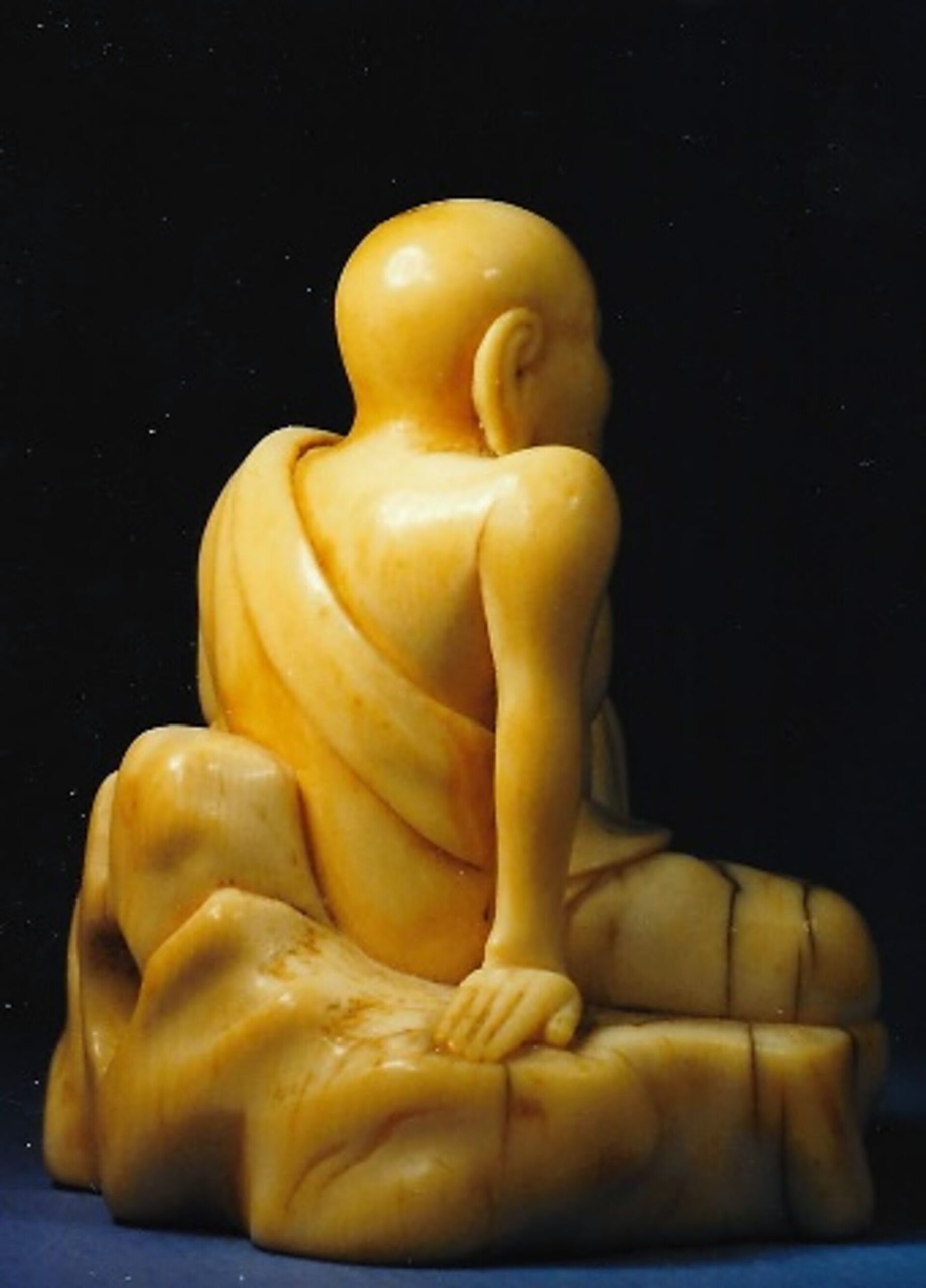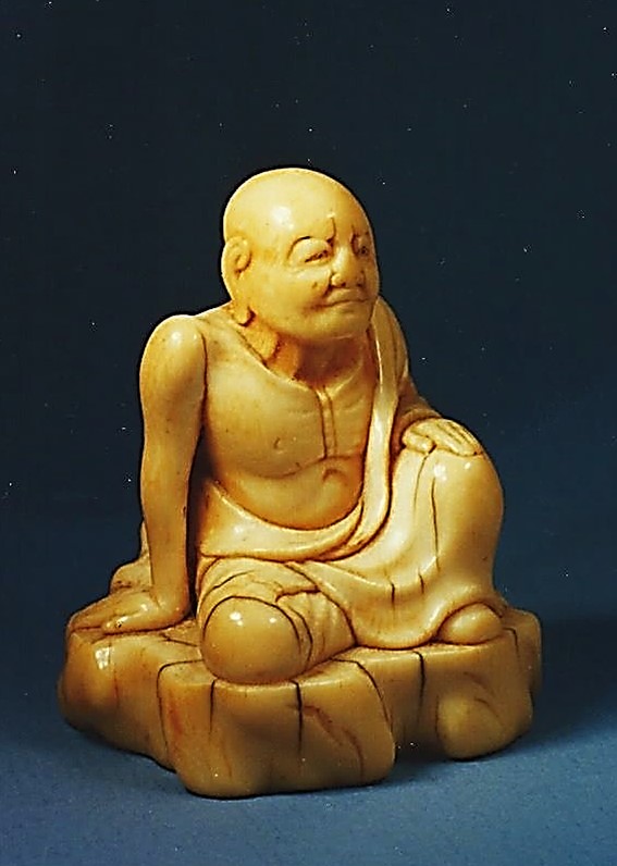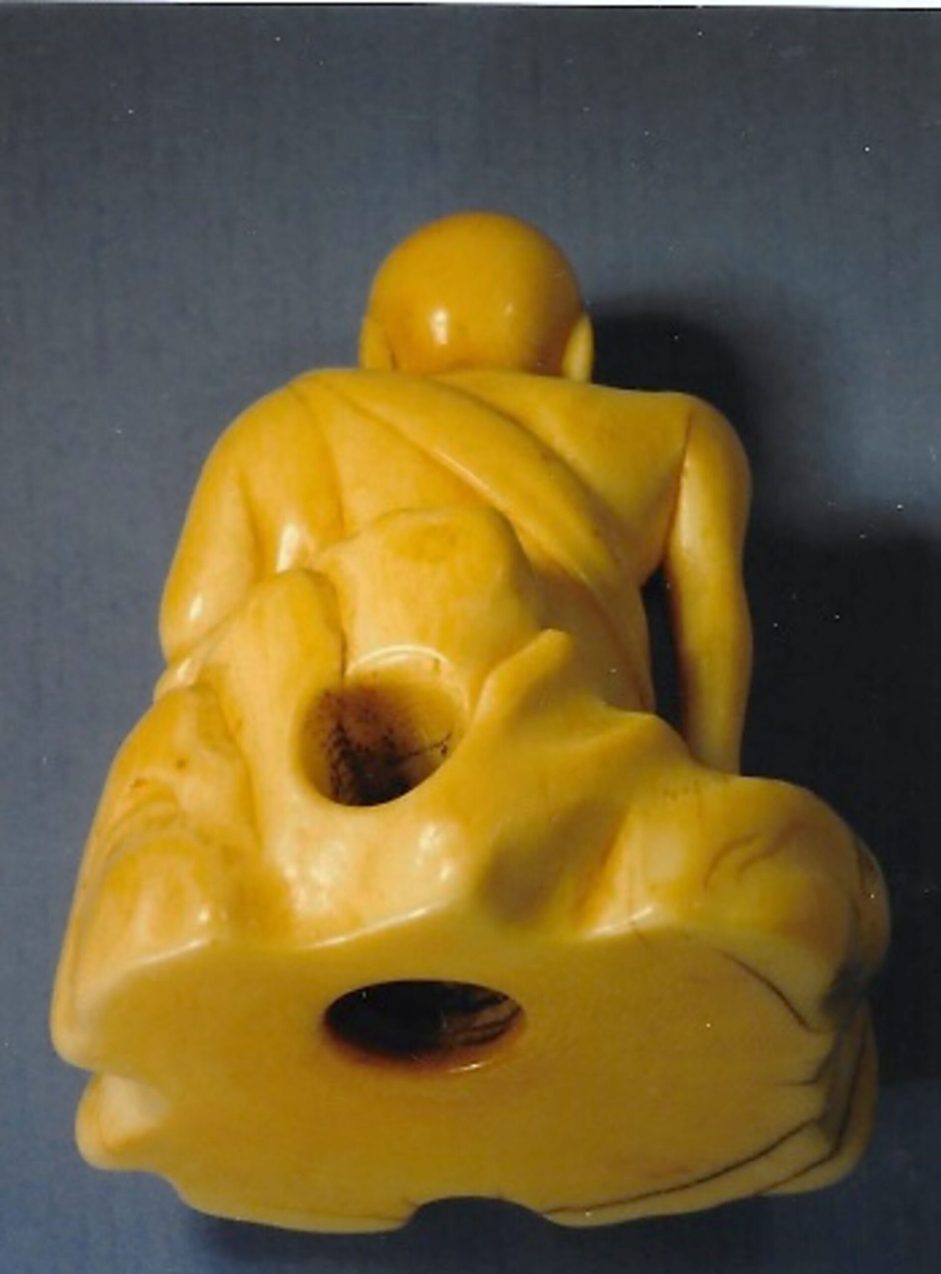 Elfenbein-Katabori, der glatzköpfige Glücksgott ,mit mächtigen Ohrläppchen steht leicht vornüber geneigt, mit der Linken stützt er sich auf einen knorrigen Stab, mit der Rechten hält er die Hand eines vor ihm stehenden, an ihn geschmiegten Karakô. Die Kleider beider sind mit feinen Zeichnungen verziert, die Haarknäufe des Karakô sind in dunklem Horn eingelegt. grosse, gut gebohrte Himotoshi im Rücken, nicht signiert, Höhe 57mm. Dreieckiger Grundriss. Alter: 1.Hälfte 19.Jh.,
