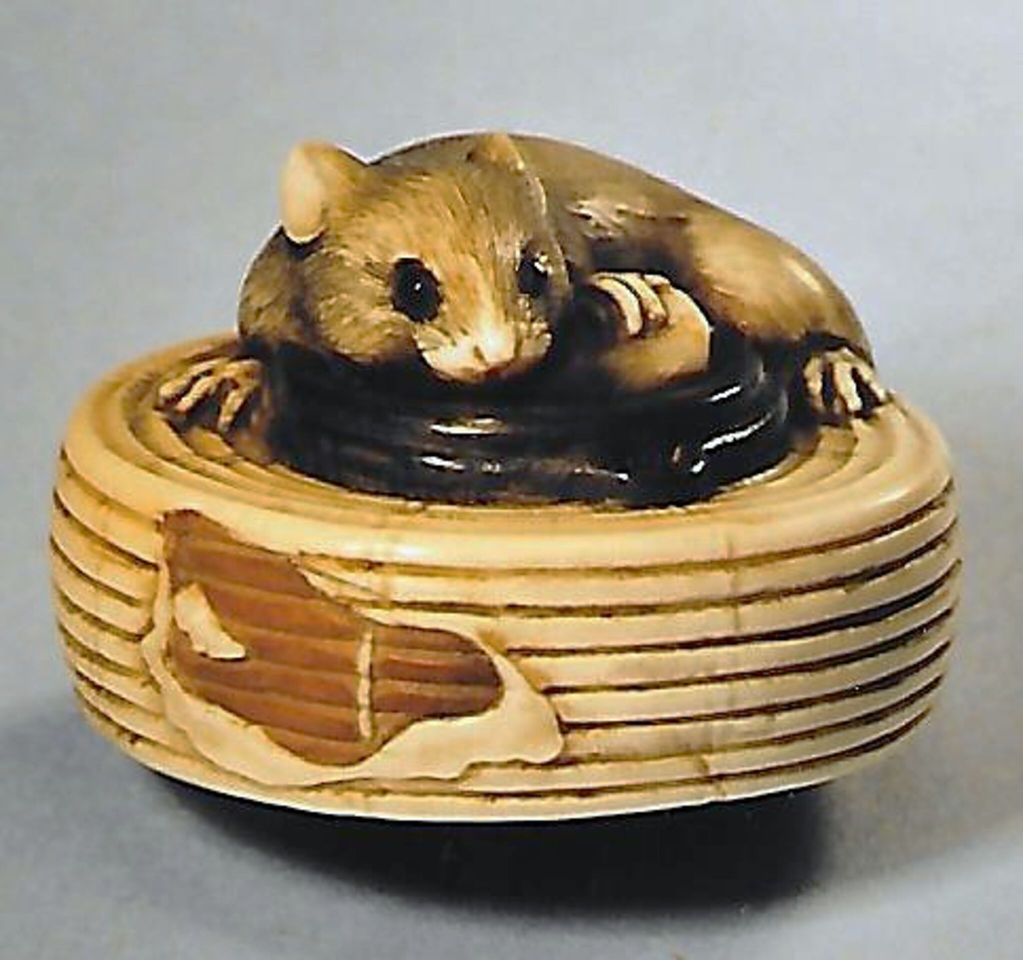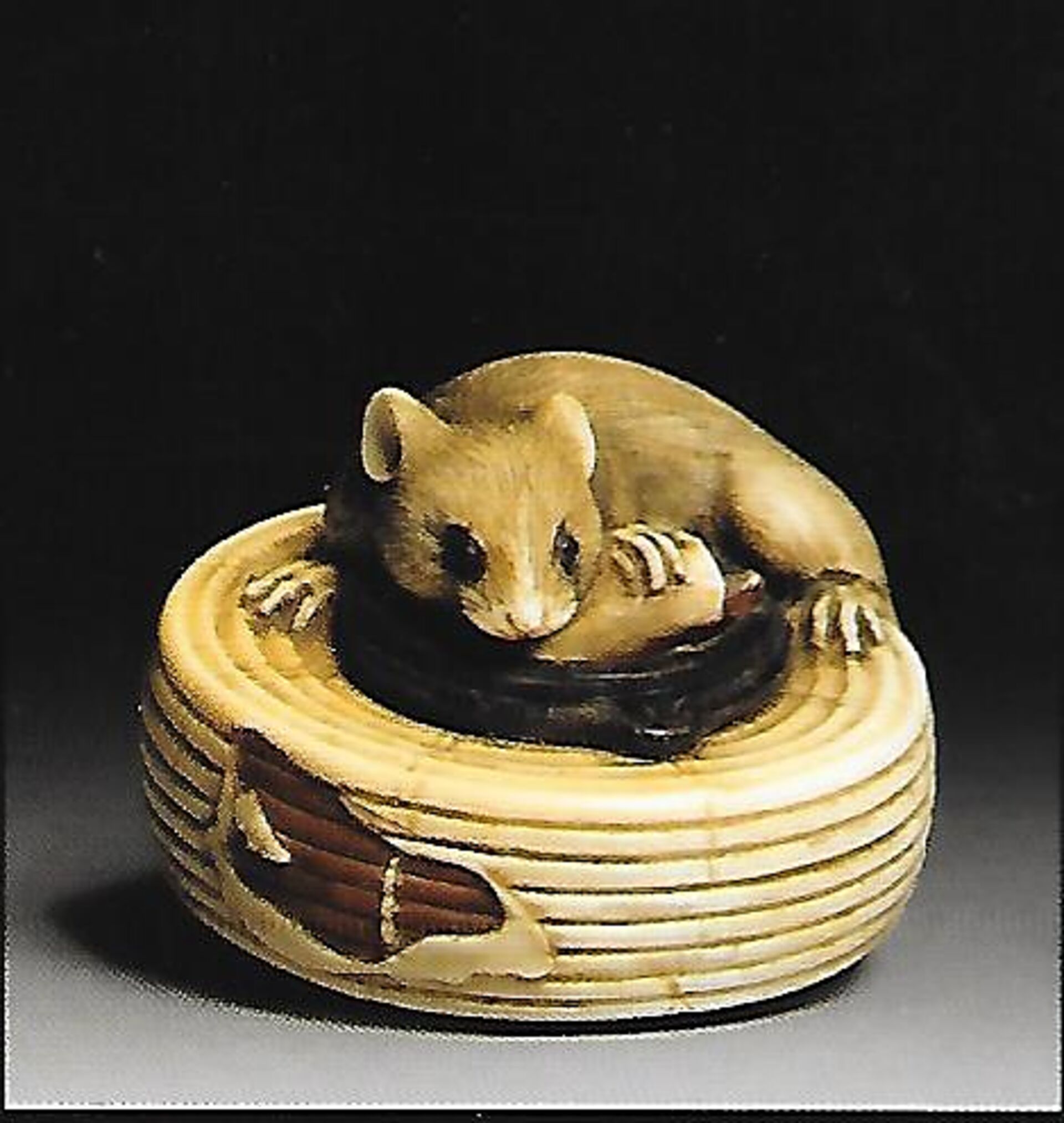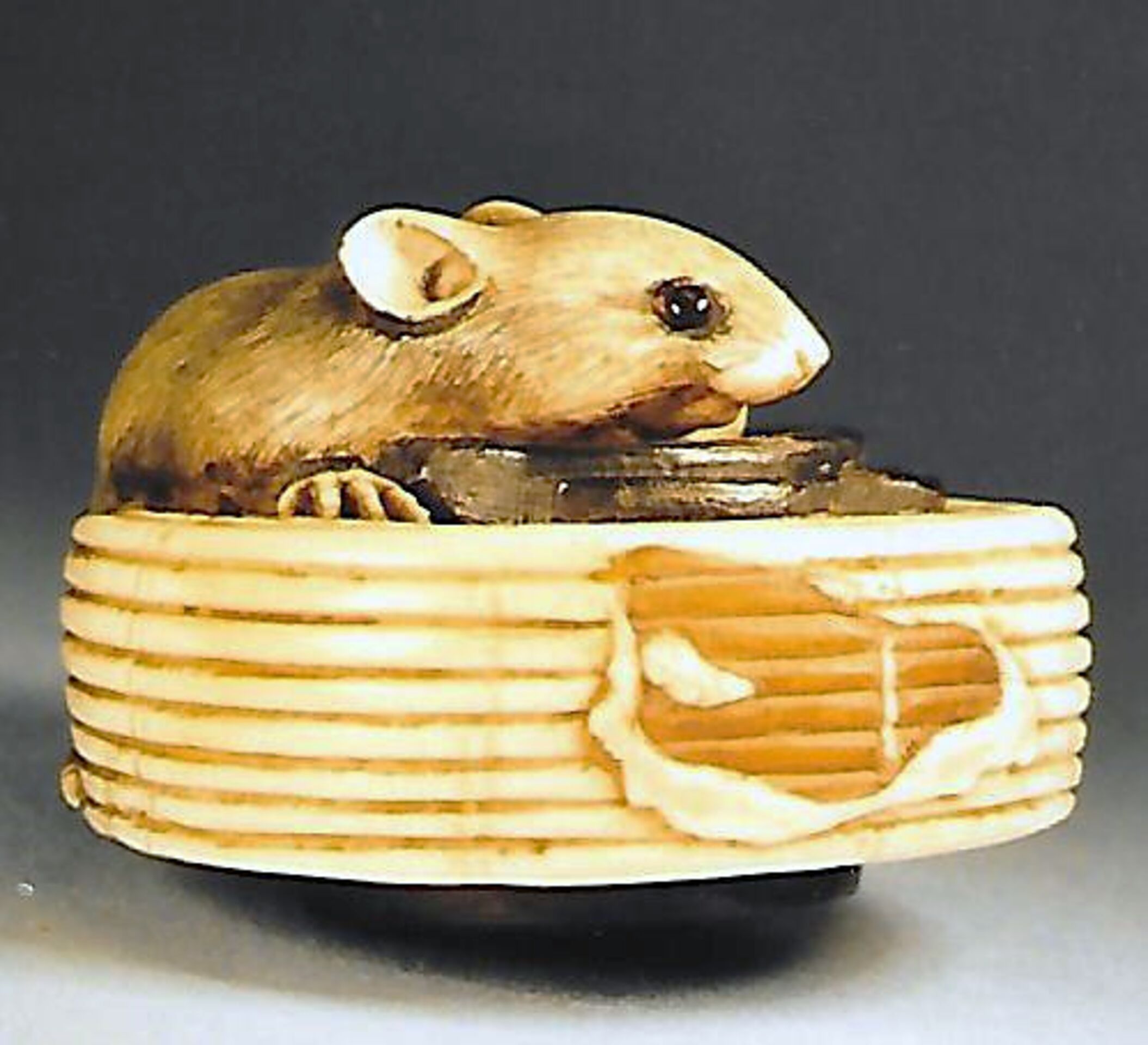 Elfenbein/Holz/Horn-Katabori. Eine sehr fein und ausdrucksstark geschnitzte Ratte mit grossen dunklen Augen liegt nach links gerundet auf einem zusammengeklappten Lampion. Die linke Vorderpfote hat sie auf einem umgebogenen Kerzenstumpf. Der obere Einfassungsring des Lampions und der umgelegte Hängebügel sind in Holz gearbeitet, ebenso unterseitig der Boden mit einem kleinen Ring und den beiden unterschiedlich grossen Himotoshi. Unterseitig unleserlich ganz fein eingeritzt eine Signatur oder ein Kakihan. Der Lampion hat seitlich einen absichtlich gemachten Defekt. Breite 39mm. Alter ca. Mitte 19.Jh.