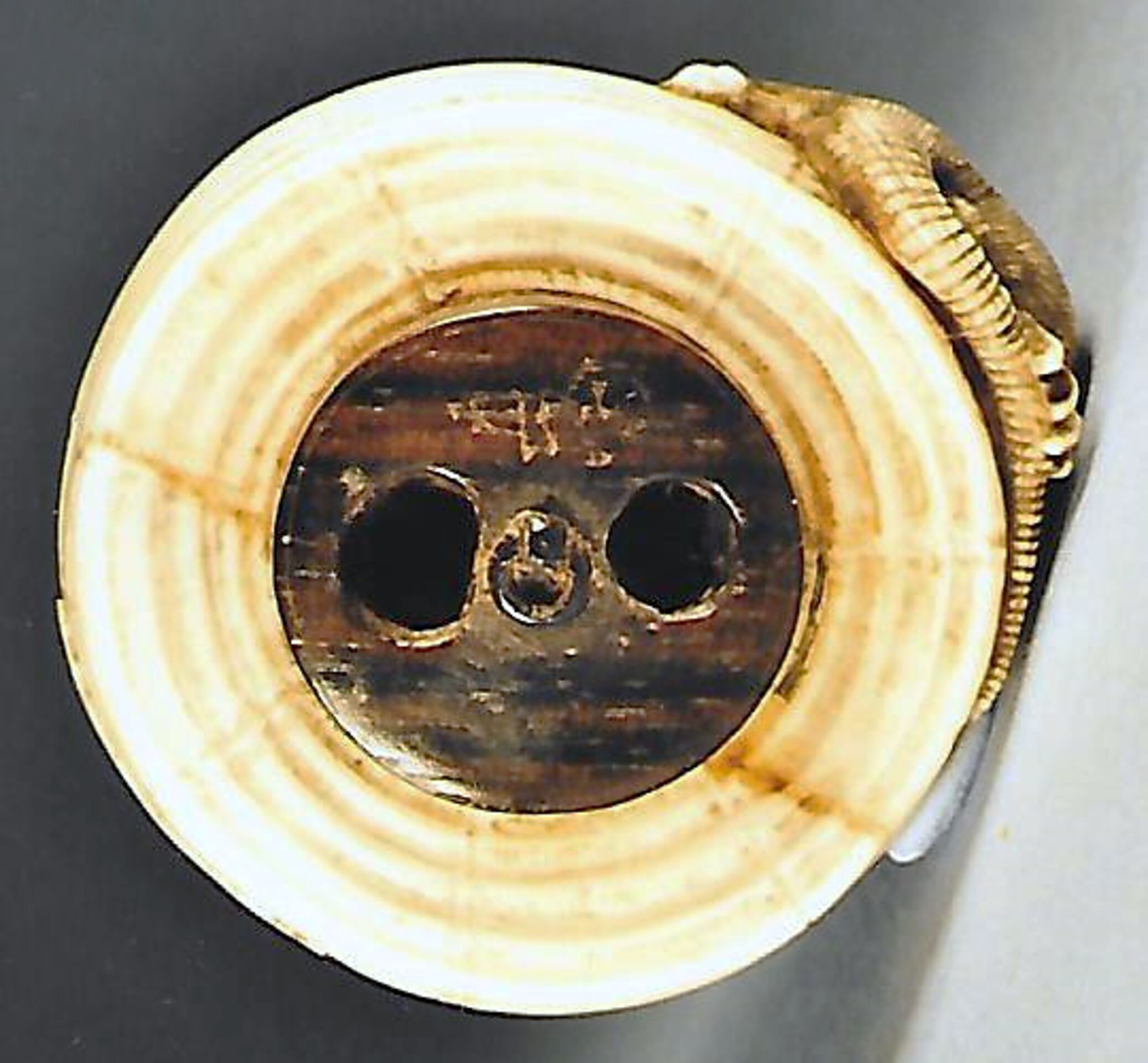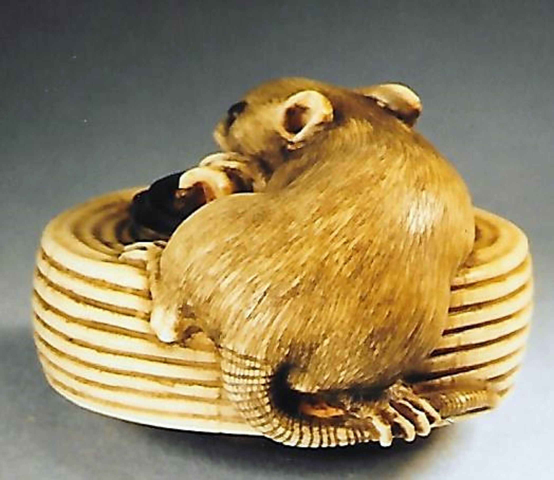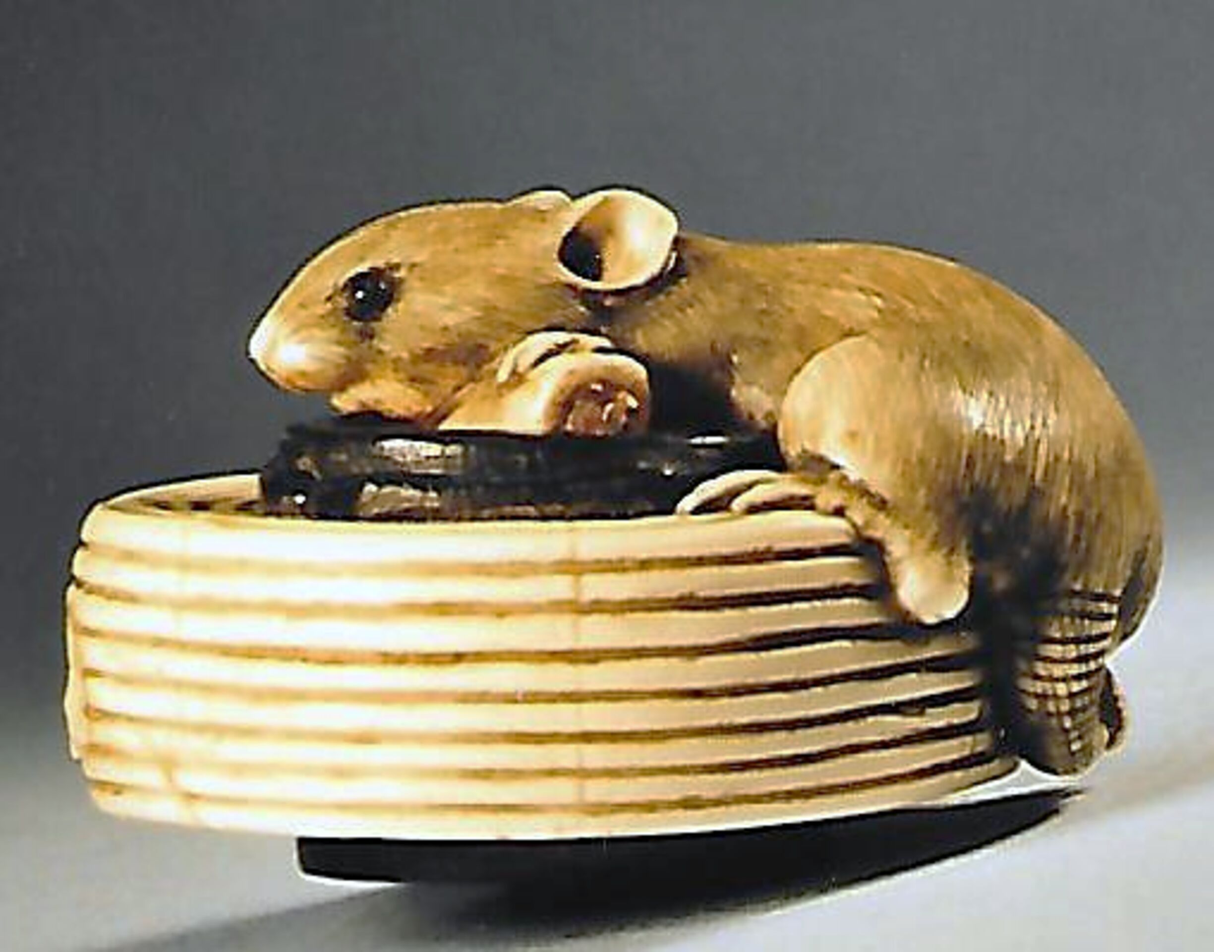 Elfenbein/Holz/Horn-Katabori. Eine sehr fein und ausdrucksstark geschnitzte Ratte mit grossen dunklen Augen liegt nach links gerundet auf einem zusammengeklappten Lampion. Die linke Vorderpfote hat sie auf einem umgebogenen Kerzenstumpf. Der obere Einfassungsring des Lampions und der umgelegte Hängebügel sind in Holz gearbeitet, ebenso unterseitig der Boden mit einem kleinen Ring und den beiden unterschiedlich grossen Himotoshi. Unterseitig unleserlich ganz fein eingeritzt eine Signatur oder ein Kakihan. Der Lampion hat seitlich einen absichtlich gemachten Defekt. Breite 39mm. Alter ca. Mitte 19.Jh.
