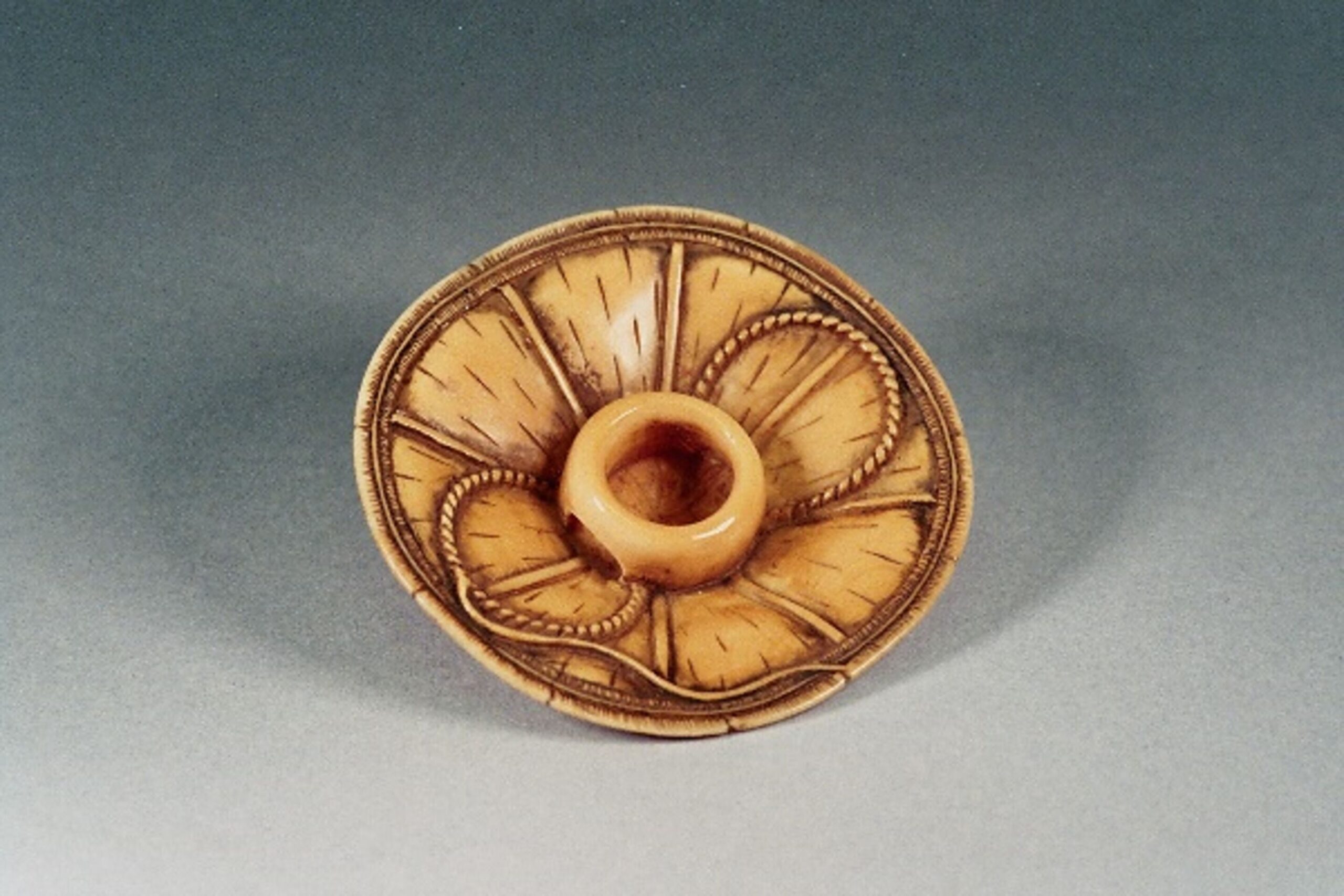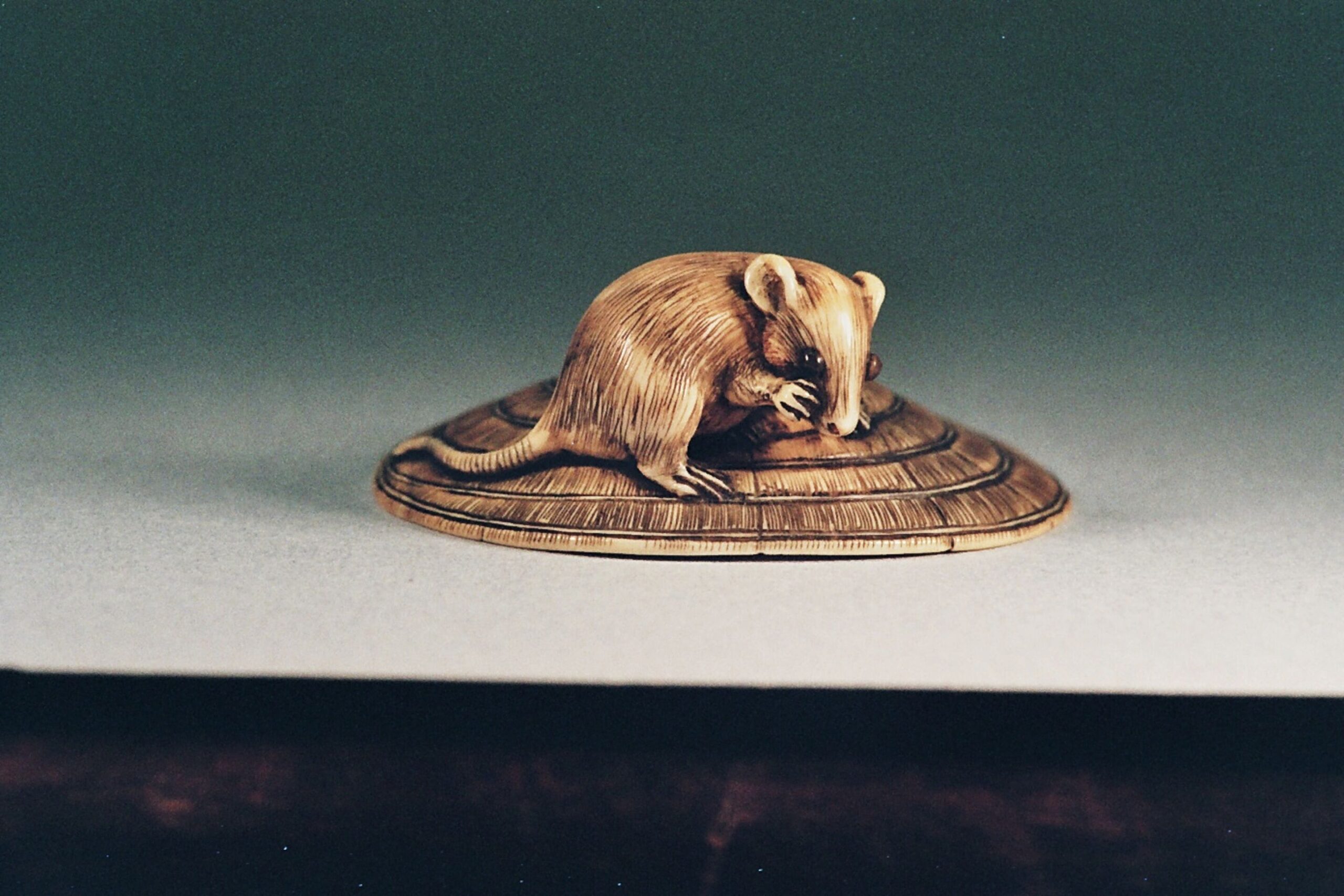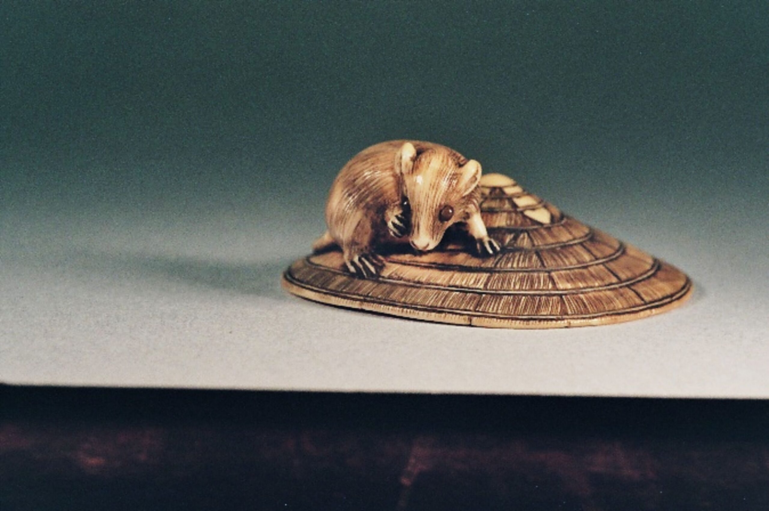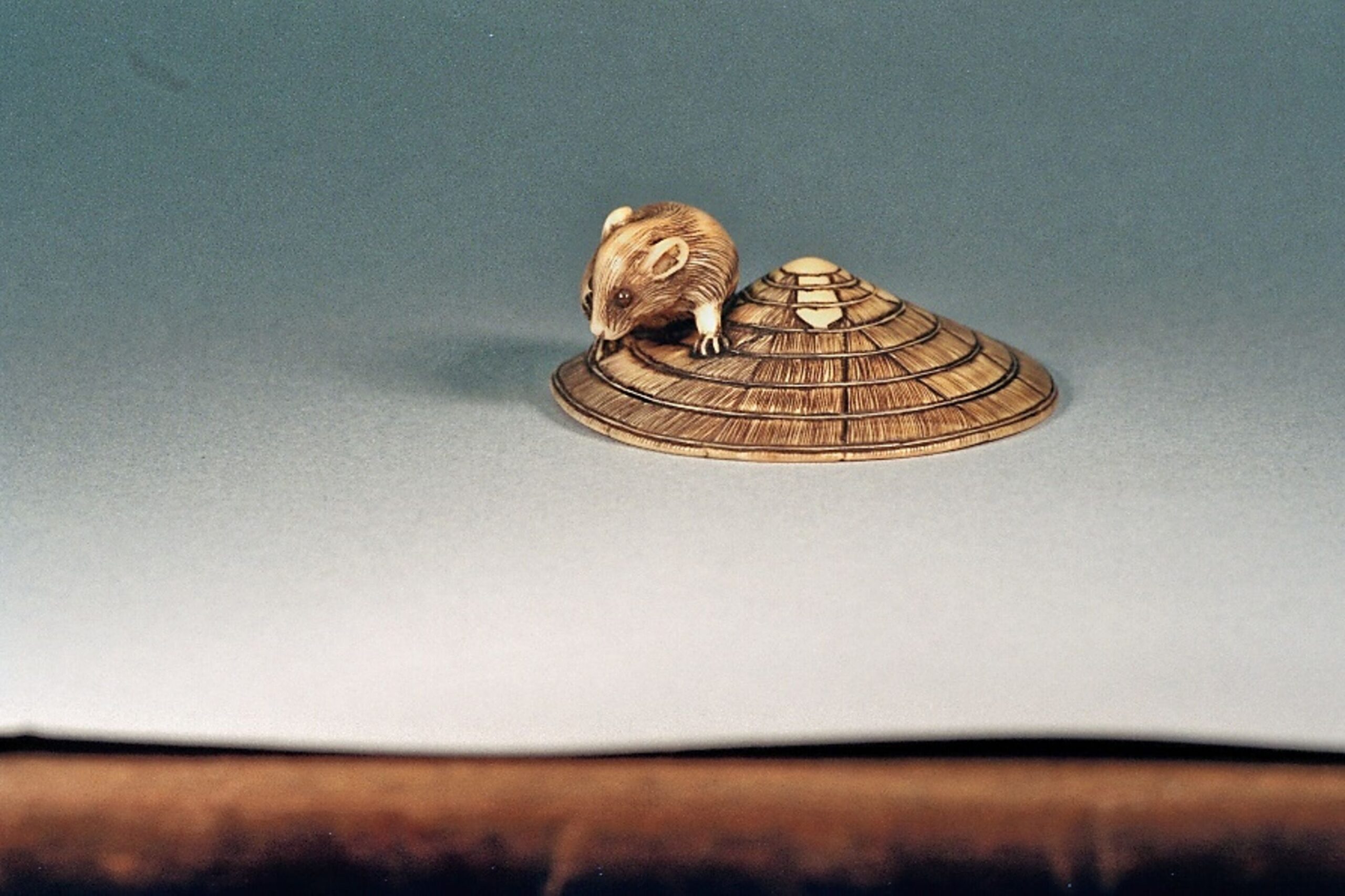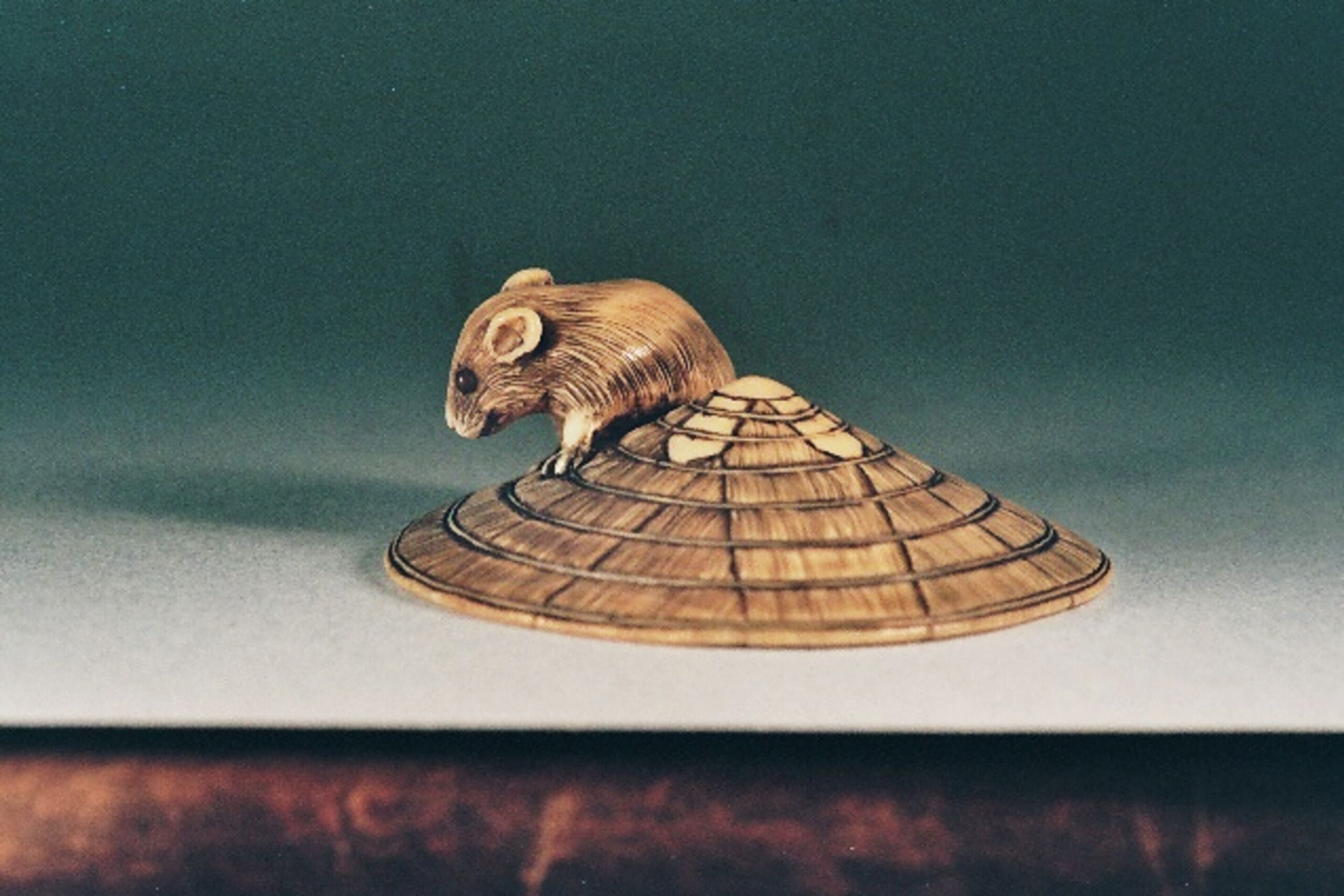 Elfenbein-Katabori. Die kleine Ratte steht auf dem Strohhut und putzt sich. Der Kopf ist nach rechts gewendet, die grossen Augen sind dunkel eingelegt. Der Strohhut ist in allen Details säuberlich gearbeitet, aussen sind die einzelnen Blätter gut zu unterscheiden, die ihn als Pilgerhut kennzeichnen. Er ist innen mit Stoff gefüttert. Die Himotoshi gehen durch den ledernen Ring, der auf dem Kopf der Trägerin oder des Trägers aufsitzt. Die Schnüre, mit denen der Hut unter dem Kinn befestigt werden kann, sind klar zu erkennen. Die Ränder und alle Details sind bis ins Letzte minutiös gearbeitet. Ein sehr schönes und liebenswürdiges Stück. Breite 43mm, Kyôto-Schule, Alter um 1800.