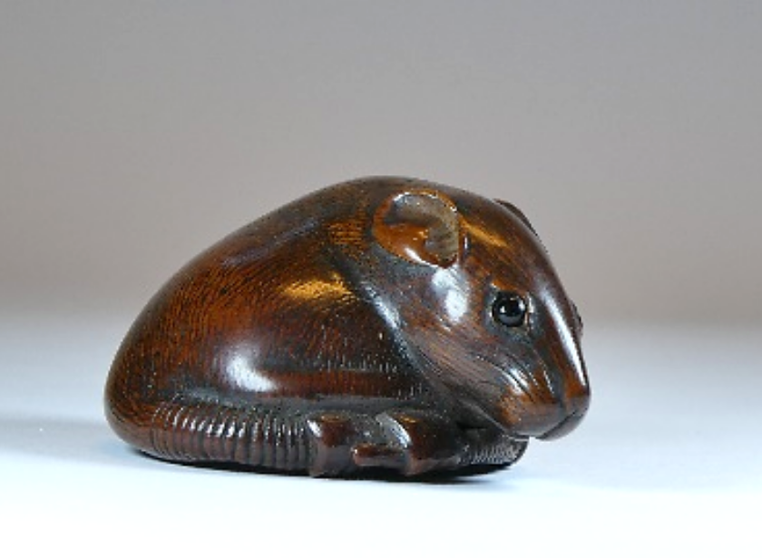 Holz-Katabori in dunklem braun. Das Nagetier, kompakt kauernd nach rechts, hält mit allen vier Pfoten seinen Schwanz, der unter ihm in einer kunstvollen S-Schlaufe gelegt und an drei Stellen vom Körper abgehoben gearbeitet ist! Die Augen sind in dunklem Horn eingelegt. Feine diskrete Fellzeichnung, die Ohren angelegt, schöne Glanzpatina, unterseitig in einer ovalen Ausnehmung die Signatur TOMOKAZU, , , K179, K141. Länge 43mm, Alter: frühes 19.Jh.