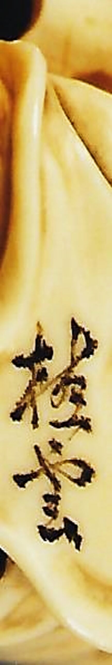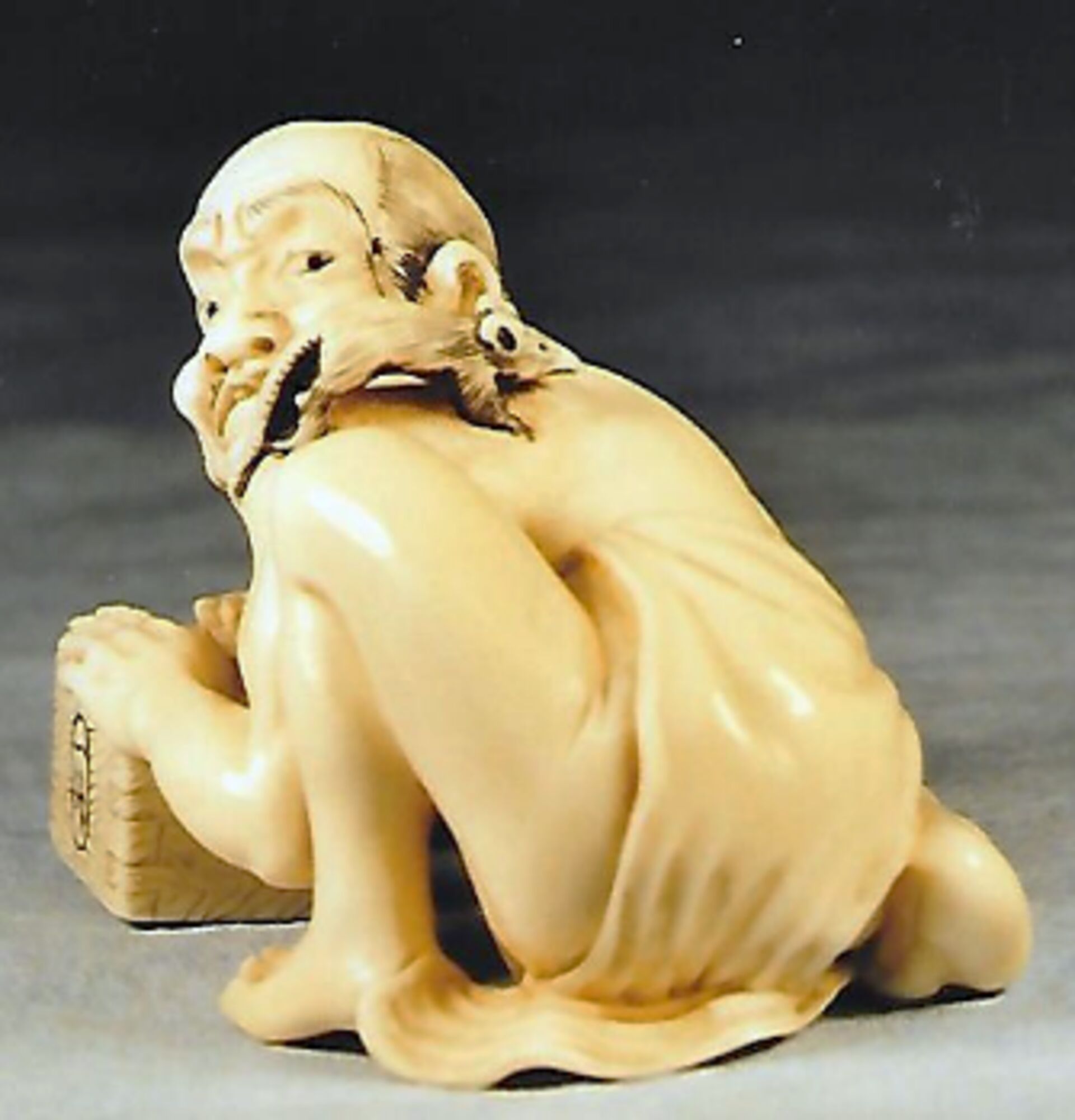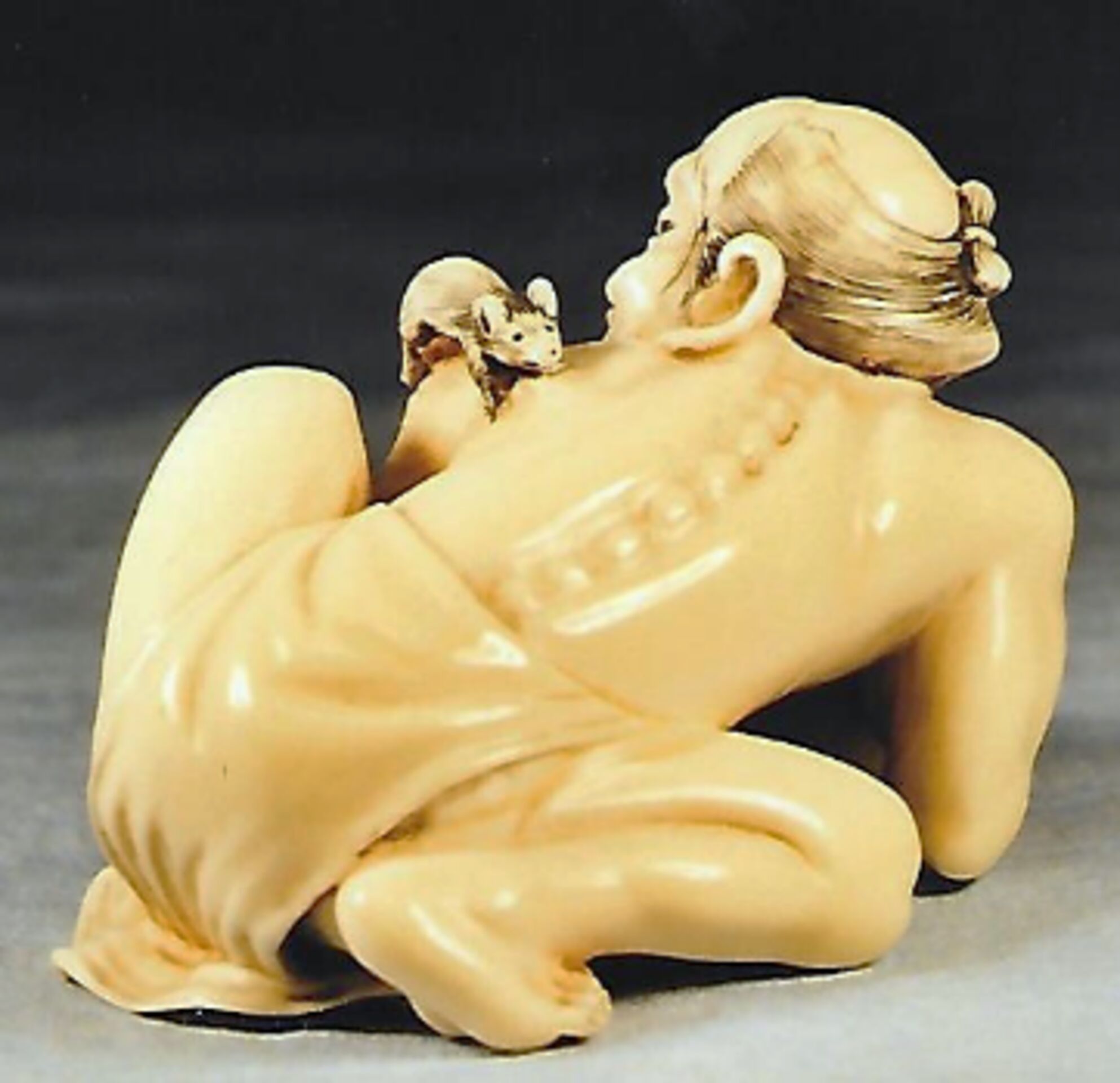 Die Ratte, Nezumi – „Wurzel-Bewohnerin” — ist das erste Tier des astrologischen Tierkreises, weil sie, als Buddha die Tiere zu sich rief, als erste bei ihm ankam. Sie ist ein Attribut des Glücksgottes Daikoku. — In der Chronik Nihongi (um 720) heisst es, wenn die Ratten wandern., müsse die Hauptstadt verlegt werden — was in alten Zeiten jedes mal beim Tod eines Herrschers geschah. — Sie sind eine Landplage, gleichzeitig wegen ihrer raschen Vermehrung und weil sie ausgesprochene Kulturfolger sind, „wo Ratten sind, ist Wohlstand”, Symbol des sich vermehrenden Reichtums und auch des Kindersegens. — Der Rattenfänger: im 19. Jh. gegen Ende der Tokugawa-Ära (bis 1868) und weiter in der Meiji-Zeit (1868-1912) wurde es üblich, Alltagsszenen, bürgerliche und handwerkliche Berufe kunsthandwerklich darzustellen. So wurde auch der Typus des Rattenfängers mit erstaunlich geringen Abwandlungen ein ziemlich stereotypes Motiv (siehe umseitig und auch Nr.133 dieser Sammlung). Der Rattenfänger wird häufiger in Holz abgebildet als in Elfenbein.