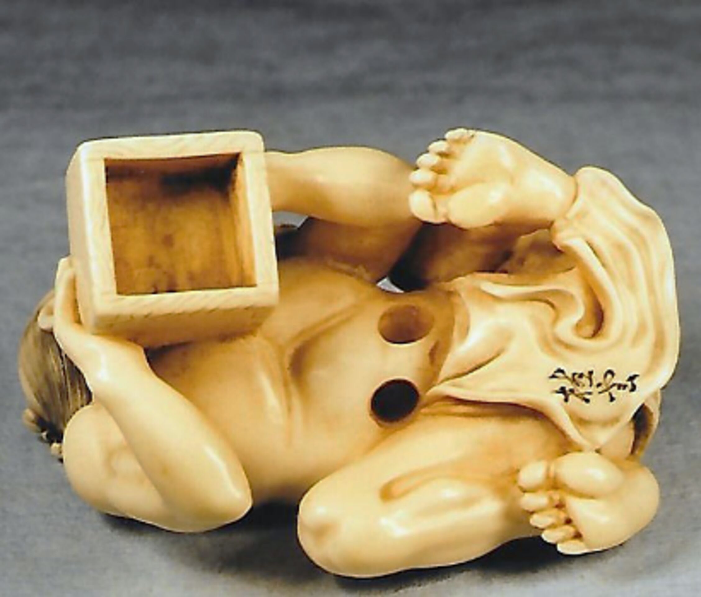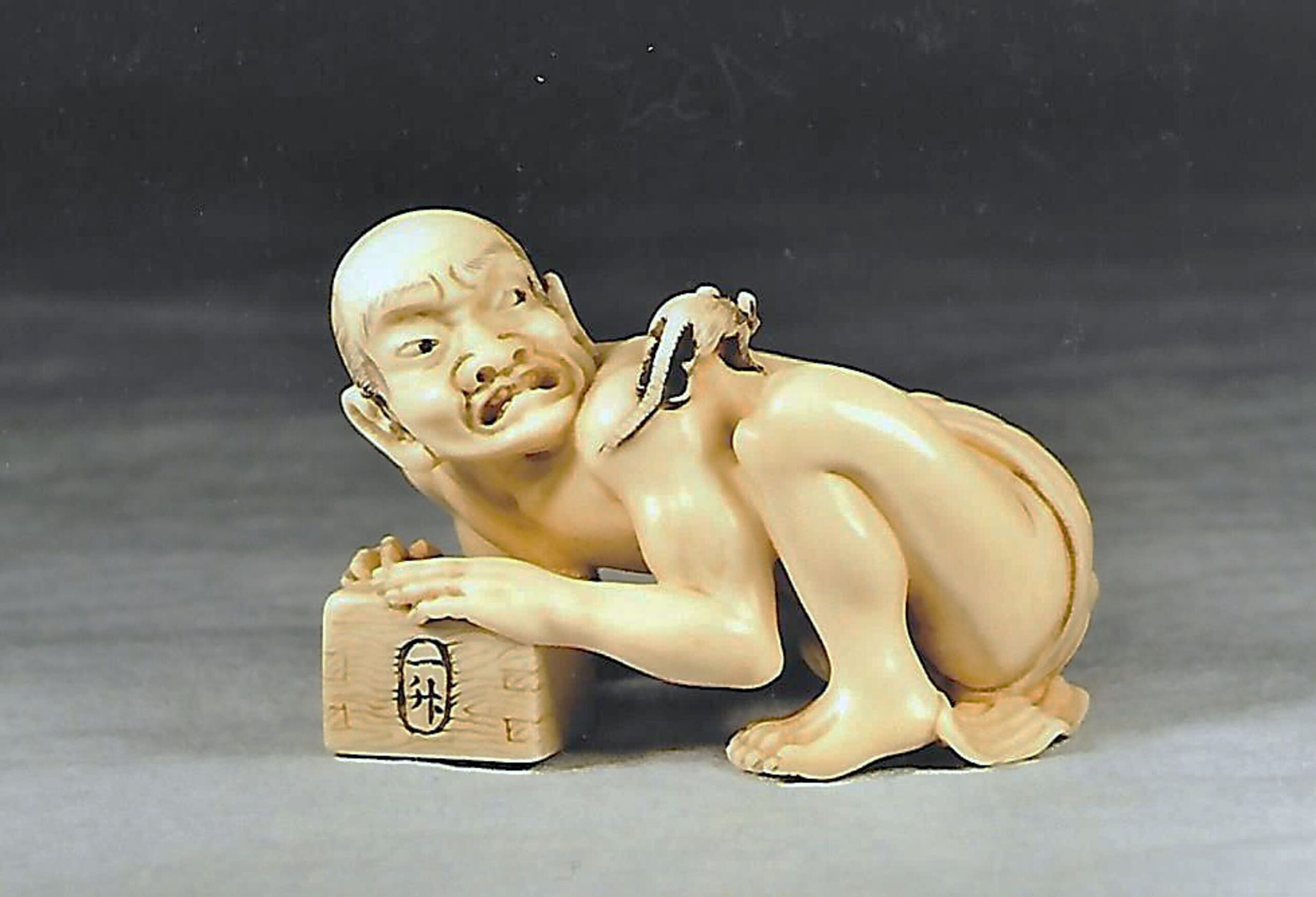 Elfenbein-Katabori. Der Rattenfänger, nackt bis auf ein Lendentuch, sitzt vorgeneigt, fast zusammengeklappt kauernd über einer Schachtel mit der Aufschrift „Masu” (es handelt sich um eine Messschachtel, um Bohnen zu dosieren), in welcher er die Ratte einschliessen wollte. Doch die Ratte entkommt eben über seine linke Schulter. Ihm bleibt nur, ihr überrascht, verärgert und fassungslos hinterher zu schauen. Realistische Momentaufnahme. 45mm lang. Zwei kleine Himotoshi unterseitig am Bauch des Mannes. Unterseitig an dem Lendentuch Fondoshi auch eine Signatur ?KYOKU UN. Alter, vermutlich 2, Hälfte 19.Jh.