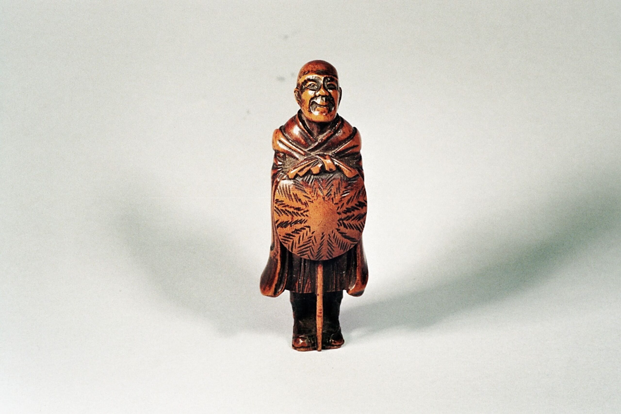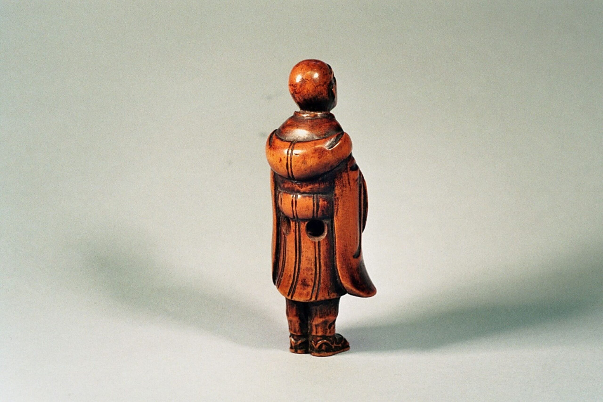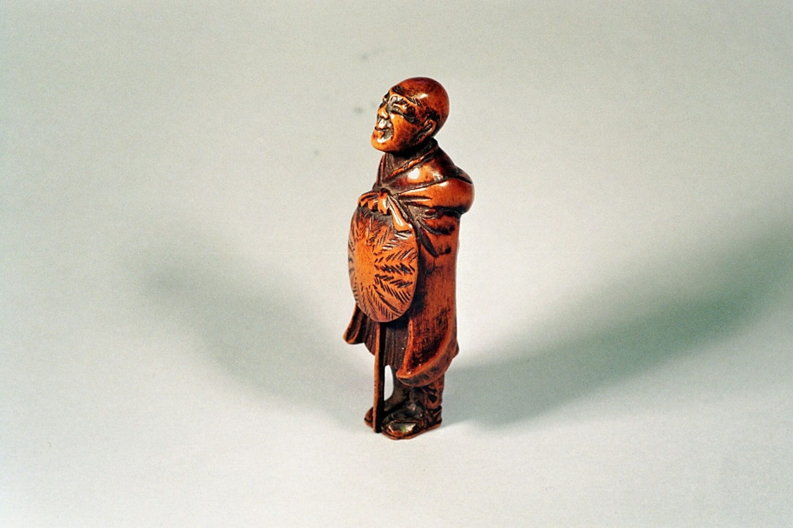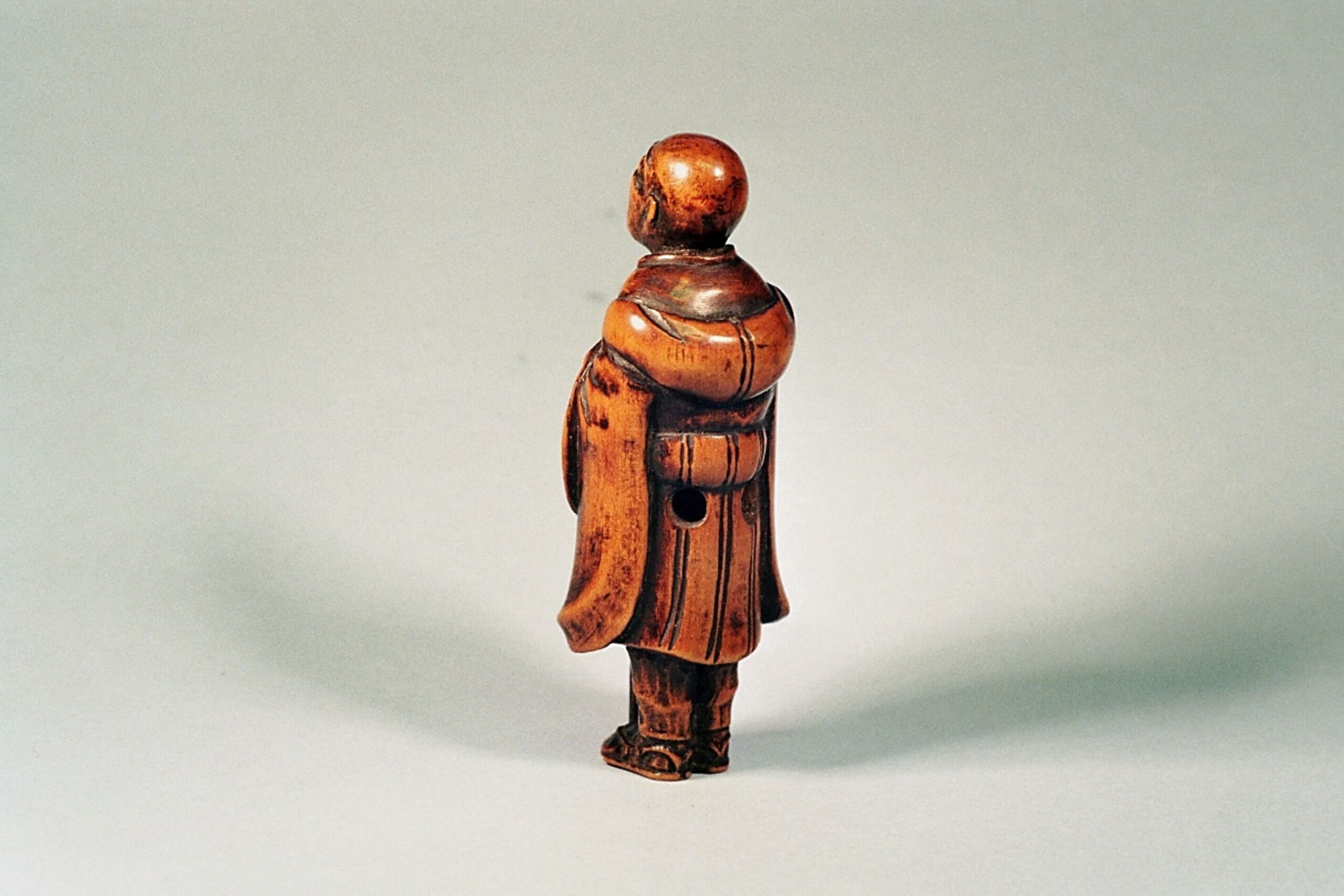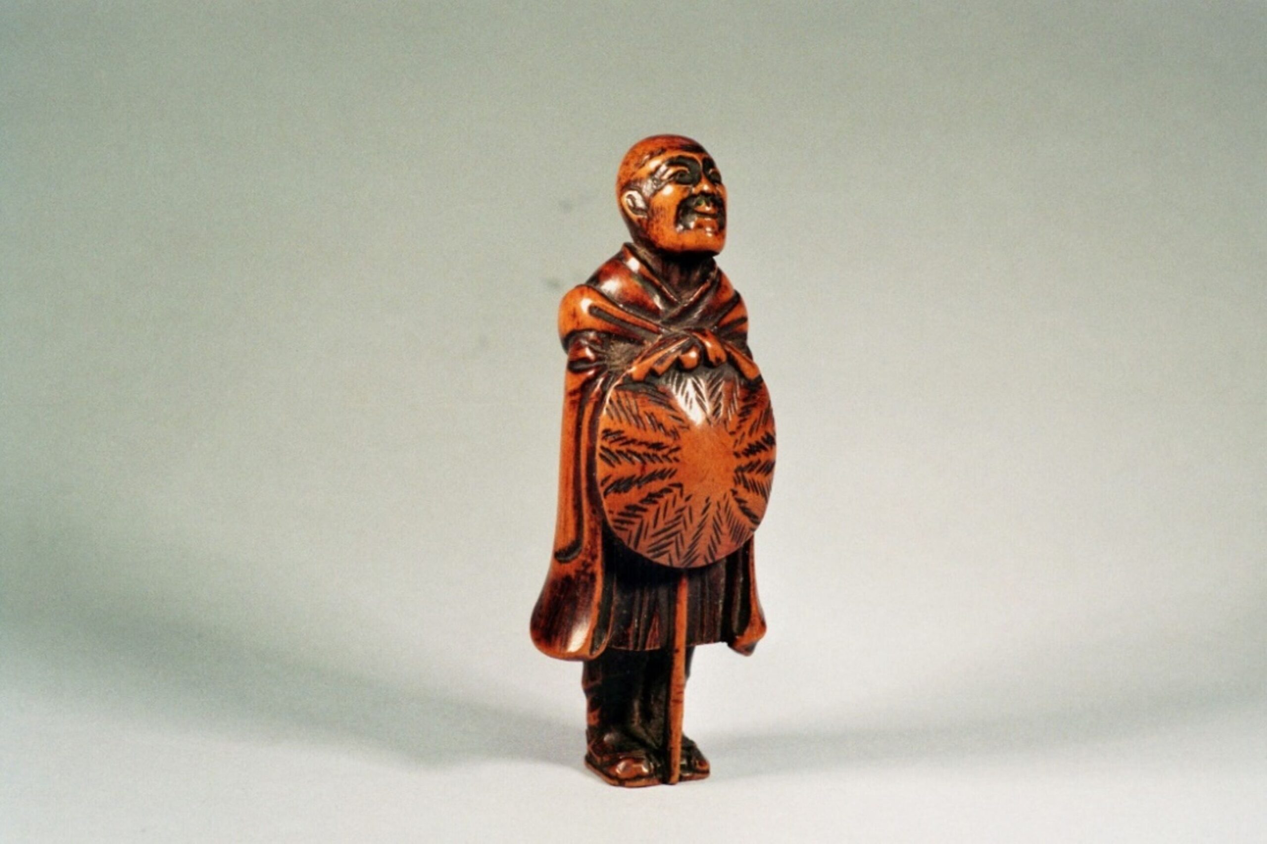 Holz-Katabori. Der Pilgersmann steht en face da und blickt froh ergriffen geradeaus. Die verdeckten Arme halten den Pilgerhut und den Wanderstab. Über Schultern und Rücken ist ein wulstförmiger Sack gebunden. Unter dem Mantel trägt der Mann lange Hosen und an den Füssen Sandalen. Es handelt sich um den Wandermönch Saigyô Hôshi, staunend ergriffen angesichts des heiligen Bergs Fuji. – Gut gebohrte Himotoshi im Rücken, schöne Glanzpatina, nicht signiert. Höhe 64mm. Alter ca. Mitte 19.Jh.