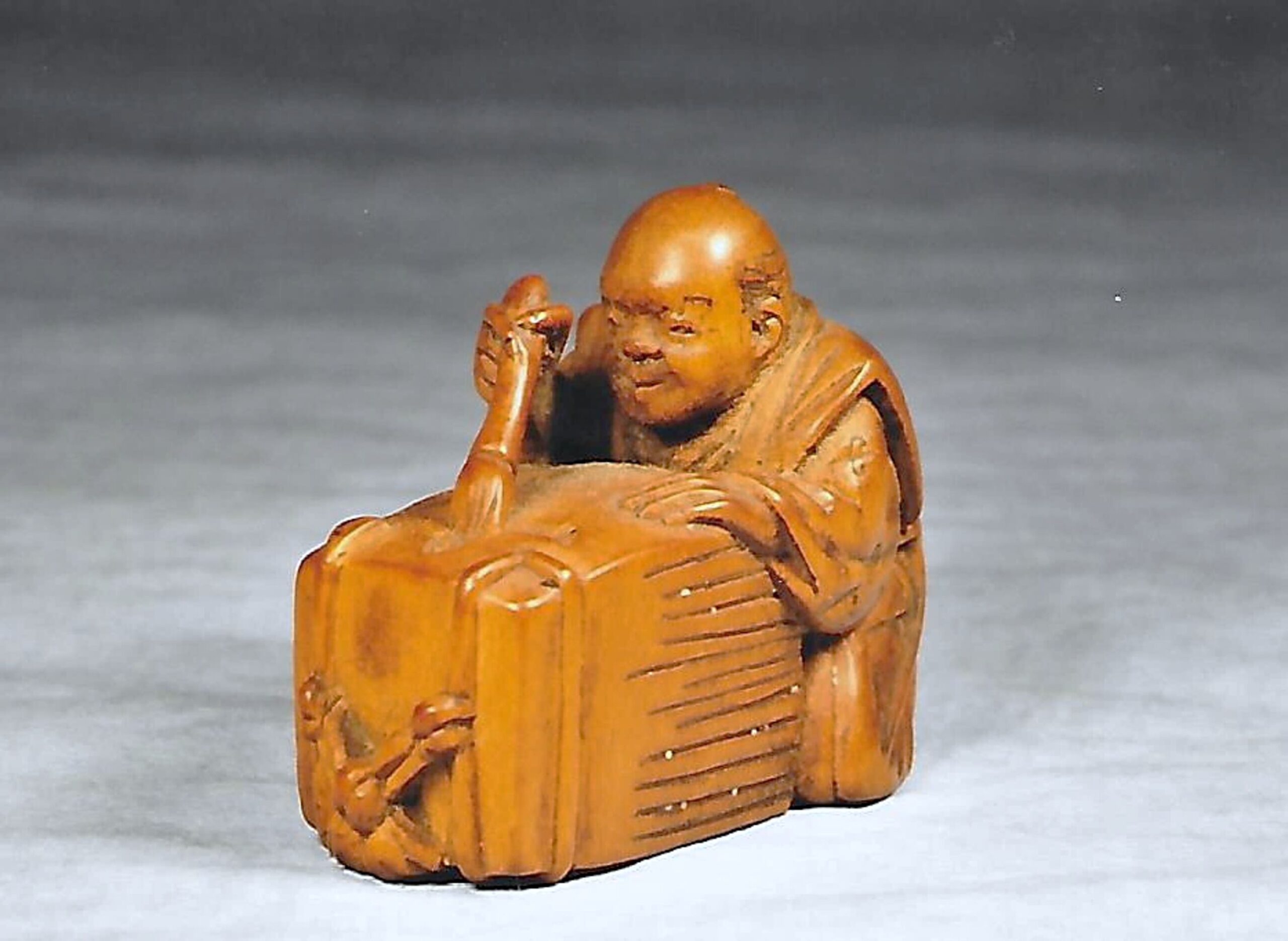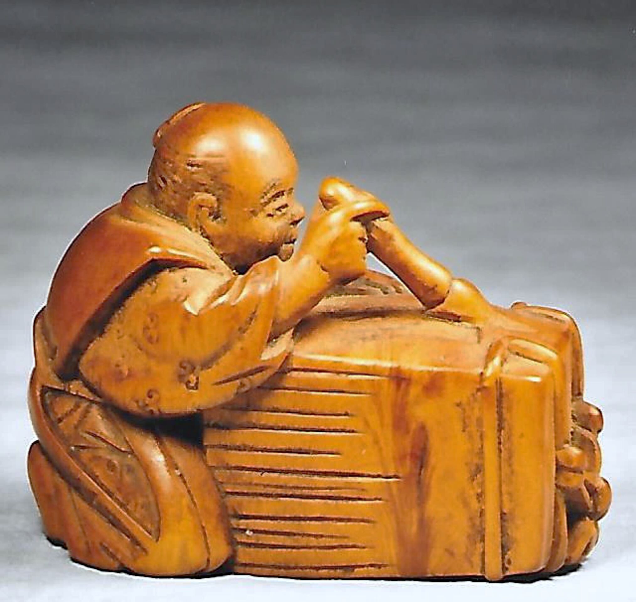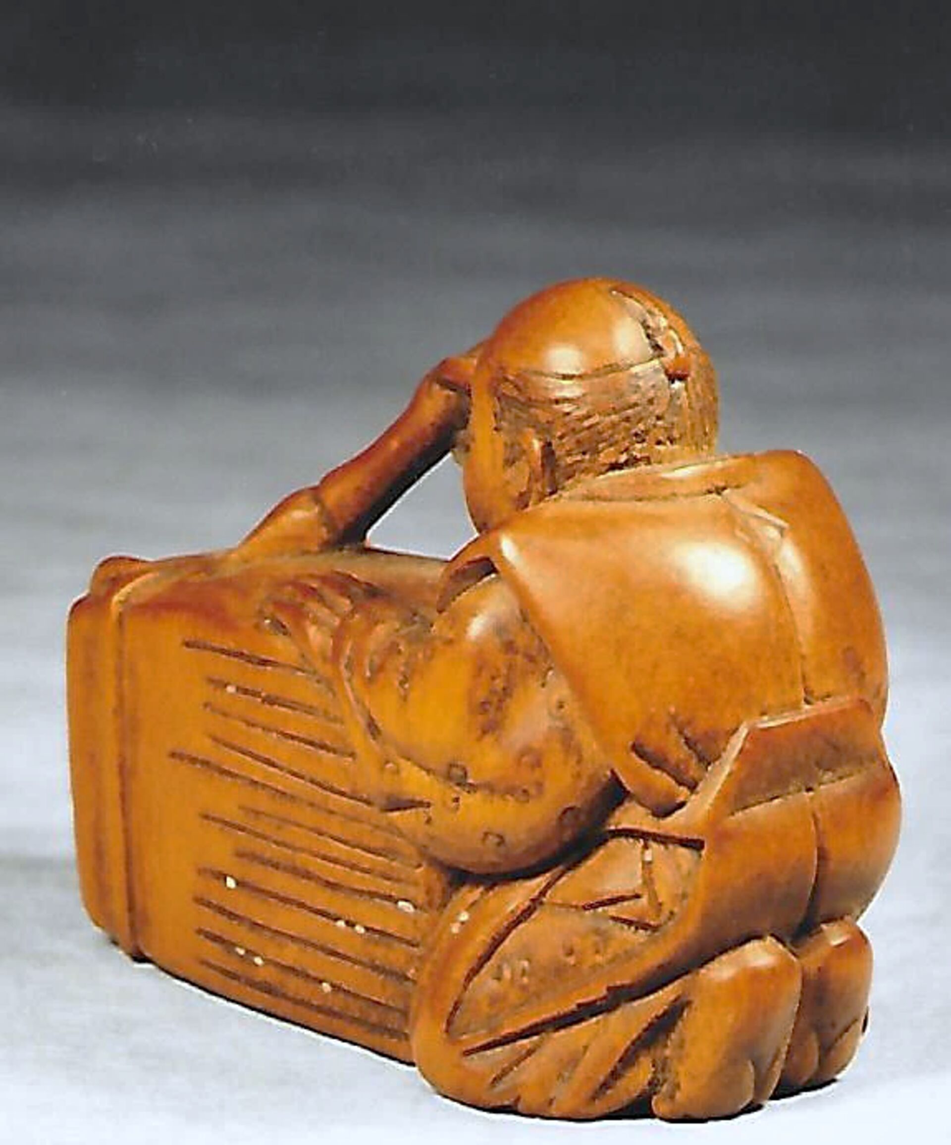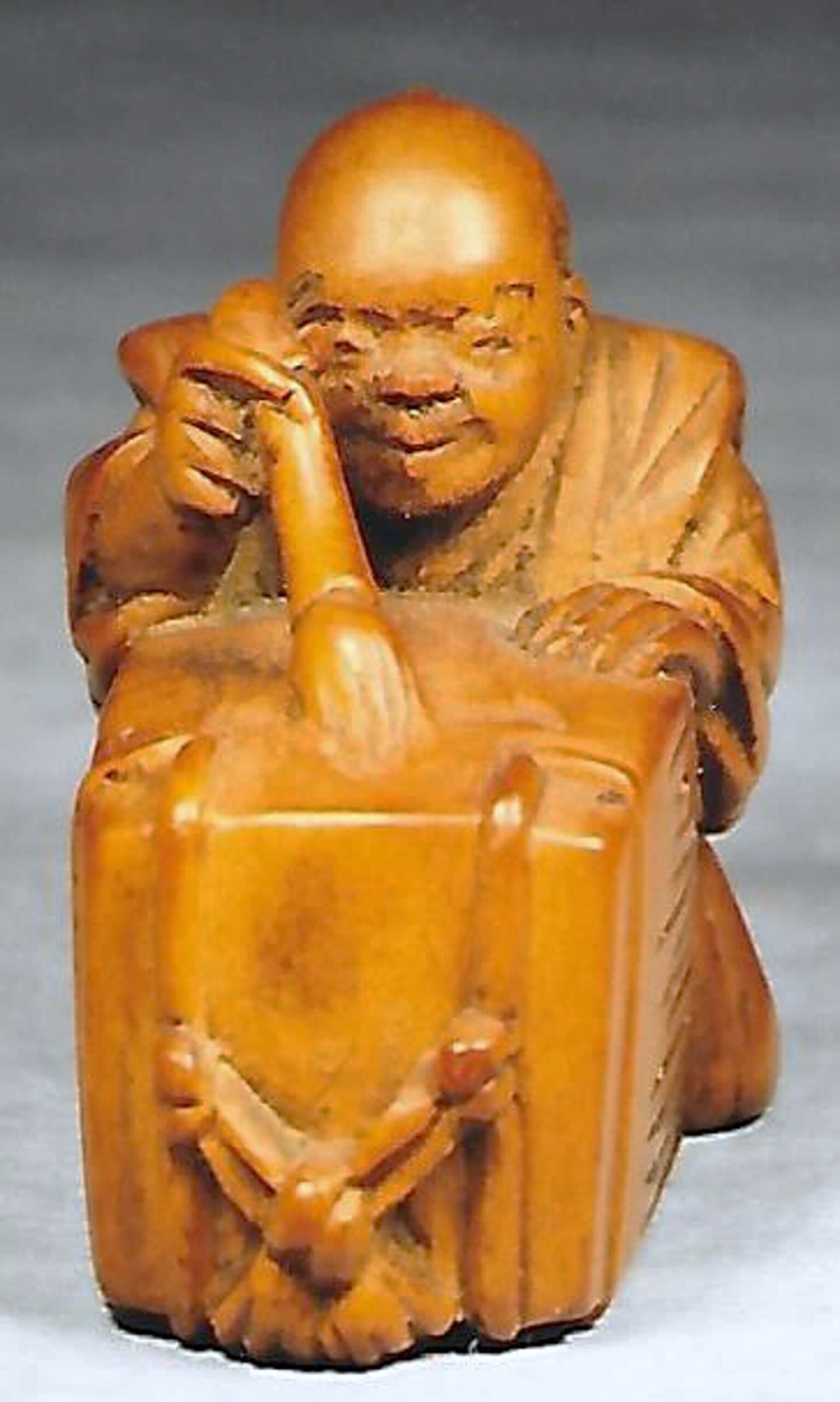 Holz-Katabori. Ein Samurai, erkenntlich an dem Zeremonialgewand Kamishimo, kniet und bemalt liebenswürdig lächelnd mit einem grossen Pinsel eine liegende Laterne. Unter dem Kamishimo trägt der Mann einen dekorierten Kimono. – Vermutlich Buchsbaum, wobei eine astnahe Struktur dem Stück einen besonderen farblichen Reiz verleiht. Länge 40mm. Unterseitig zwei ungleich grosse, gut gebohrte Himotoshi und eine wohl nachträglich hinzugefügte zarte Signatur RYÛMIN (K198, K194). Alter vermutlich 2.H. 19. Jh.